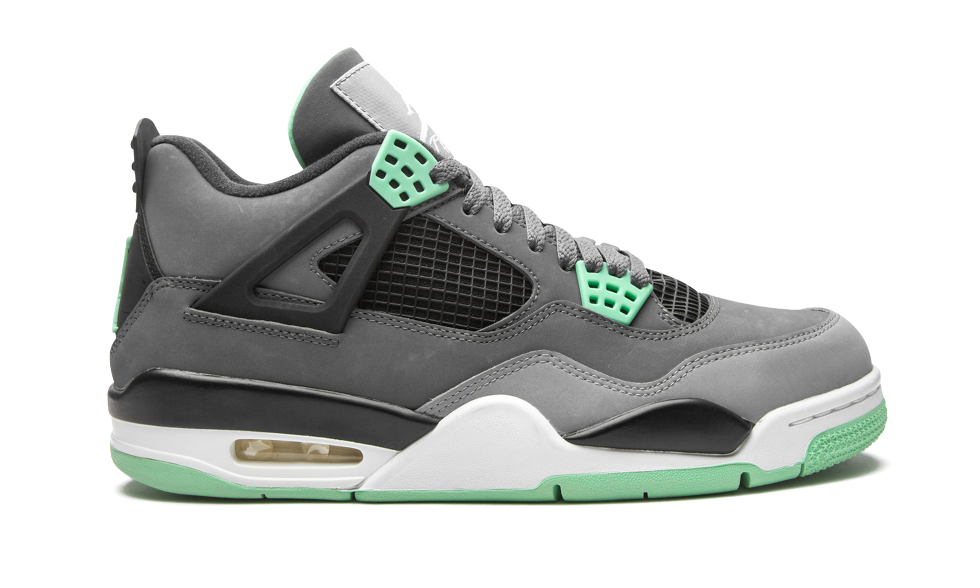 One of the more popular non-OG Air Jordan 4 colorways ever. in 2013 the iconic silhouette was given this “Green Glowâ€?edition featuring a nubuck upper in two shades of grey with black and bright green accents.
