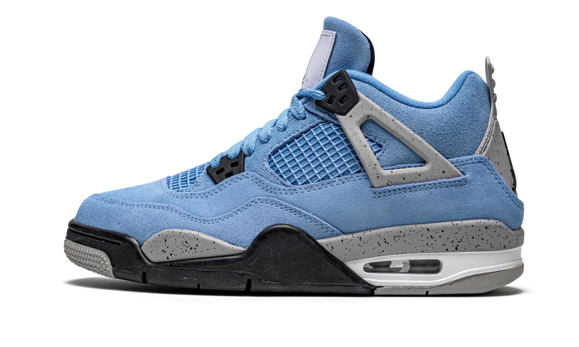 The Air Jordan 4 GS “University Blueâ€?is the youth sizing of the colorway of Michael Jordan's legendary fourth signature shoe that salutes the UNC Tar Heels. While it's hard to believe. the “University Blueâ€?is the first-ever Jordan 4 to employ the popular “UNCâ€?theme. The look. dedicated to Michael Jordan's alma mater. first appeared on the original Air Jordan 1 in 1985 and was brought back on the original Air Jordan 9 in 1994. Since then. the “UNCâ€?colorway has graced models like the Women's Jordan 1 Mid and the Jordan 3. Here. Jordan Brand adds several athletic inspired touches to the look. including adding a “removableâ€?name tag to the nylon Jumpman branding on the suede tongue. The design references the product tag found on the bottom of basketball jerseys. A plush University Blue suede material forms the base of the upper and tonal mesh netting appears on the tongue and mid-panel. Black plastic lace holders are located on the throat and collar and the plastic “Wingsâ€?tabs are given a classic “Cementâ€?finish. Further. the “Cementâ€?detailing also appears on the back of the shoe with black Jumpman branding and on the mudguard. Release date: April 28. 2021.