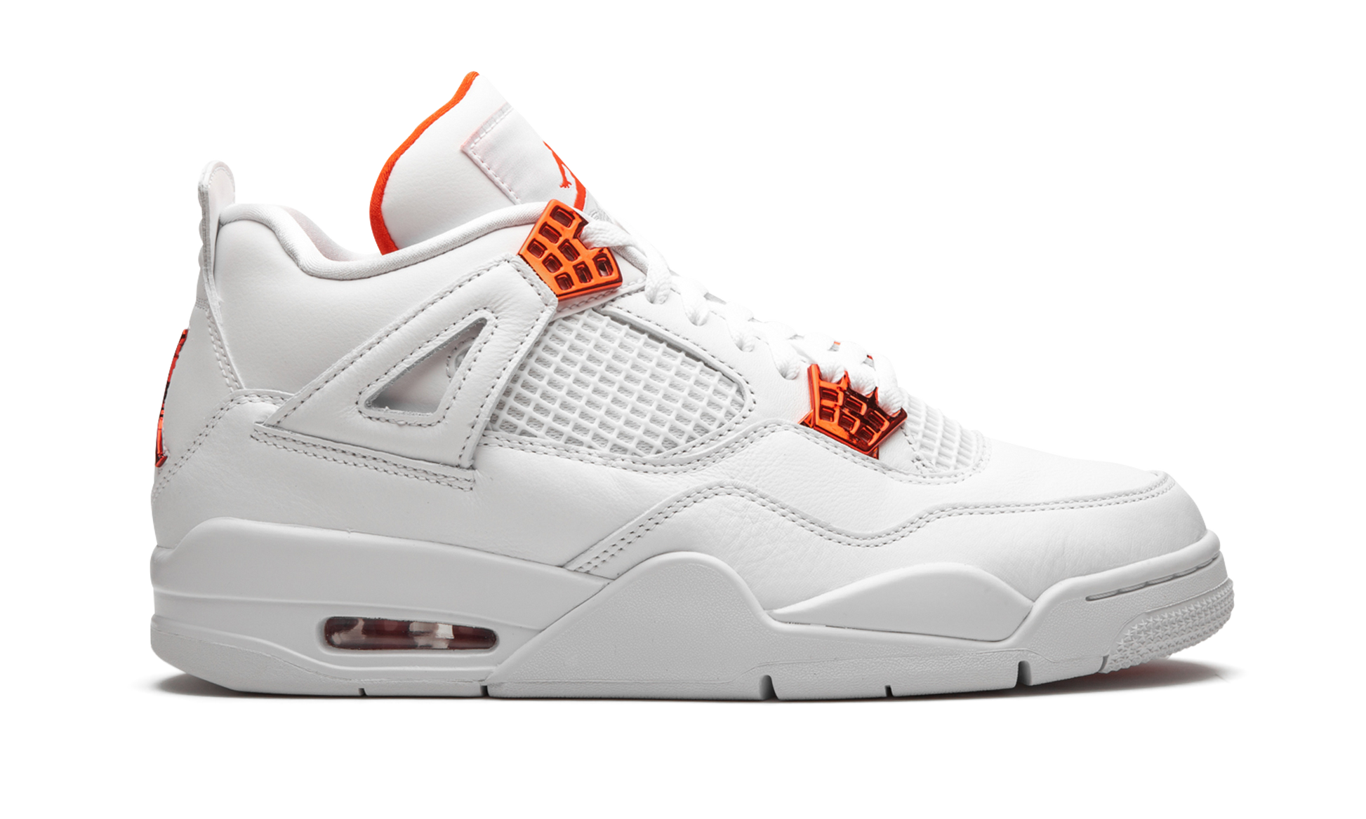 The Air Jordan 4 “Metallic Pack - Orangeâ€?is part of Jordan Brand's 2020 collection of “Metallicâ€?colorways inspired by an original design from the 1980s. One of several “Metallic Packâ€?Jordan 4s. this “Orangeâ€?design is reminiscent of the Air Jordan 1 of the same nickname from 1985. which was an original makeup of Michael Jordan's first signature shoe. The two-toned appearance features a white leather upper with tonal netting on the mid-panel and throat. Metallic Orange hits on the lace eyelets and Jumpman detailing on the heel provide a stark contrast to the neutral base. Additional orange Jumpman branding can be found on the nylon tongue tab. The hue also appears on the inner lining of the tongue. The classic Air Jordan 4 appearance of this “Metallic Orangeâ€?design includes a small visible Air window in the heel. Release date: May 20. 2020.