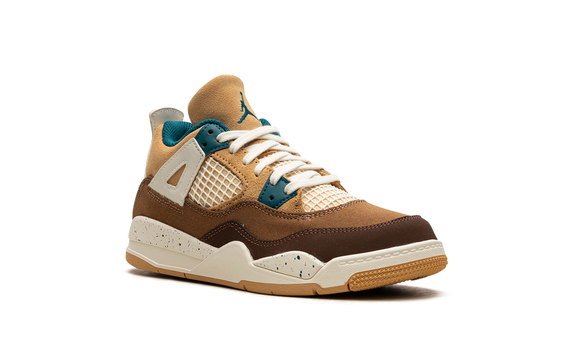 The Air Jordan 4 Retro PS "Seasonal Collector" is the preschool sizing of the colorway inspired by children playing outside and the great outdoors. The “Seasonal Collectorâ€?features an array of materials and neutral colors on its design. with shades of brown and tan appearing on the upper. White netting is seen on the tongue and on the mid-panel. Geode Teal accenting can be found on the eyelets. as well as on the speckling seen on the white laces. the Jumpman on the tongue and on the heel. and the inner lining. Underfoot. the shoe's white midsole features blue speckling.