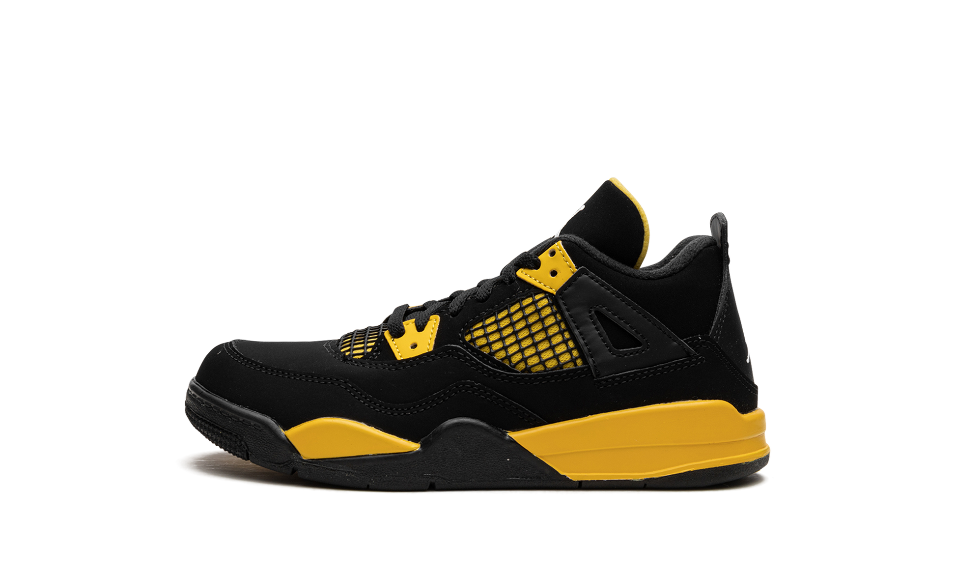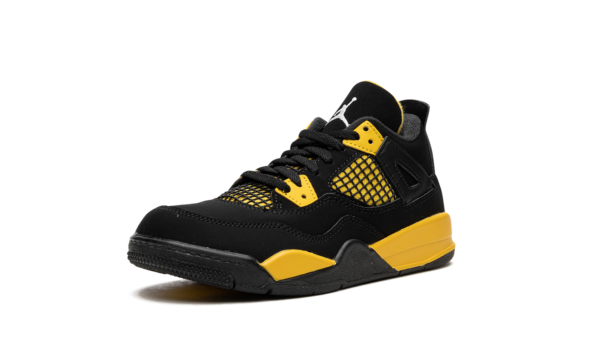 The Air Jordan 4 PS “Thunderâ€?is the youth sizing of the modern re-release of the popular. non-original colorway of the vintage basketball shoe from 2006's “Thunder & Lightningâ€?collection. Released with the Jordan 4 “Lightningâ€?in super limited quantities on Jordan Brand's former Jumpman23.com website back in the day. the “Thunderâ€?was re-released in 2012 before it received another highly anticipated release in 2023. As for its design. the black-and-yellow shoe features a black synthetic nubuck base with Tour Yellow detailing beneath the mesh on the sides and tongue. Yellow lace holders contrast the black upper. A white Jumpman appears on the heel and on the tongue. Release date: May 13. 2023