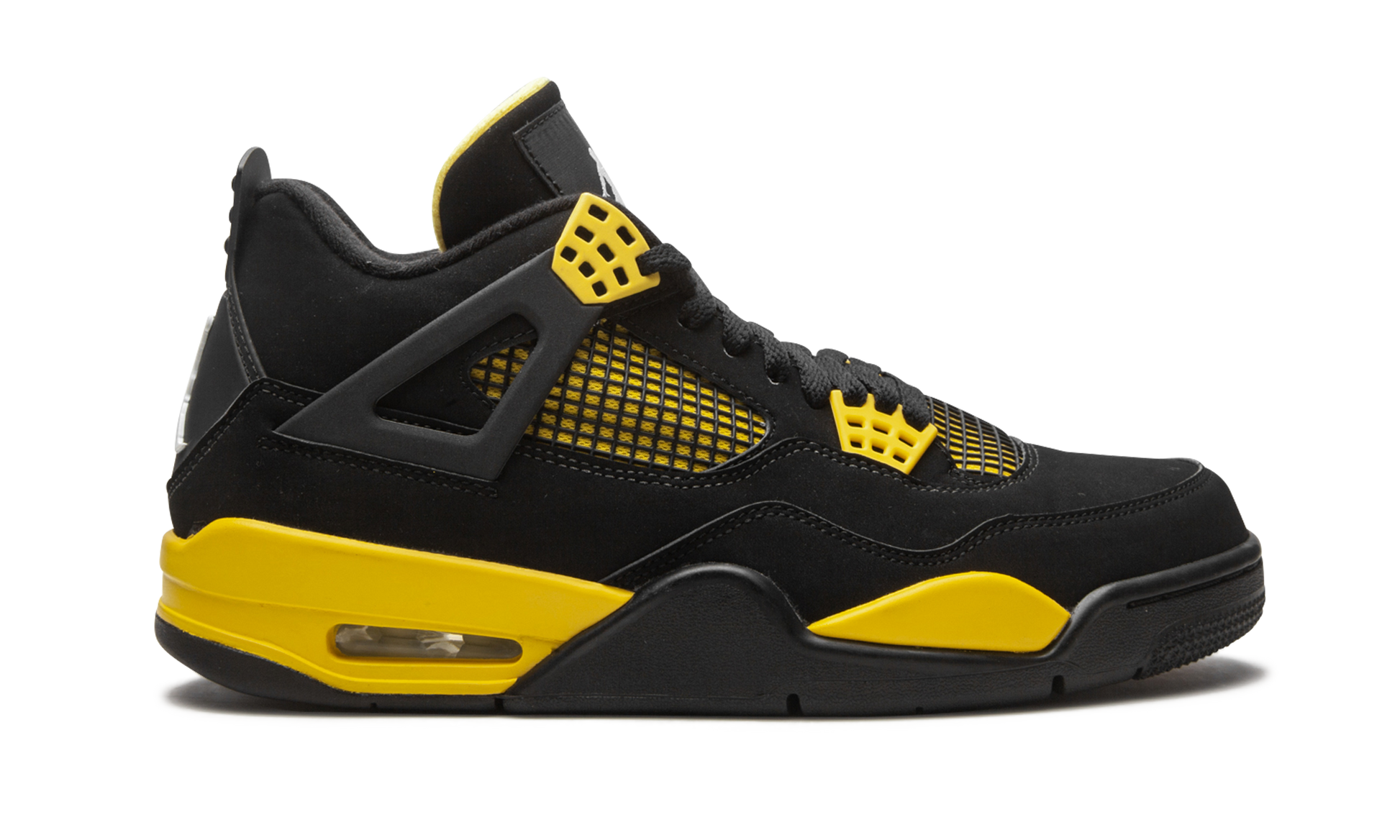 Originally released in 2006. the popular “Thunderâ€?colorway of the Air Jordan 4 was back in 2012 for a refresh. Reversing its accompanying “Lightningâ€?colorway. the shoe features a black upper with Tour Yellow accents.