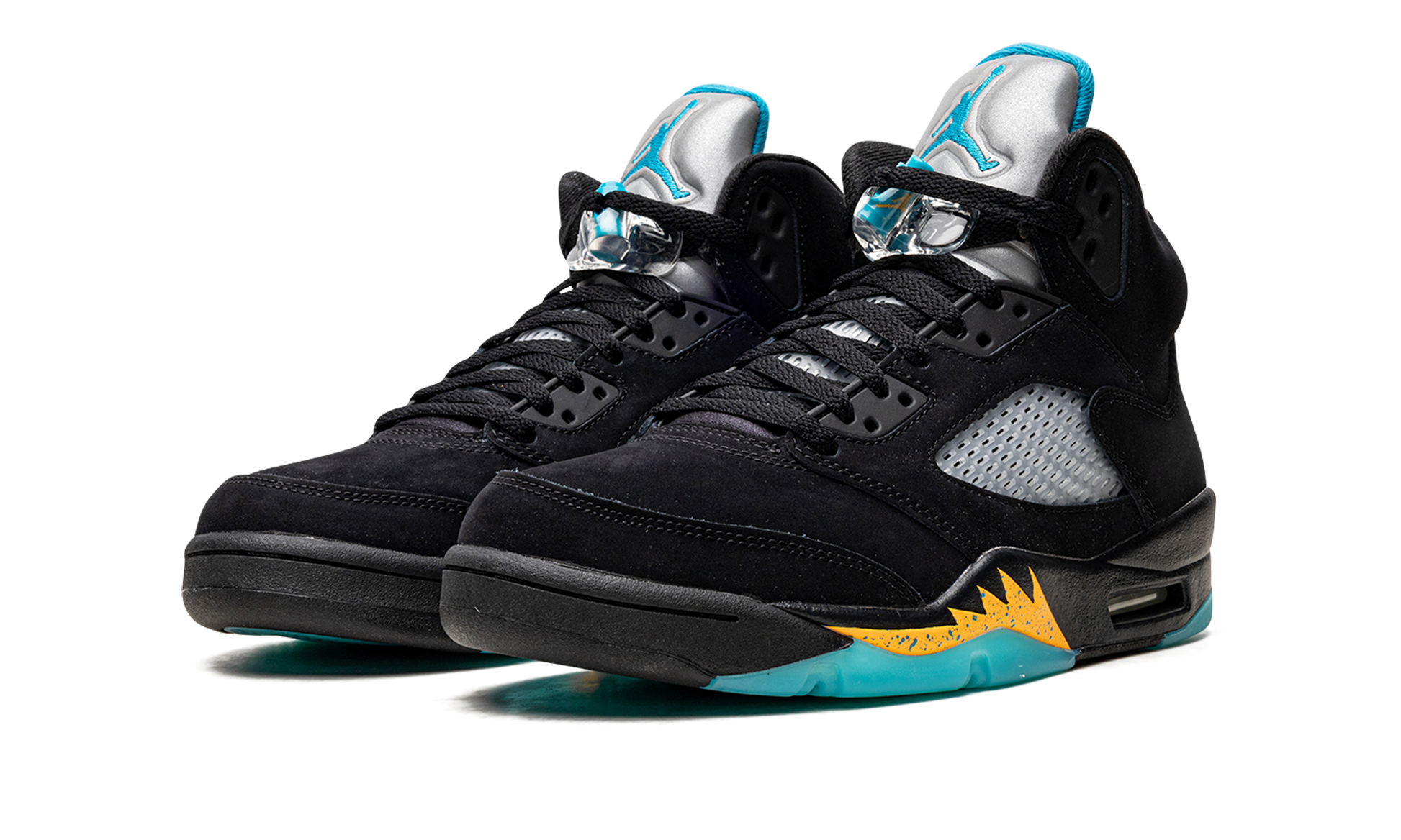 The Air Jordan 5 “Aquaâ€?is a colorway of Michael Jordan's fifth signature shoe in a look loosely inspired by a Player Exclusive of the shoe for Chris Paul in his time with the New Orleans Hornets. The “Aquaâ€?features a black synthetic nubuck construction with translucent netting on the sides and tongue. An Aqua-colored Jumpman is embroidered on the Metallic Silver reflective tongue and on the heel. Additional Aqua accenting can be found on the Jumpman on the lace toggle. on the inner lining. and on the shark tooth detailing on the midsole. The design replicates Paul's never released colorway of the shoe. sans his number â€?â€?embroidered on each heel. Release date: April 8. 2023