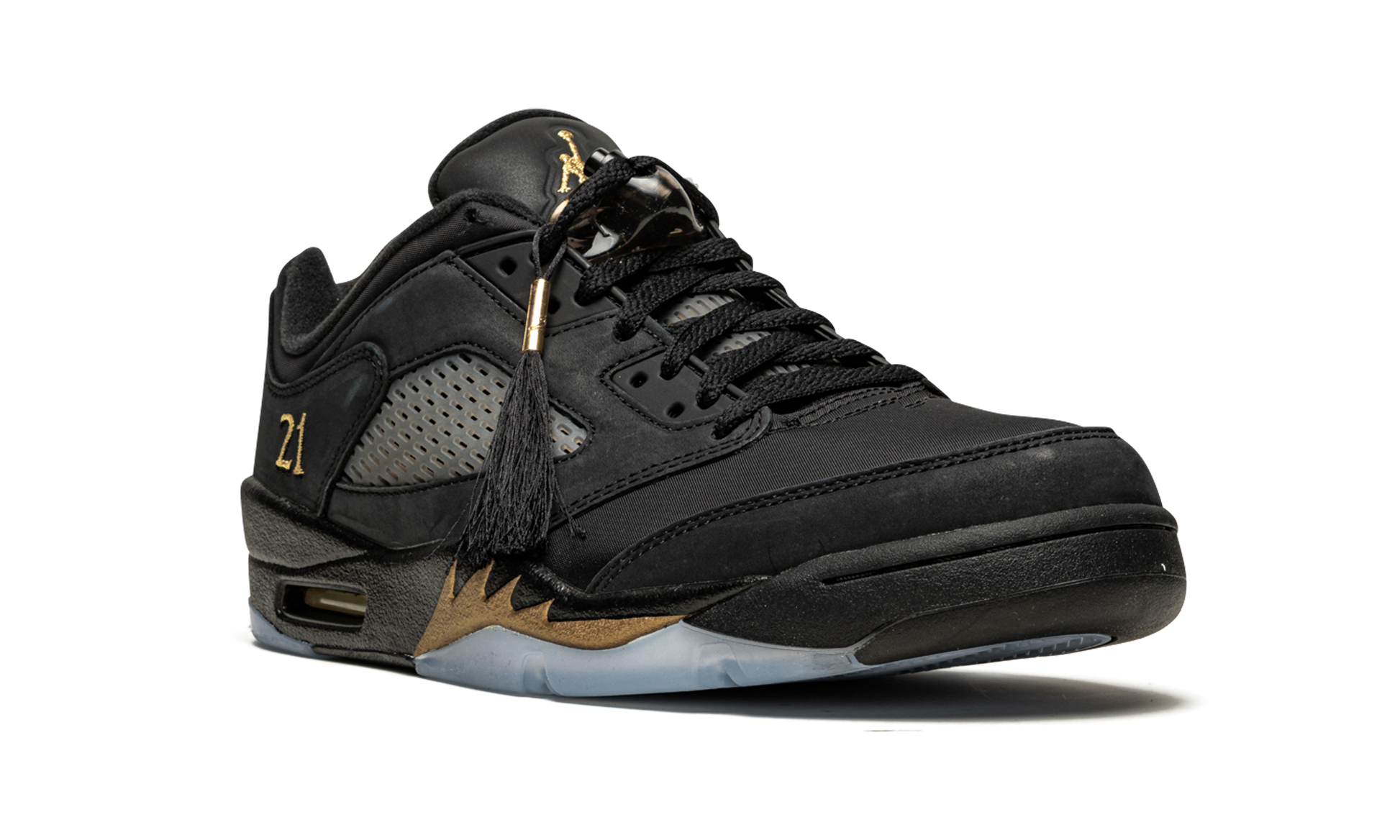 The Air Jordan 5 Low “Class of 2021â€?is a special makeup of Michael Jordan's fifth signature shoe that celebrates the 2021 graduating class of Jordan Brand's Wings Scholarship Program. Intentionally minimal in design. the “Class of 2021â€?mimics a cap-and-gown outfit with a predominantly black color scheme. The upper is dressed in all black with a nylon textile base at the toe and heel and nubuck overlays through the midfoot. The gold embroidered â€?0â€?and â€?1â€?logos found on the lateral sides of the left and right shoe. respectively. are in reference to the 2021 graduating class. A gold Jumpman can be found on the black neoprene tongue and a black Jumpman on the heel. The slogans “Class of '21â€?and “Jordan Wingsâ€?appear in gold text on the underside of the tongues on the left and right shoe. respectively. Metallic gold “shark toothâ€?detailing contrasts the black painted midsole. A mini tassel is added to the shoelace of the right shoe to further the graduation theme. An icy blue translucent outsole with a feather graphic visible underneath completes the look. Release date: May 14. 2021.