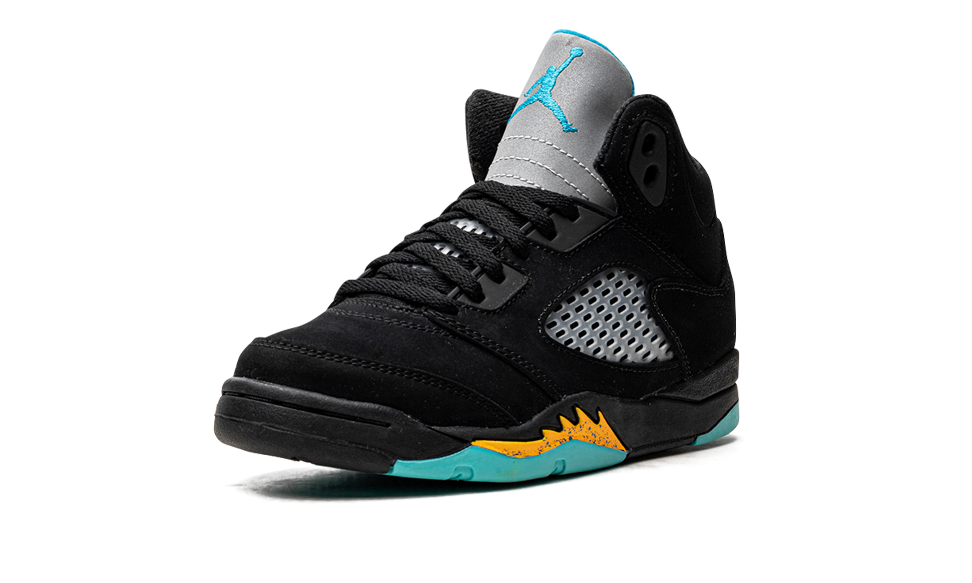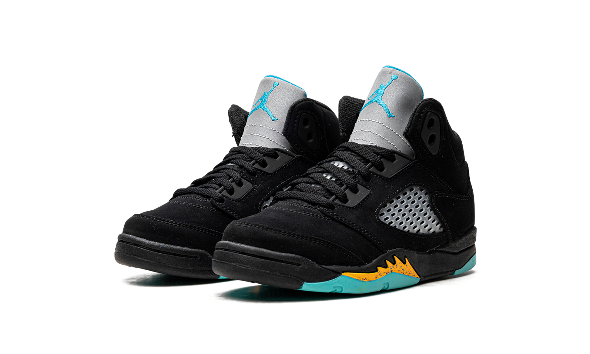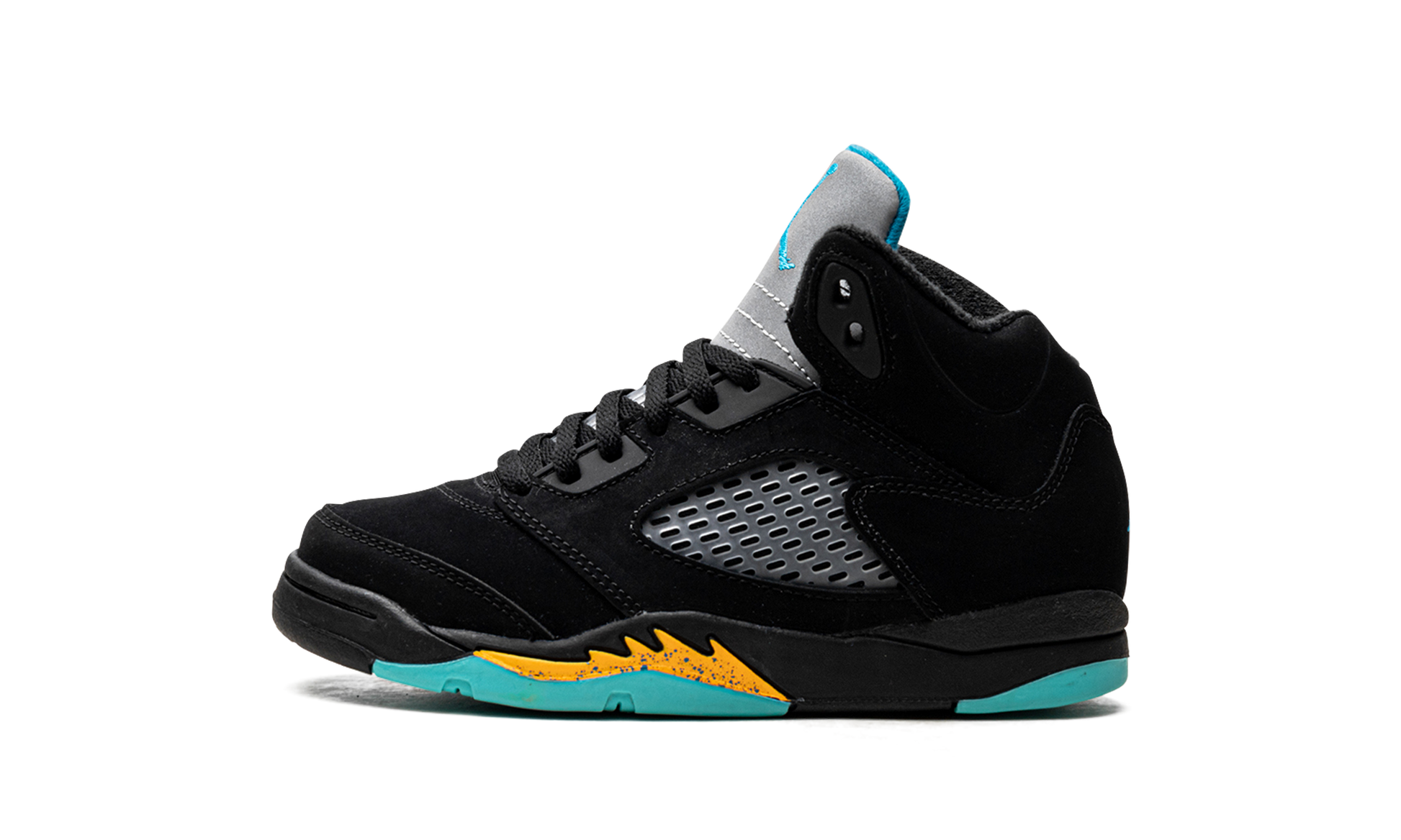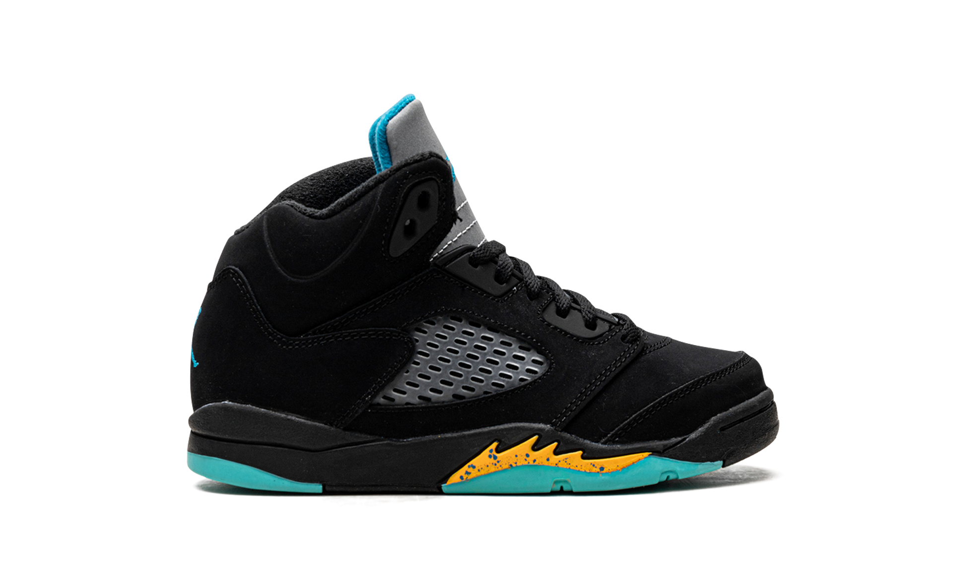 The Air Jordan 5 PS “Aquaâ€?is the preschool sizing of the colorway of the retro basketball shoe in a look loosely inspired by a Player Exclusive of the shoe for Chris Paul in his time with the New Orleans Hornets. The “Aquaâ€?is complete with a black synthetic nubuck construction with translucent netting on the sides and tongue. An Aqua-colored Jumpman is embroidered on the Metallic Silver reflective tongue and on the heel. Additional Aqua accenting can be found on the Jumpman on the lace toggle. on the inner lining. and on the shark tooth detailing on the midsole. Release date: April 8. 2023