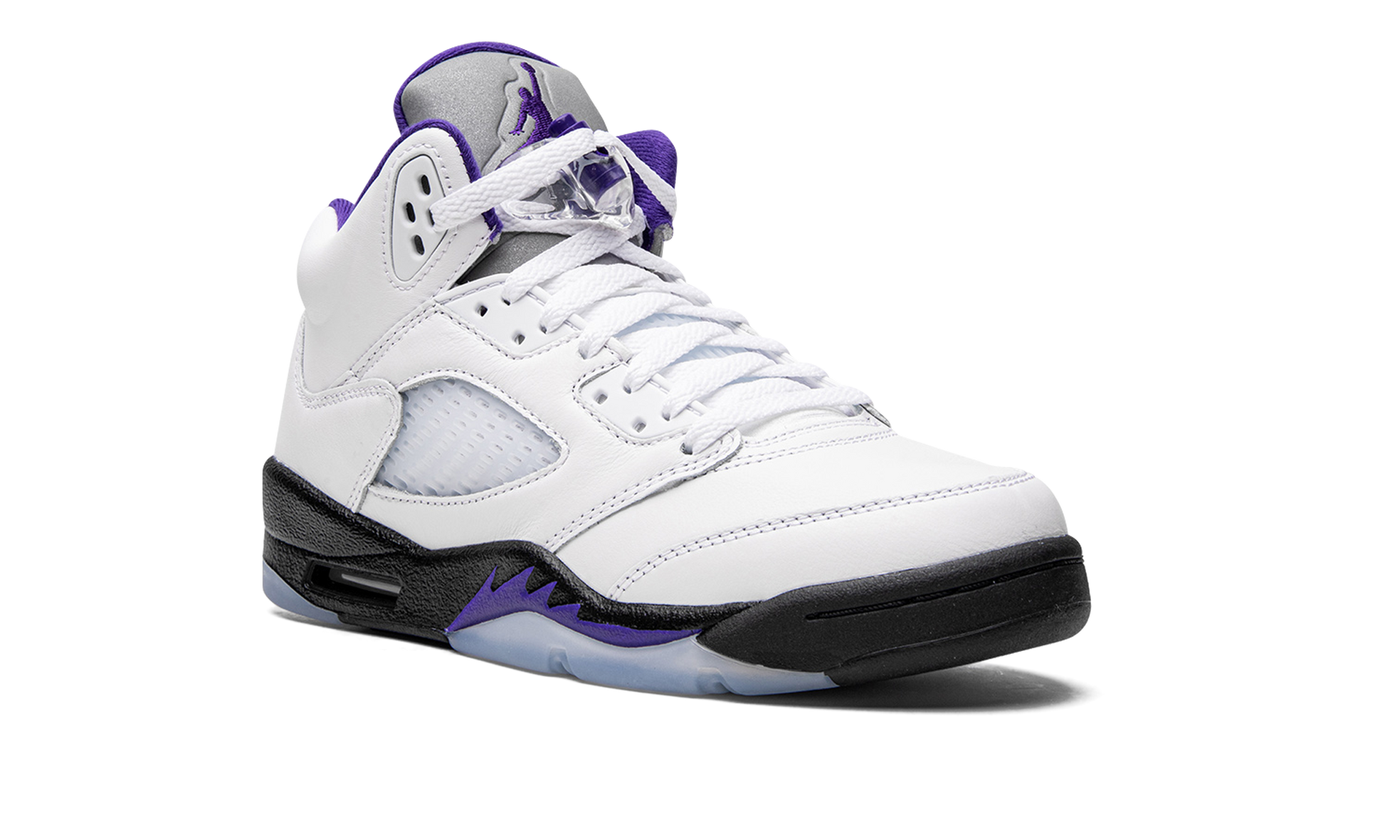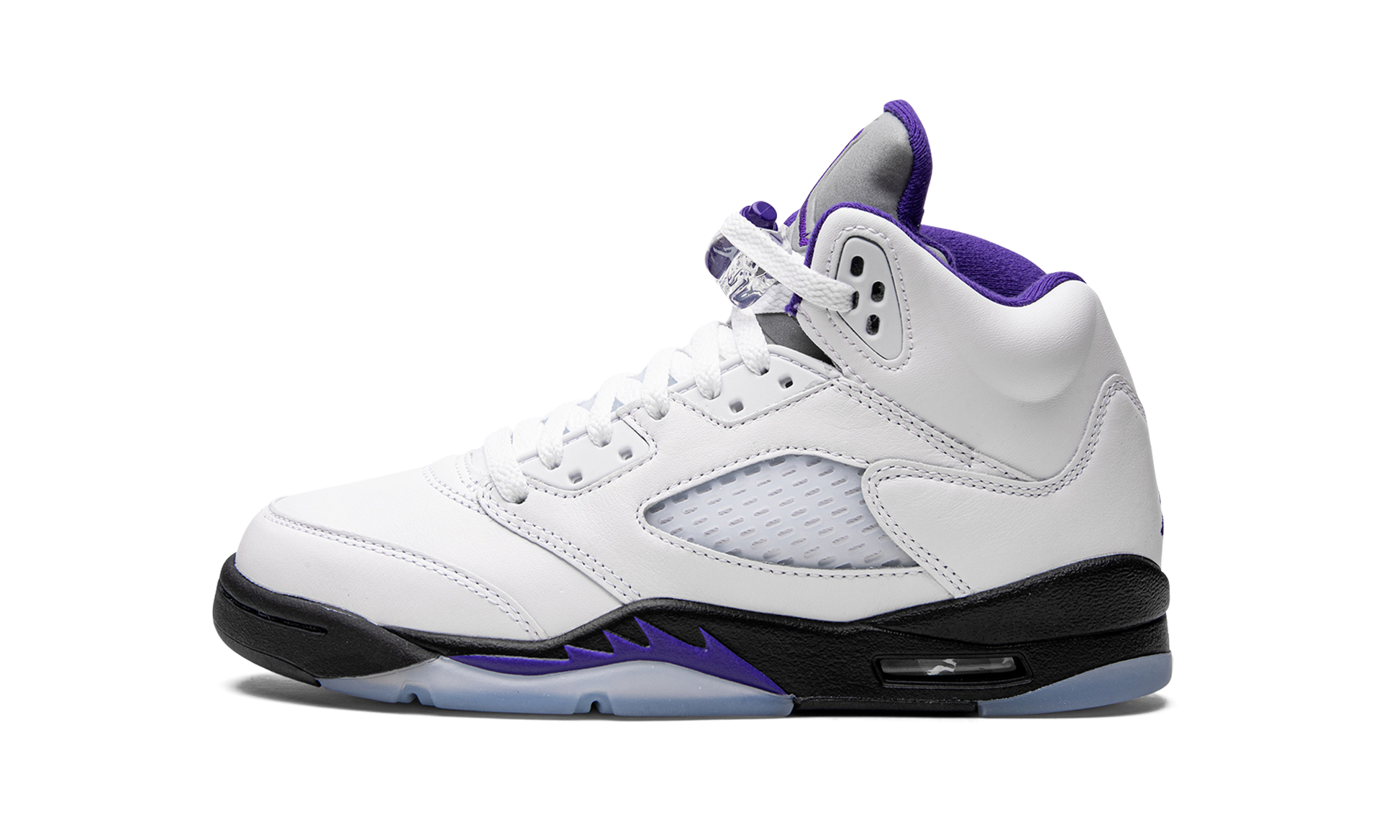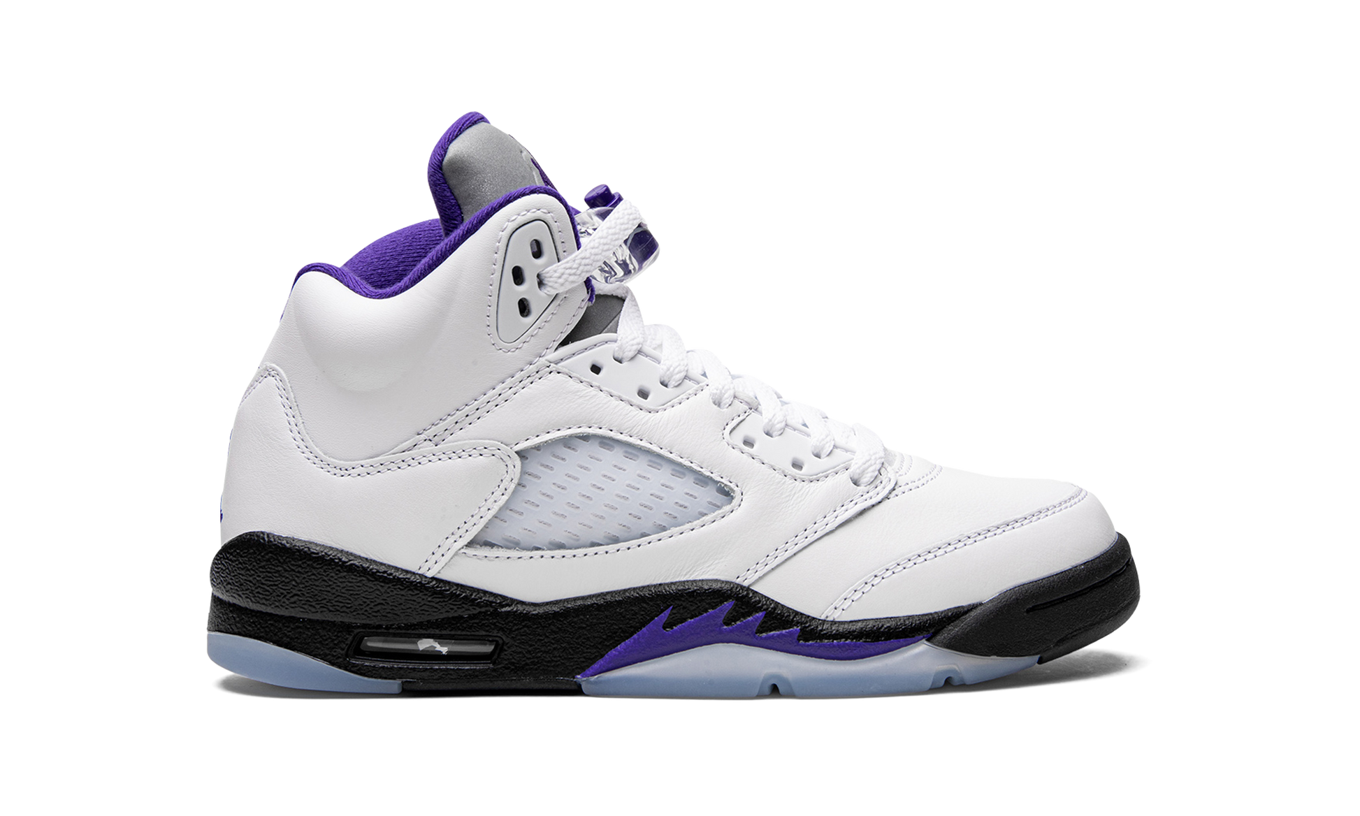 The Air Jordan 5 GS “Concordâ€?is the youth sizing of Michael Jordan's fifth signature shoe in a colorway inspired by the beloved Air Jordan 11. The “Concordâ€?theme was introduced on the Jordan 11 in 1996. and is one of the most popular colorways in sneaker history. On this Jordan 5. the “Concordâ€?features the same color block as the model's classic “Fire Redâ€?colorway. albeit with purple accents instead of red detailing per the original version. The upper is constructed from white leather. Translucent mesh is found on the mid-panel and lower tongue. A Concord (purple) Jumpman is embroidered on the heel. Additional Concord accenting can be found on the Jumpman on the reflective Metallic Silver tongue. on the collar. on the underside of the tongue. and on the shark tooth detailing on the black painted midsole. Release date: August 13. 2022