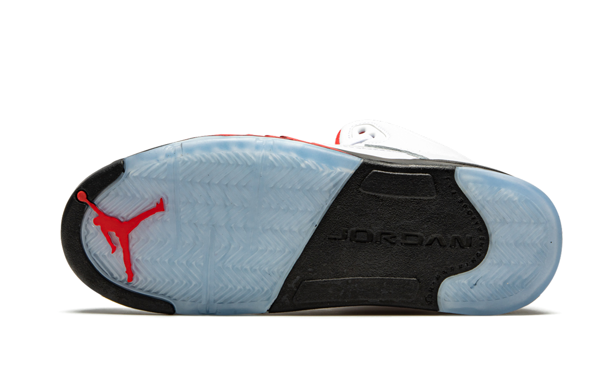 The Air Jordan 5 PS “Fire Red/Silver Tongueâ€?is the preschool kids sizing of the shoe Michael Jordan wore during his impressive 69-point outburst against the Cleveland Cavaliers in 1990. Many true-to-original styling elements are present on this shoe. including the Nike logo branding on the heel. a reflective silver tongue. black midsole with shark tooth detailing. and an icy translucent outsole. White leather dots the upper. save for the clear mesh panel on the mid foot. Red Jumpman branding appears on the tongue. Release date: May 2. 2020.