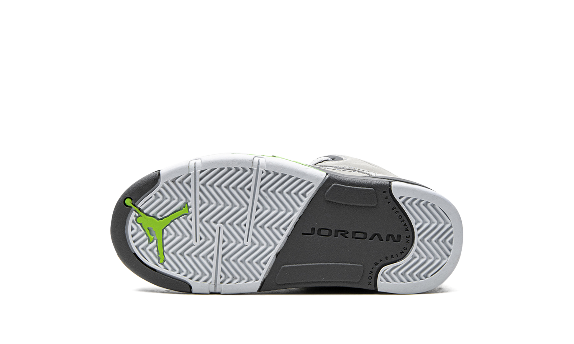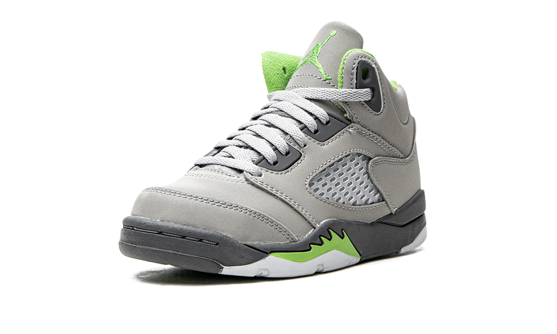 The Air Jordan 5 PS “Green Beanâ€?is the pre-school children's sizing of the classic Jordan 5 colorway that originally released in 2006 and returned in 2022. The “Green Beanâ€?Jordan 5 for kids features a fully reflective matte silver upper with bright green accents throughout. including for the signature shark tooth detailing at the midsole.