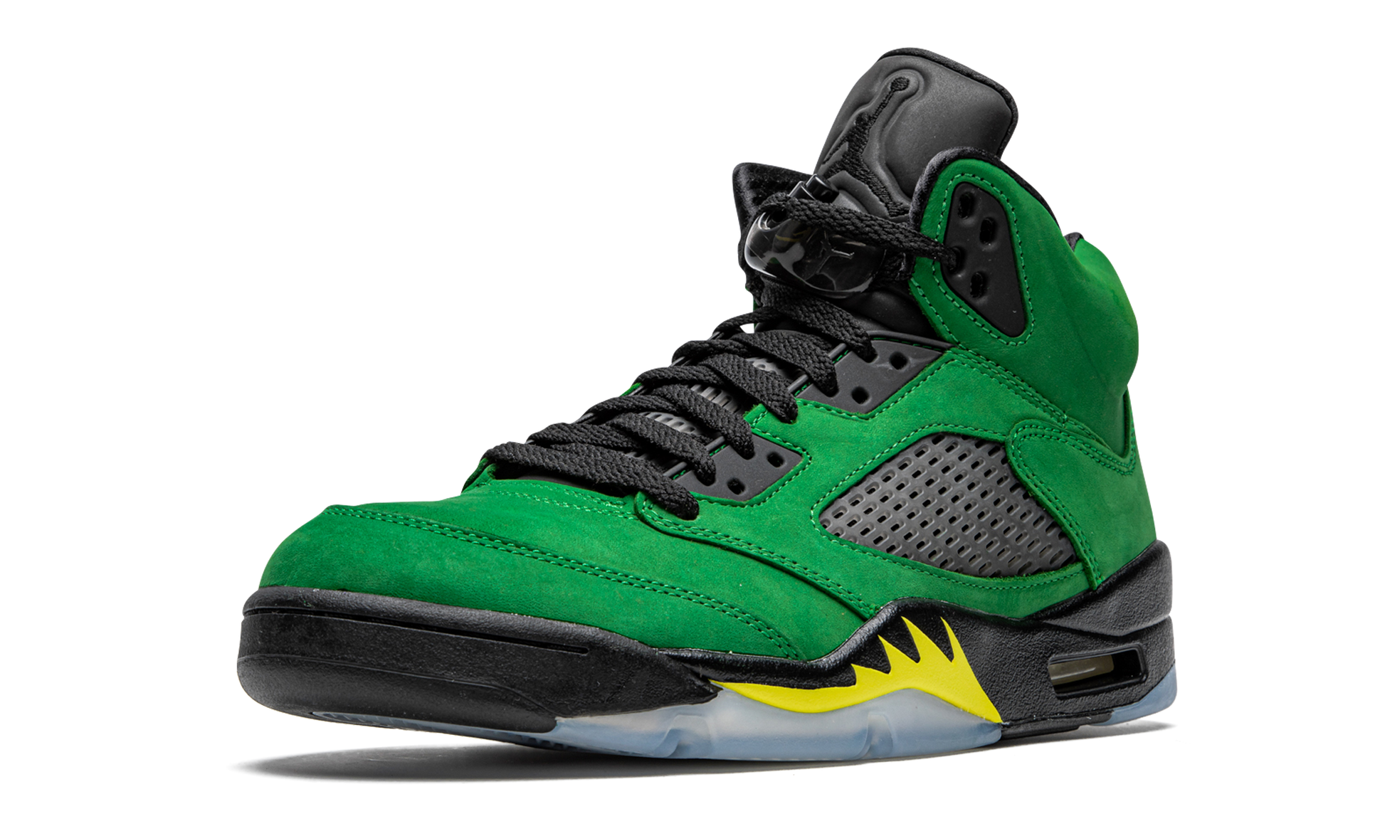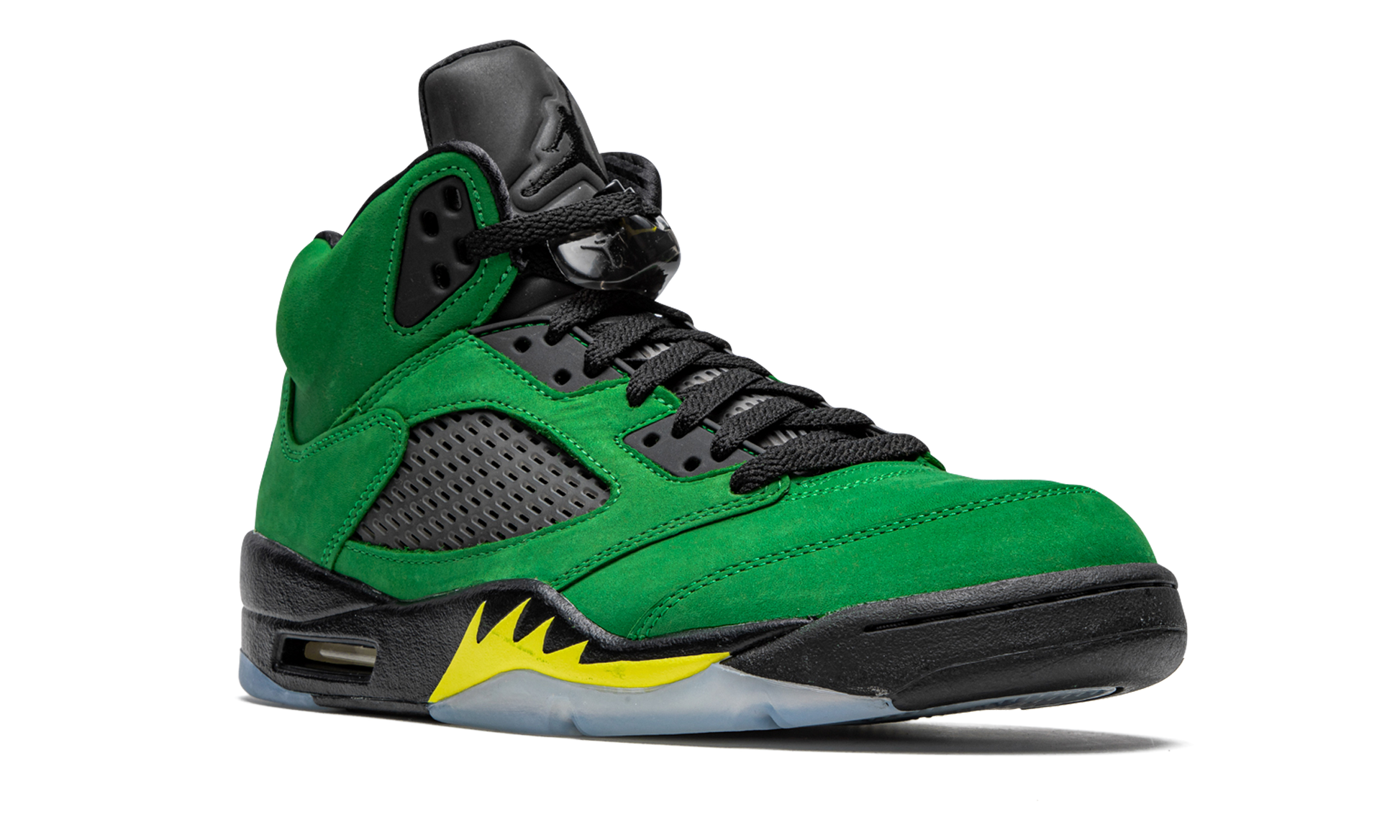 The Air Jordan 5 “Oregonâ€?honors the Oregon Ducks as Jordan Brand celebrates the 30th anniversary of Michael Jordan's legendary fifth signature shoe in 2020. Devoid of any Ducks branding. the colorway nonetheless graciously employs the school's familiar green. yellow. and black color scheme. Save for the smoky translucent netting found on the mid-panel and tongue. the entire upper is cast in green suede for a bold and unique appearance. Additional styling includes black laces. a semi-translucent lace lock with Jumpman detailing. and embroidered “Team Jordanâ€?patch on the heel. The black leather tongue displays a tonal embossed Jumpman logo and the black rubber midsole features yellow accented shark tooth detailing on top of an icy blue translucent outsole. Release date: September 12. 2020.