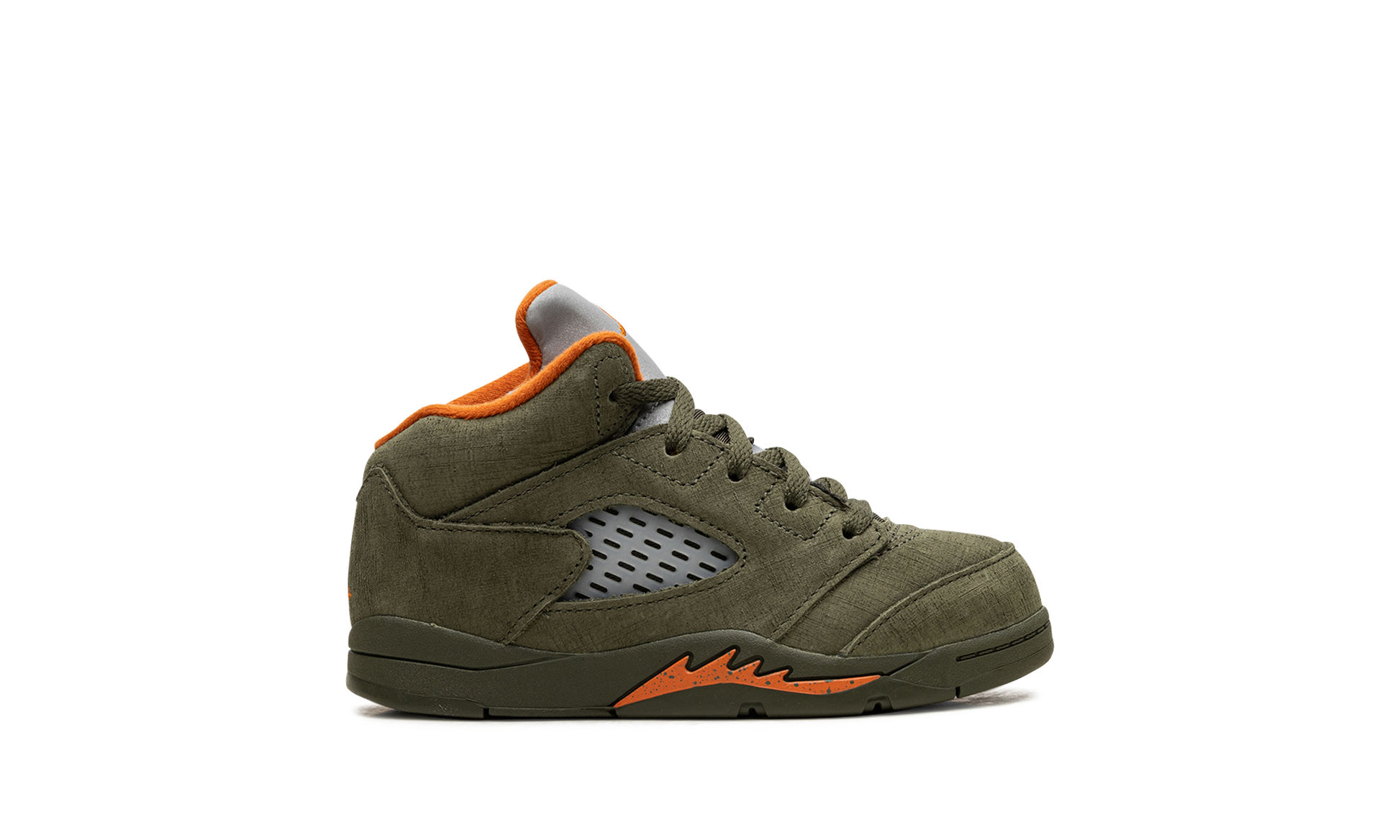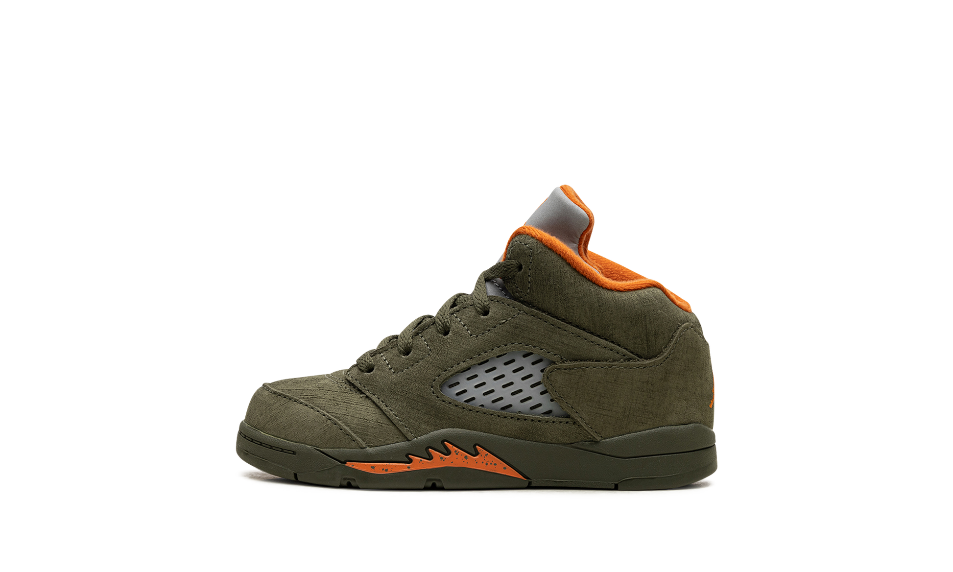 The Air Jordan 5 TD "Olive" is the toddler sizing of the colorway that debuted in 2006 and was re-released in 2024. The Jordan 5 “Oliveâ€?was created as a lifestyle colorway in 2006 and brought back by Jordan Brand in 2024. The contemporary version of the shoe is identical to the original style from '06. The shoe features an Olive suede construction with translucent netting on both the mid-panel and on the tongue. A Solar Orange Jumpman appears on the silver reflective tongue and on the heel. Additional orange accenting is seen on the inner lining and on the shark tooth detailing on the forefoot of the olive midsole.