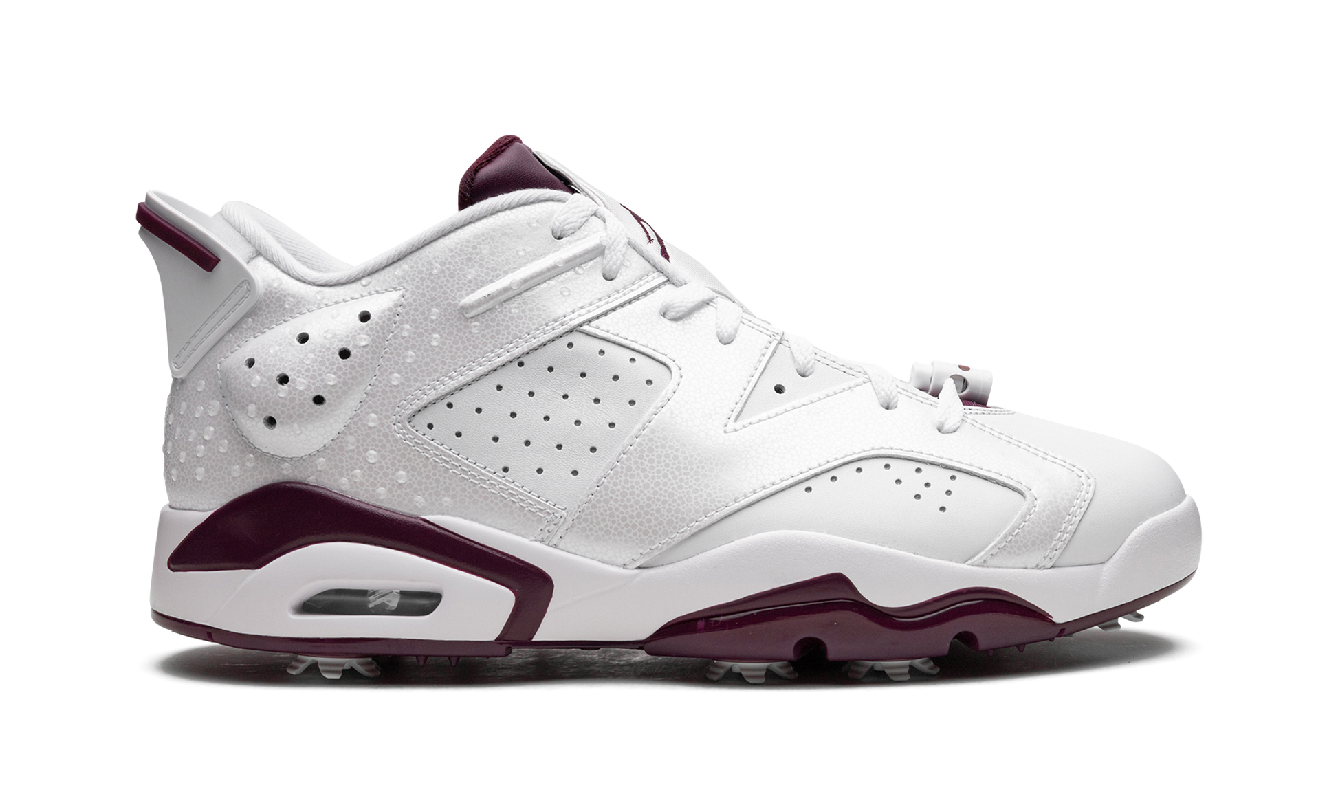 The Air Jordan 6 Low Golf “White/Bordeauxâ€?is a special version of the classic basketball shoe made for the fairway. Based on the iconic Jordan 7 “Bordeauxâ€?but updated with white accenting. the “White/Bordeauxâ€?Jordan 6 Low Golf features a white leather construction with tonal overlays. Unique water droplets are found on the rear of the shoe while cherry graphics appear on the tongue toggle. Additional cherry detailing is embroidered on the heel. These unique details are a reference to “Michael Jordan's favorite drink.â€?according to Nike. Classic Bordeaux accenting is found on the spoiler. on the midsole. and on the insole. Nubs on the outsole of the shoe help provide traction on the golf course. Release date: April 3. 2023