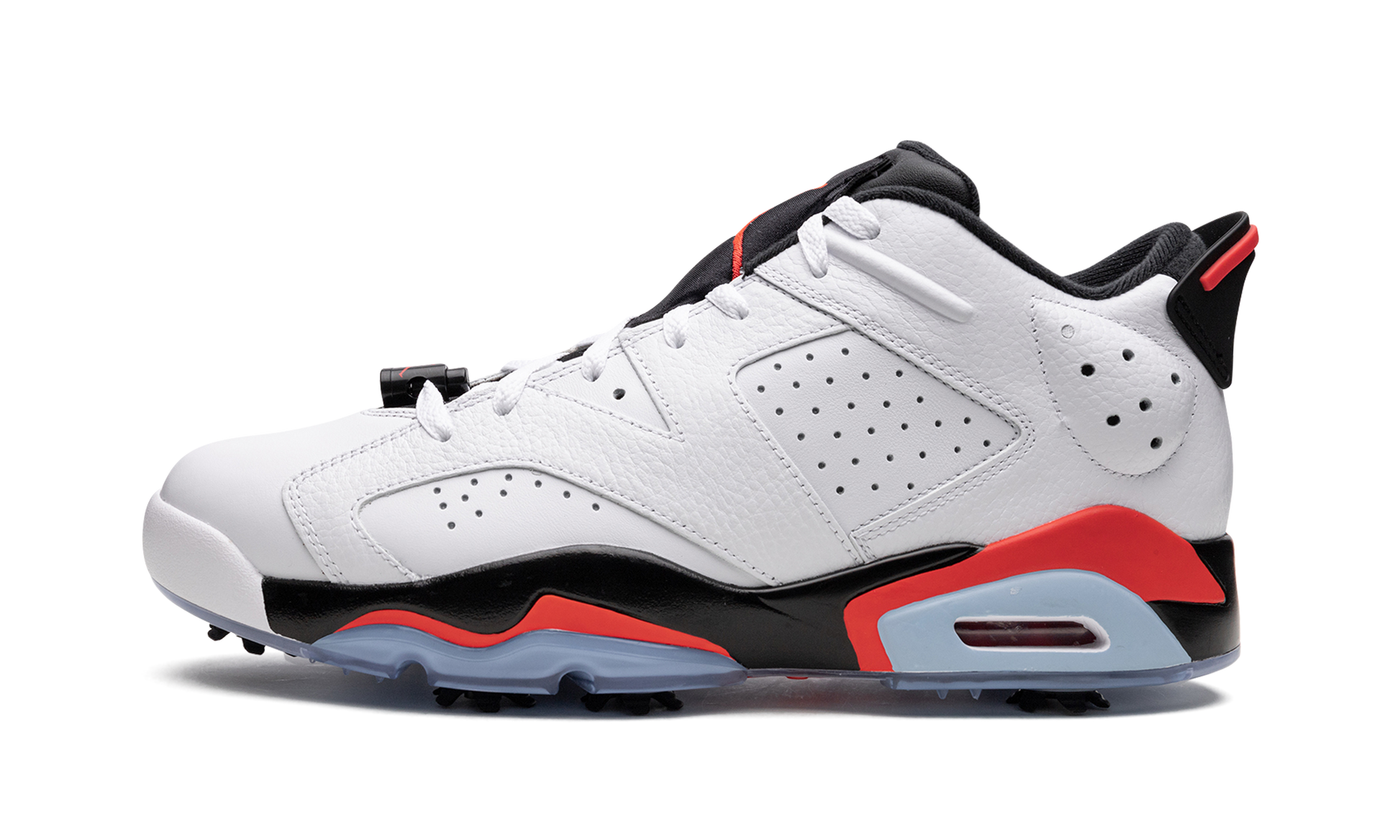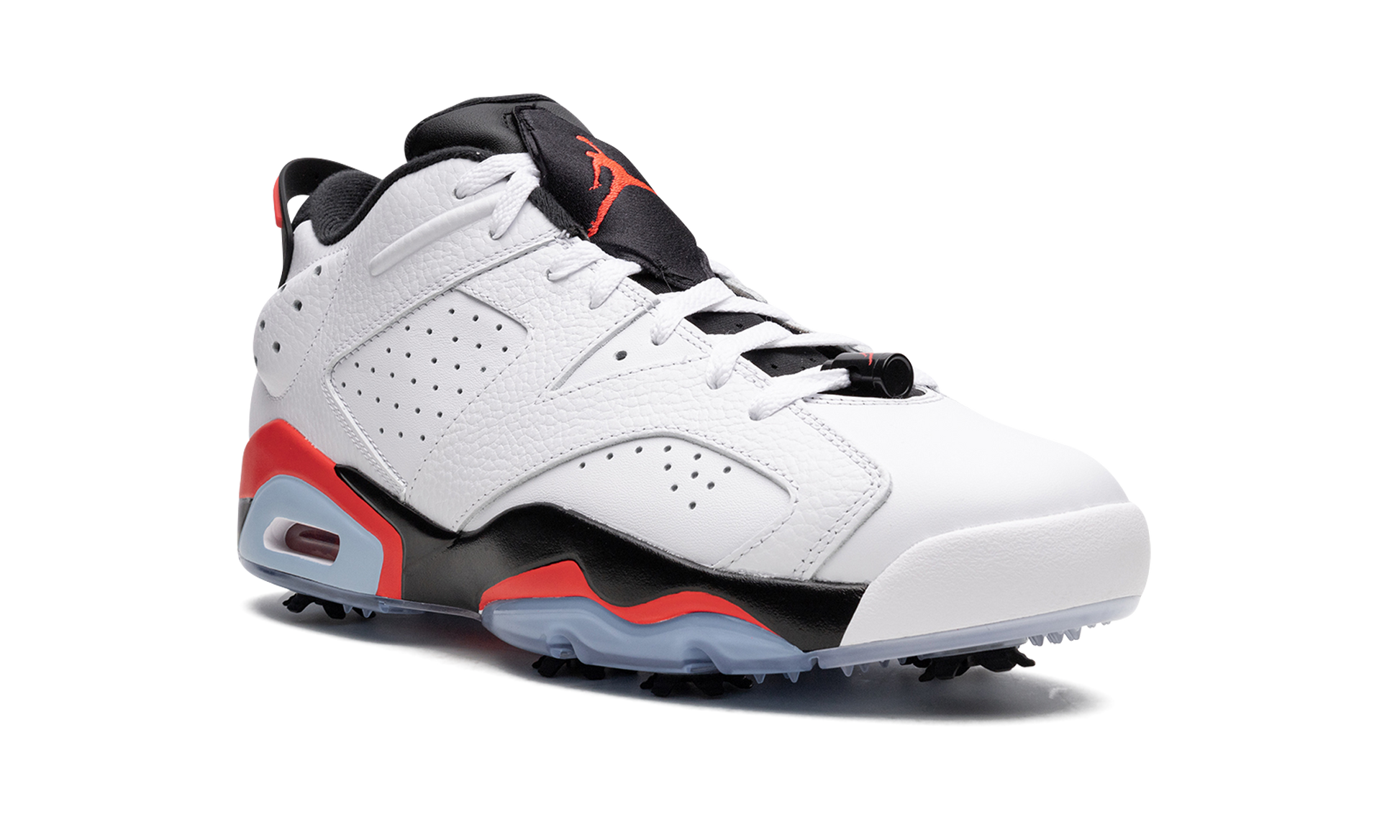 The Air Jordan 6 Low Golf “White/Infraredâ€?is an alternate version of the retro basketball shoe that's designed for the fairway. The Jordan 6 Low Golf is one of multiple classic Air Jordan models that have been reimagined for the golf course by Jordan Brand in recent years. The “White/Infraredâ€?is an original Jordan 6 colorway. Here. the shoe features a white leather design with perforated leather on the sides and collar. An Infrared Jumpman appears on the black neoprene patch on the tongue. Additional Infrared accenting appears on the black spoiler on the back of the shoe. and on the black painted midsole. A tonal Jumpman is embroidered on the heel. Small nubs on the outsole provide traction on a golf course. Release date: February 21. 2023