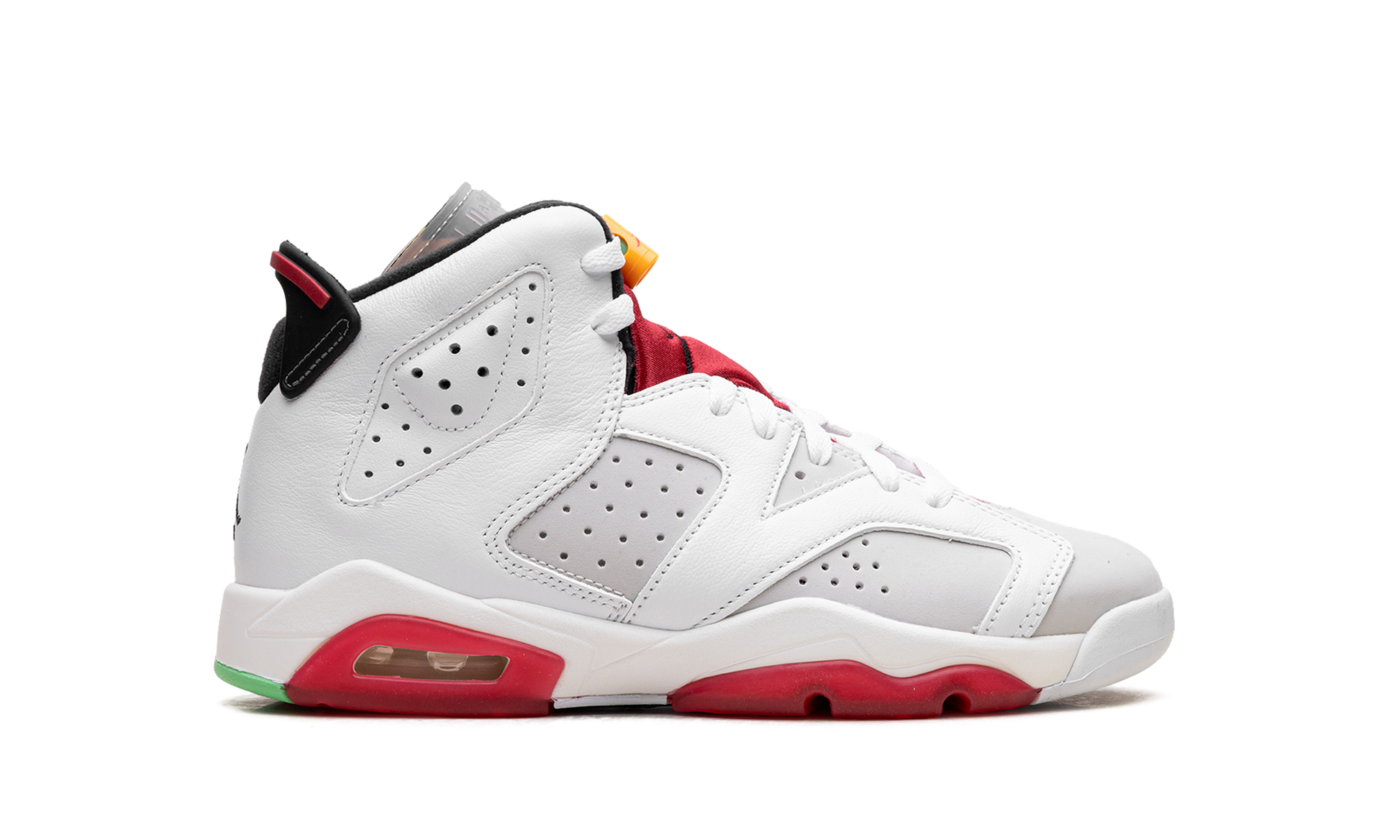 The Air Jordan 6 GS “Hareâ€?is the grade school youth sizing of the shoe that pays homage to another classic Jordan model: the original Air Jordan 7 “Hare.â€?The early '90s design gained popularity thanks to the memorable television commercials starring Michael Jordan and Bugs Bunny and. now. reappears with a modern twist as Jordan Brand honors the legacy of “His Airness'â€?sneaker collection. A light grey perforated synthetic nubuck material forms the base of the shoe. appearing on the mid-panel and toe. White leather overlays along the forefoot. mid-panel. and heel are accented by the red neoprene lace cover with black Jumpman branding. A multicolor geometric pattern is placed below the clear rubber tongue. Additional styling cues include an orange and green lace lock that resembles a carrot. an embroidered black Jumpman on the heel. and red translucent rubber detailing on the sole. Release date: June 12. 2020.