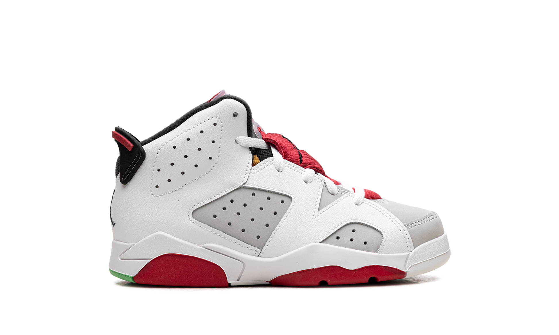 The Air Jordan 6 PS “Hareâ€?shrinks Michael Jordan's sixth signature shoe in size to fit the feet of preschoolers while paying homage to a legendary colorway in the Jordan Brand collection: the original Air Jordan 7 “Hare.â€?Debuted by both Jordan and Bugs Bunny during a run of early '90s commercials. the “Hareâ€?design returns in Spring 2020 with noticeable differences that still honor the legacy of the beloved look. The upper features a light grey perforated synthetic nubuck base that is visible on the forefoot and mid-panel. Stark white leather overlays add a touch of contrasting along the forefoot. mid-panel. and heel. Additional design elements include a black rubber spoiler with red accenting on the heel and a red neoprene tongue with black Jumpman branding. Release date: June 12. 2020.