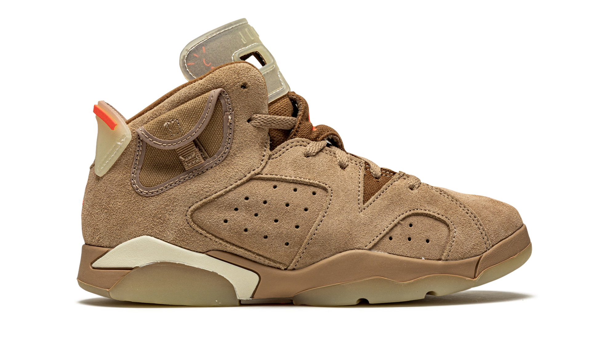 The Travis Scott x Air Jordan 6 PS “British Khakiâ€?is the preschool sizing of the hip-hop star's second edition of Michael Jordan's sixth signature shoe. From Spring 2021. Travis Scott's extremely hyped Jordan 6 “British Khakiâ€?succeeds the military inspired “Cactus Jackâ€?colorway produced by Scott and Jordan Brand in 2019. The upper on the “British Khakiâ€?features a monochromatic brown suede construction. An orange embroidered Jumpman is embroidered onto the dark brown canvas tongue. Like Scott's first Jordan 6 design. the “British Khakiâ€?dons an added stash pouch on the collar. a utilitarian design meant to mimic the kinds of pockets that can be found on the side of cargo pants and military gear. A zip pocket appears on the lateral side of the collar and provides the wearer with additional storage. Embroidered Nike and “Cactus Jackâ€?branding can be found on the back of the left and right shoe. respectively. Finishing touches include a light brown mudguard and a glow-in-the-dark translucent outsole.