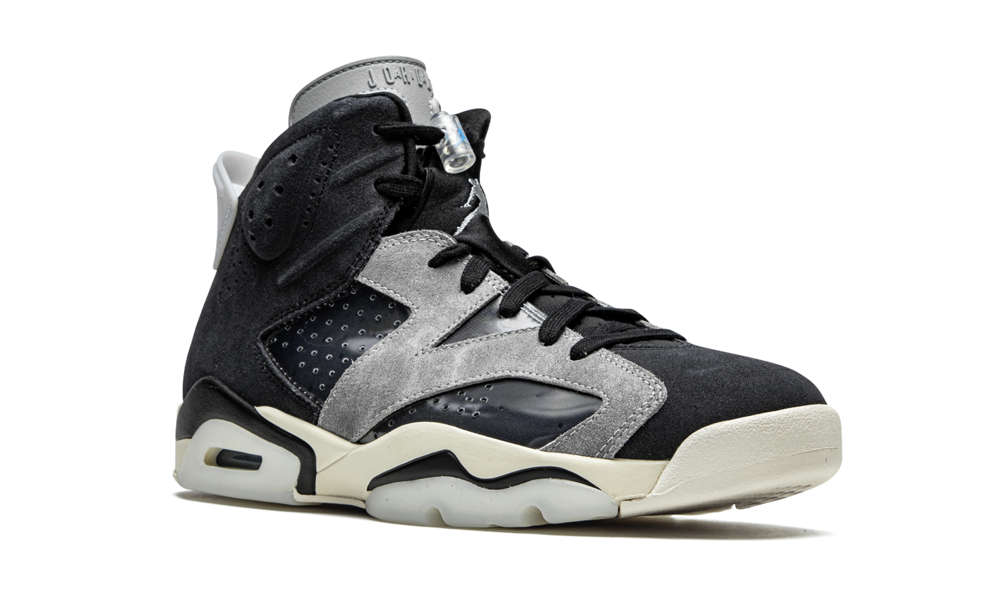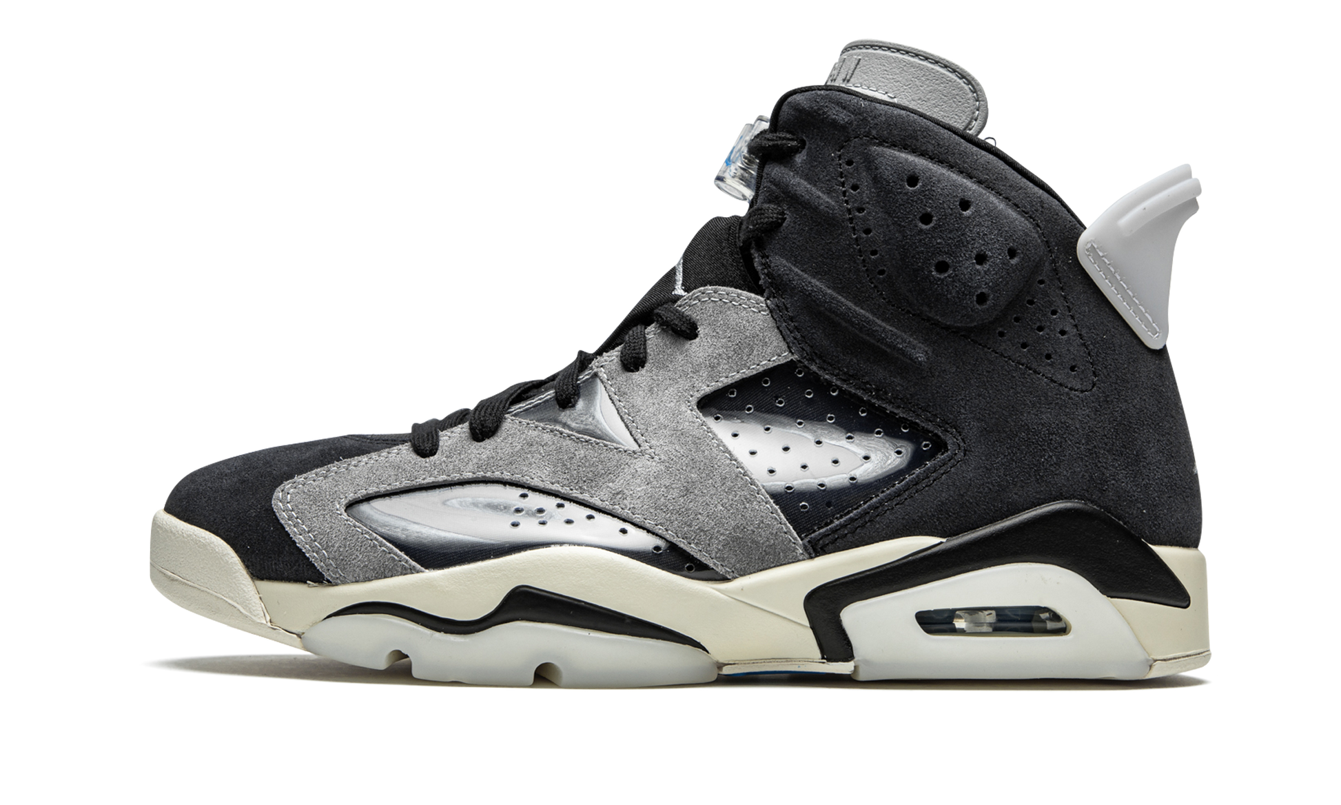 The Women's Air Jordan 6 "Tech Chrome" AKA “Smoke Greyâ€?is the women's sizing of Michael Jordan's sixth signature model in a neutral colorway for unlimited versatility. Reimagined by Jordan Brand for its Fall 2020 campaign. this “Tech Chromeâ€?Jordan 6 is another lifestyle-focused shoe that appeals to fans of His Airness. as well as those who simply appreciate the classic styling of Air Jordans. The upper displays a mixture of colors and materials. including a Light Smoke Grey suede overlay atop the shiny black perforated leather mid-panel. Charcoal suede dots the toe. collar. and heel. A white "spoiler" heel tab and tonal Jumpman detailing on the neutral colored nylon tongue add to the shadowy aesthetic. Inspirational slogans like “Be Kind.â€?“Embrace Uniqueness.â€?and “Spread Loveâ€?are printed on the sockliner. The visible Air window in the heel is surrounded by translucent molding for a classic yet modern appearance. Release date: September 24. 2020.
