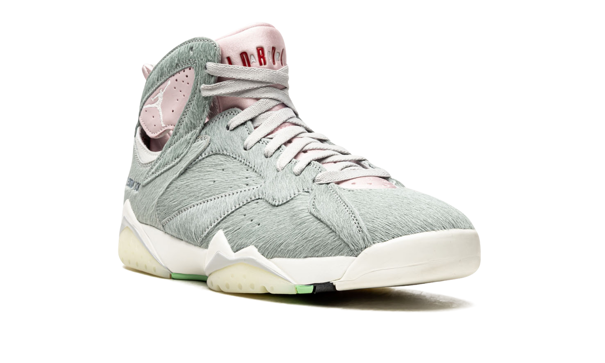 The Air Jordan 7 “Hare 2.0â€?marks the return of “Hare Jordan.â€?the unofficial nickname of cartoon character Bugs Bunny. Though not an official collaboration. the predecessor to the original Jordan 7 “Hareâ€?is nonetheless an overt nod to the classic design as it takes on a “lucky rabbit's footâ€?inspiration. A light green fur covers the entire upper. including the overlays across the forefoot. mid-panel. and collar. The style code of the original “Hareâ€?design from 1991 is embroidered on the heel. while pastel pink leather encompasses the tongue and collar. White embroidered Jumpman detailing covers the collar and staggered “Air Jordanâ€?detailing appears embroidered on the tongue. A white midsole and semi-translucent outsole finish off the look of the shoe. The Air Jordan 7 “Hare 2.0â€?was released on April 8. 2020.