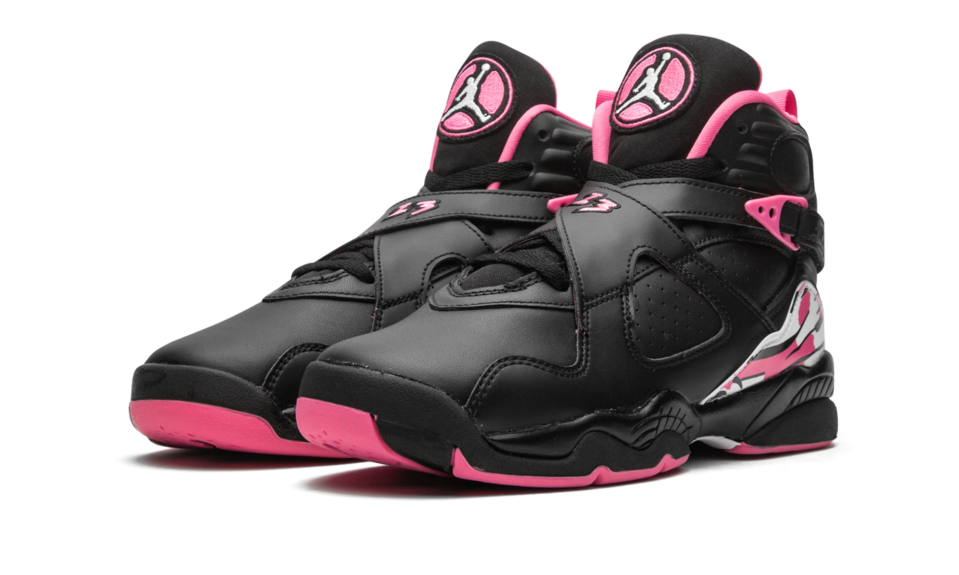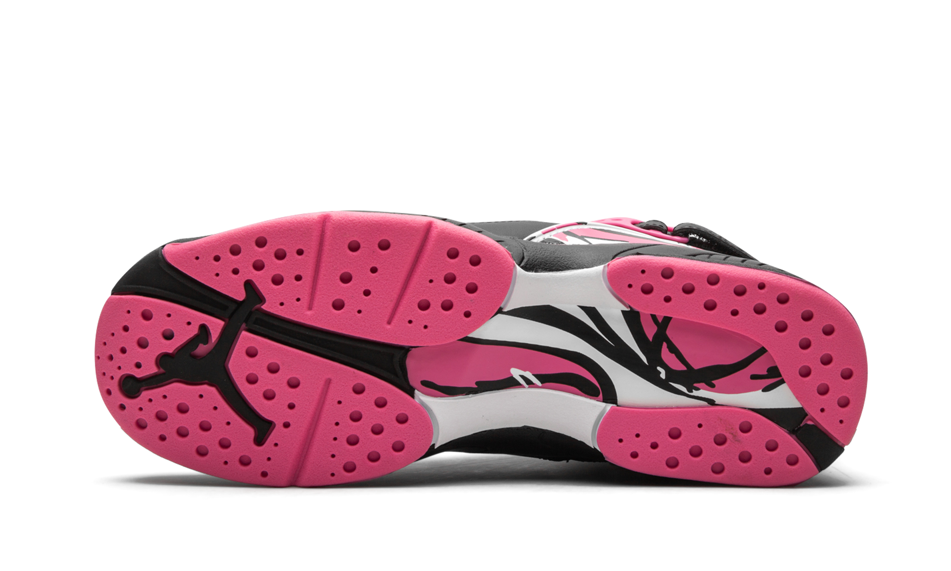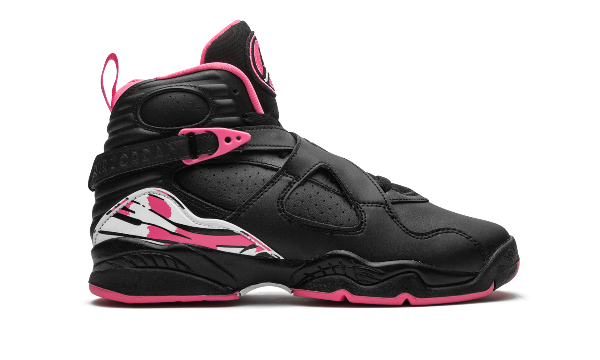 The Air Jordan 8 GS “Pinksicleâ€?is the youth sizing of Michael Jordan's eighth signature shoe in an appealing colorway for kids. The Jordan 8 is a decidedly early '90s performance basketball shoe that Jordan wore during the '92-93 NBA season in which he captured his third NBA Championship as a member of the Chicago Bulls. Whereas original Jordan 8 colorways featured a nubuck construction. the “Pinksicleâ€?displays an all-black leather upper. Perforated black leather detailing can be found on the mid-panel. White and pink accenting appears on the mudguard on the heel. Additional Neon Pink detailing can be found on the plastic lace clips. â€?3â€?detailing on the black leather midfoot strap. on the sock liner. and on the circular Jumpman logo on the black nylon tongue. Release date: September 4. 2020