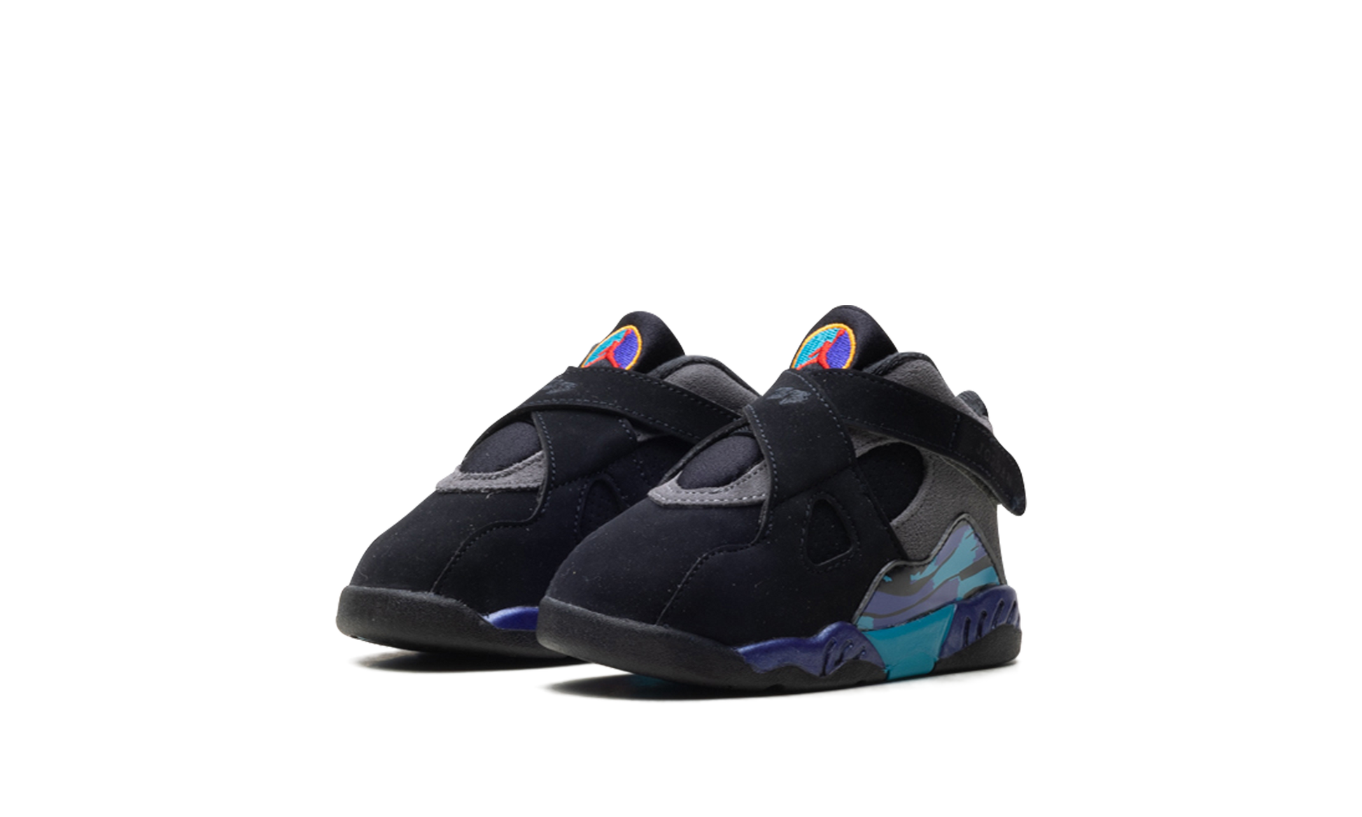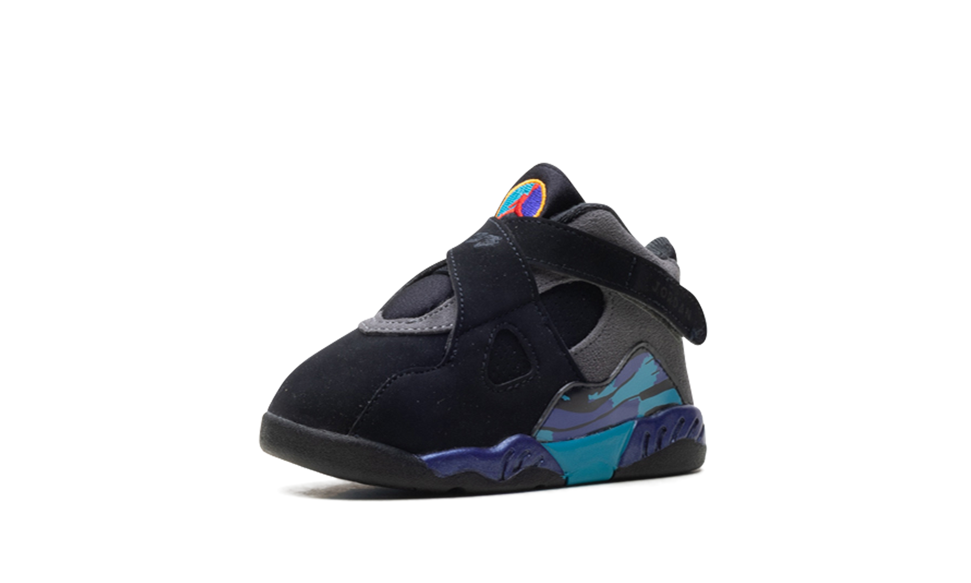 Start the next generation right with the Air Jordan 8 Retro TD. a miniature version of the iconic "Aqua (2025)" colorway. True to the 1993 original. this toddler shoe boasts a black nubuck upper and the unforgettable multi-color Aquatone and Bright Concord accents on the foam midsole. The signature crisscross straps and padded ankle collar ensure a snug. supportive fit. while the simple hook-and-loop closure makes them super easy to take on and off.