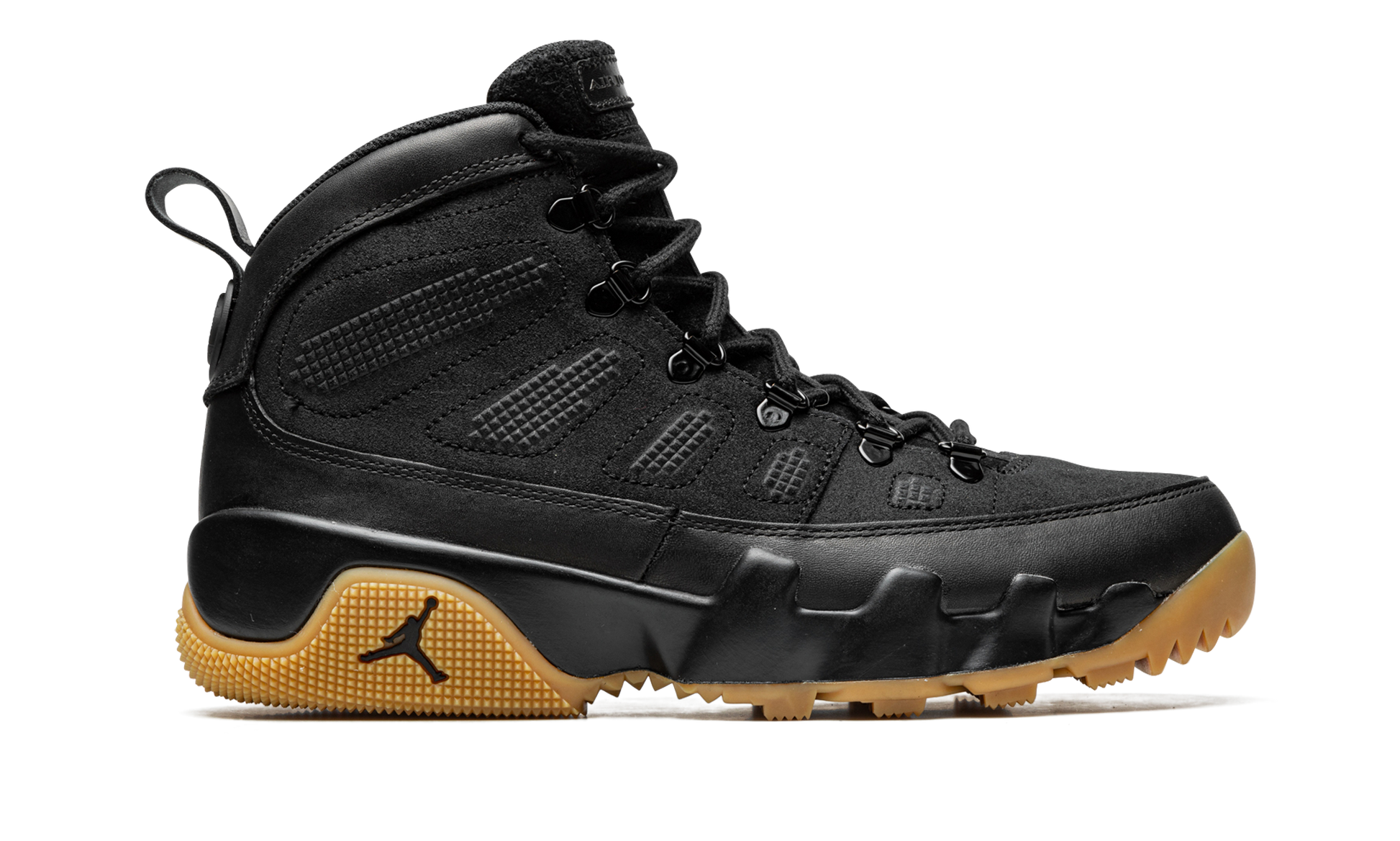 The Air Jordan 9 Boot “Black/Gumâ€?is a November 2021 release of Michael Jordan's ninth signature basketball shoe recrafted as a winter boot. Originally released by Jordan Brand in 2017. the Jordan 9 Boot in “Black/Gumâ€?returned as part of Jordan's Holiday 2021 release cycle. and is a one-to-one remake of the original style. Inspired by Nike's Special Field Boot. the Jordan 9 Boot has a black suede base with tonal leather detailing on the mudguard that spans the toe up to the collar. Both details have been treated with a water-resistant coating. Boot-inspired metal eyelets and a gusseted tongue provide a rugged look. A tonal “globeâ€?emblem is found on the heel. The rugged sole with upgraded tread for inclimate weather is constructed in gum rubber. Release date: November 24. 2021