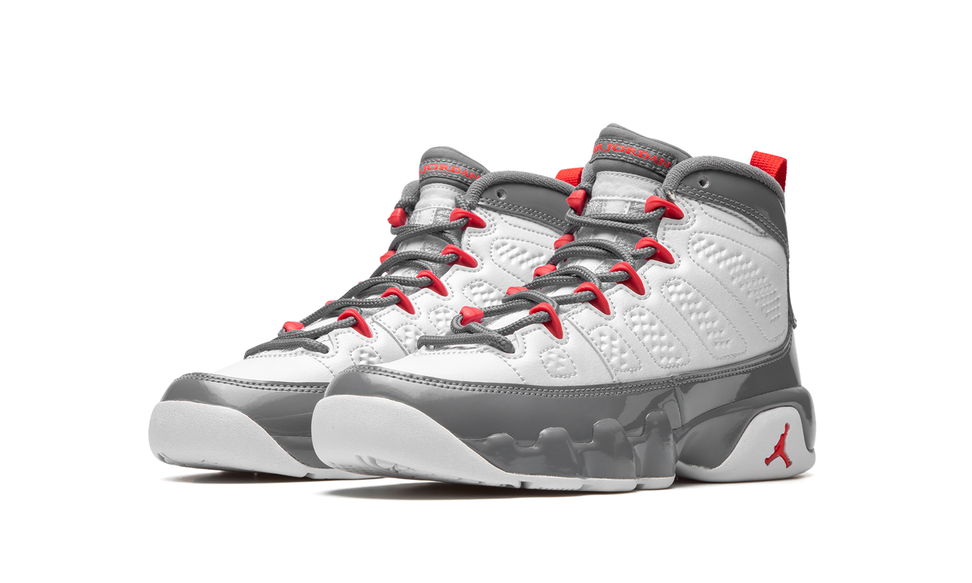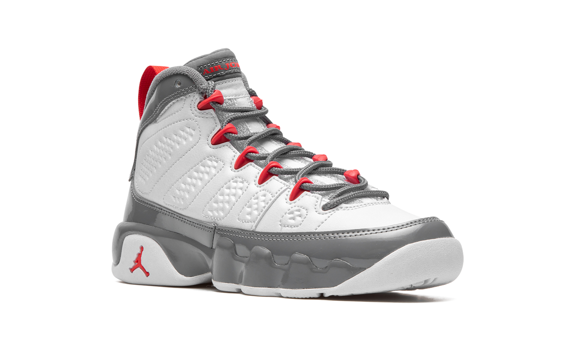 The Air Jordan 9 GS “Fire Redâ€?is the youth sizing of the colorway of the classic shoe that is loosely inspired by the Chicago Bulls. As with other classic and popular Air Jordans in “Fire Redâ€?colorways. this Jordan 9 features a fiery shade of red that is found on the Bulls' team uniforms. The shoe features a white leather construction with a contrasting grey patent leather mudguard overlay that extends from the toe up to the collar. Fire Red accents are found on the eyelet loops. on the pull tab on the heel. and on the “Jordanâ€?branding on the tongue. A Fire Red Jumpman also appears on the lateral side of the white foam midsole. Release date: November 23. 2022