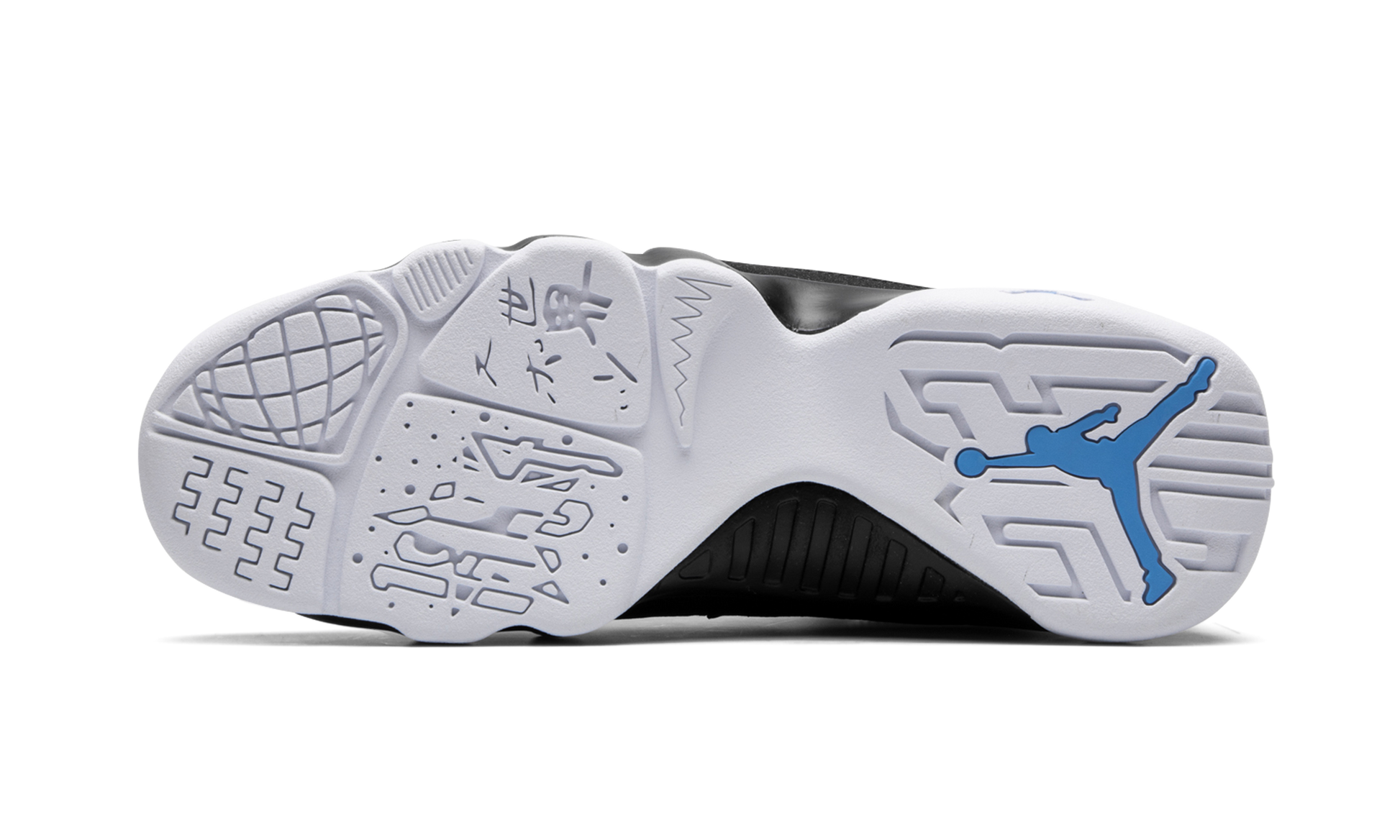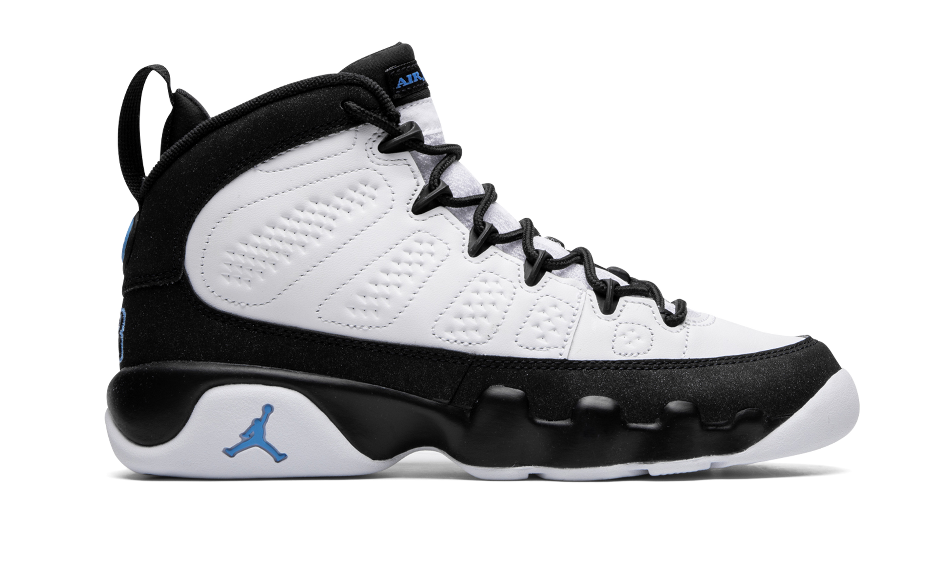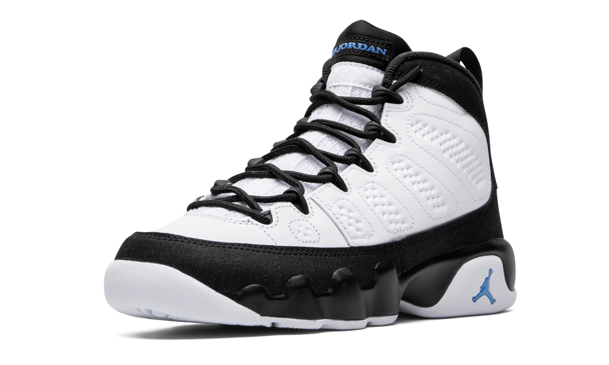 The Air Jordan 9 GS “University Blueâ€?is the youth sizing of Michael Jordan's ninth signature shoe in a UNC-inspired colorway for Winter 2020. The “University Blueâ€?look features the familiar original white and black color block of the Jordan 9. but with University Blue replacing the red accents. The colorway includes a white leather base with a perforated “diamondâ€?motif appearing along the medial and lateral sides of the shoe. A black synthetic nubuck mudguard above the black painted midsole breaks up the look. Black plastic eyelets and rope laces contrast the white mesh tongue. A University Blue â€?3â€?emblem appears on the heel and “Air Jordanâ€?detailing dots the tongue. Additional “UNCâ€?inspired accenting can be found on the mini Jumpman emblem on the sole and on the “globeâ€?insignia on the heel. A black nylon pull tab on the heel and inner bootie lining complete the look of the shoe. Release date: December 5. 2020.