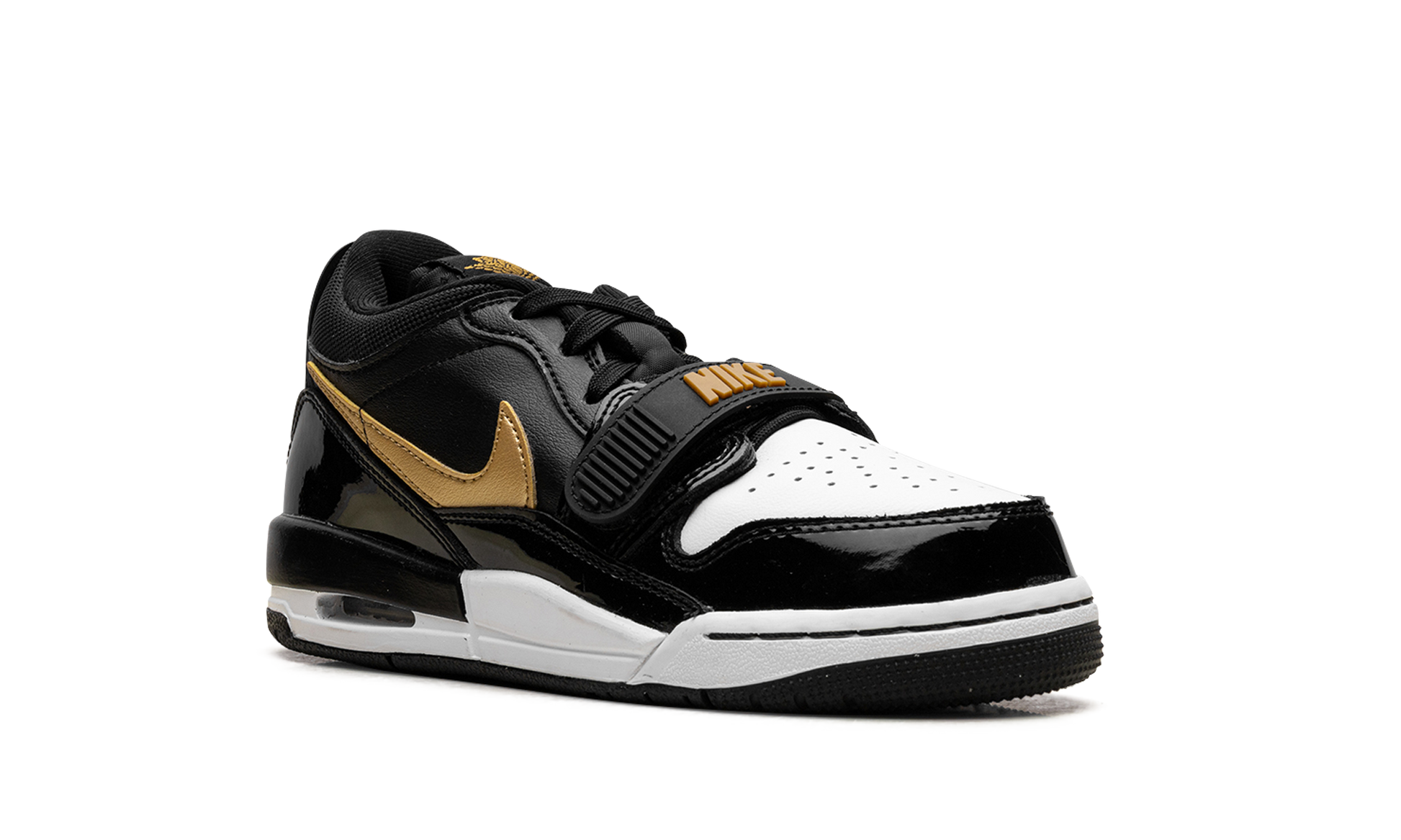 Introducing the Air Jordan Legacy 312 Low GS "Black/Metallic Gold." a shoe that is pure Jordan heritage for the next generation. This Grade School (GS) low-top is a mashup of three classic Jordan silhouettes: the Air Jordan 1. the Air Jordan 3. and the Nike Air Alpha Force. The design features a premium black leather and patent leather upper with a white midsole for contrast.