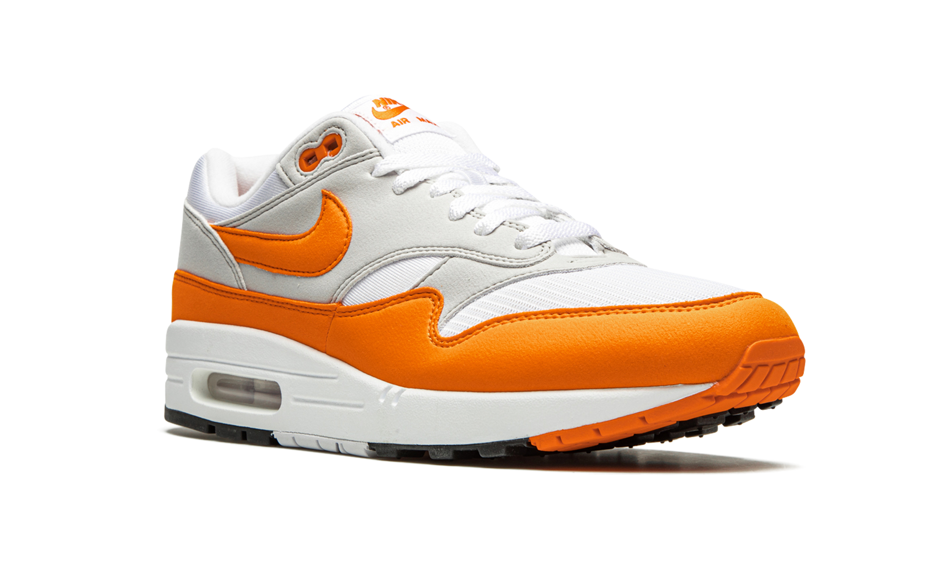 The Nike Air Max 1 Anniversary “Magma Orangeâ€?is inspired by the original shape and construction of the iconic Tinker Hatfield designed performance runner. Part of the “Anniversaryâ€?series. this classic look is a must-have for fans of the ultra comfortable shoe. The upper displays lightweight white mesh on the toe while light grey suede overlays dot the forefoot. mid-panel. and heel. A fiery Magma Orange Swoosh detailing and “Nike Airâ€?embroidery dot the mid-panel and heel. respectively. A heel-to-toe orange felt mudguard calls attention to this special Air Max 1.