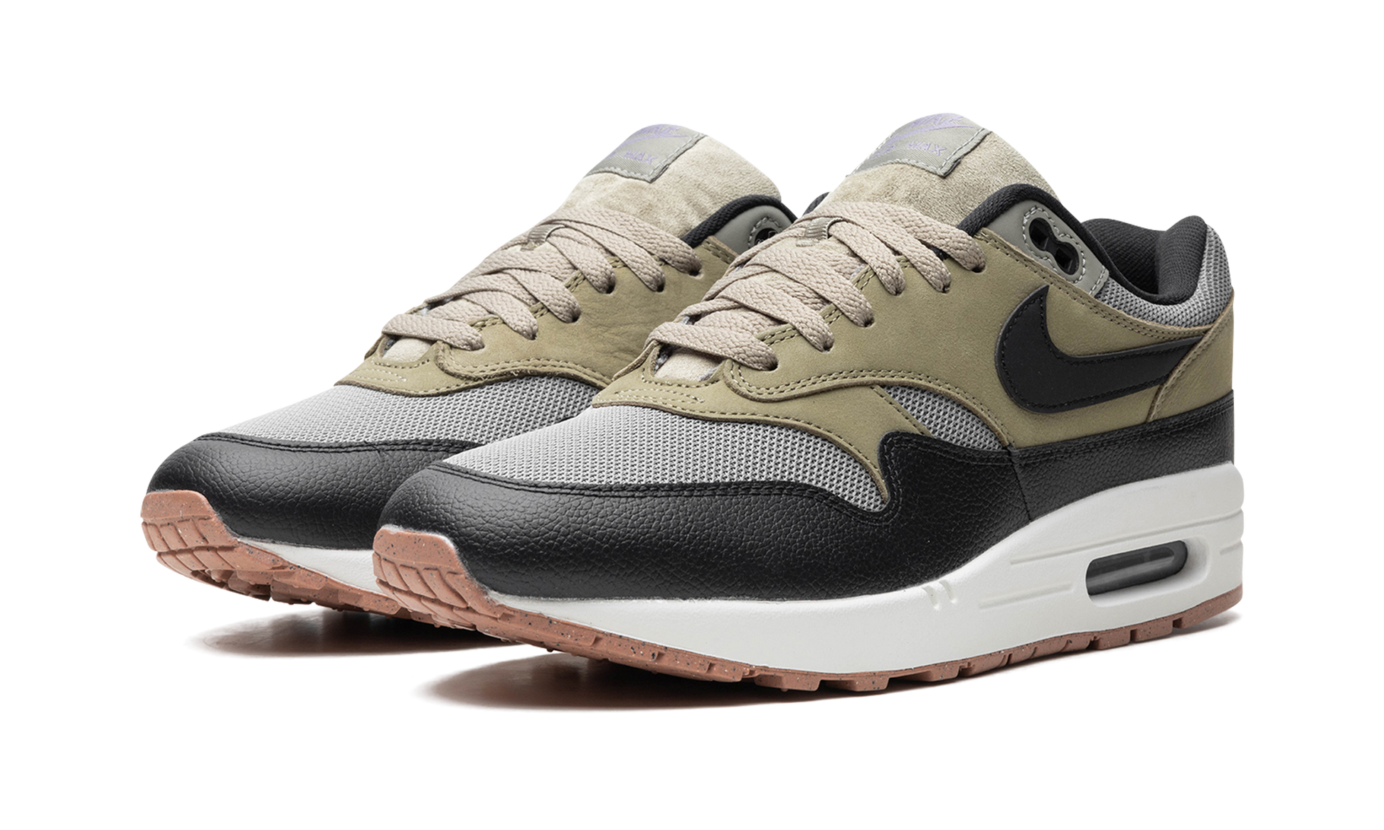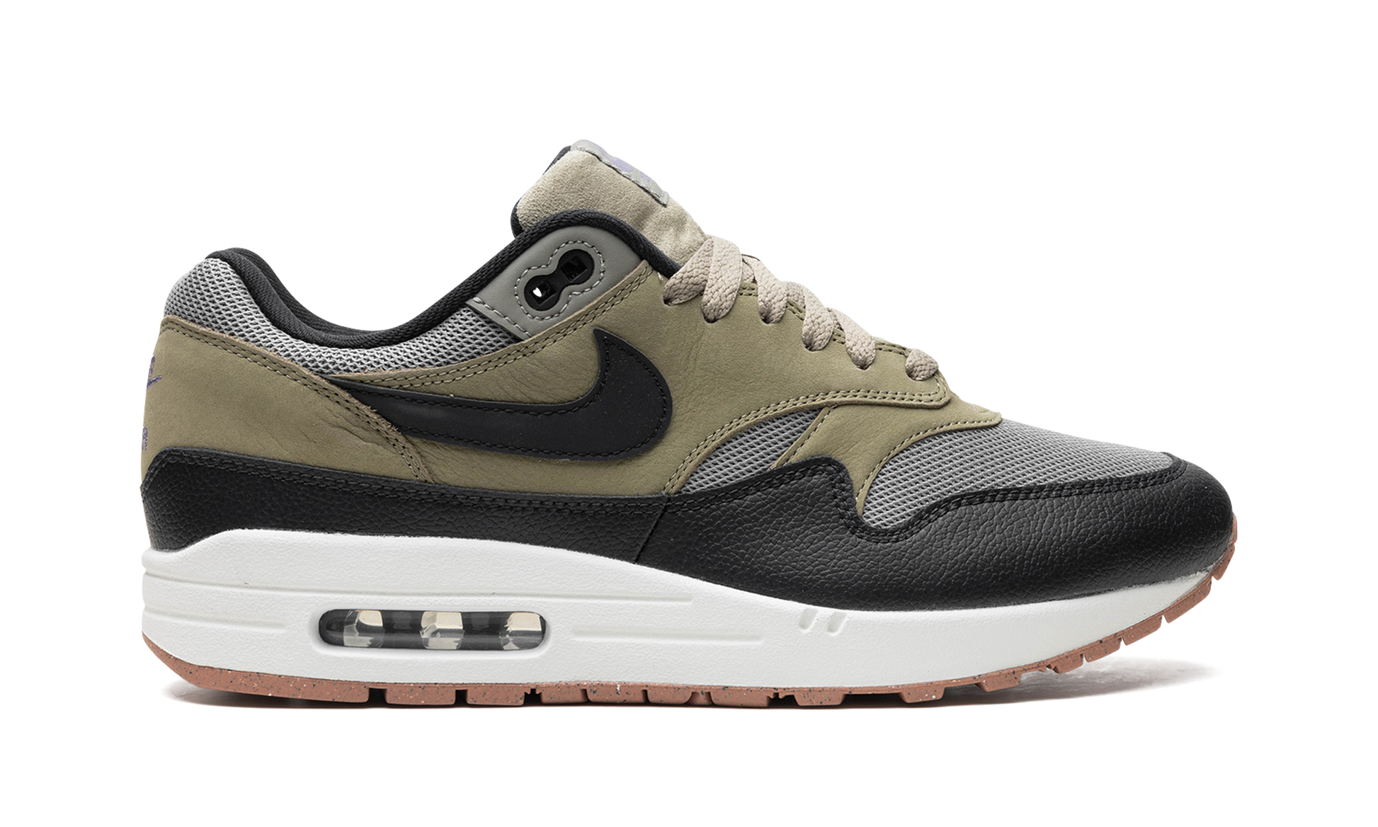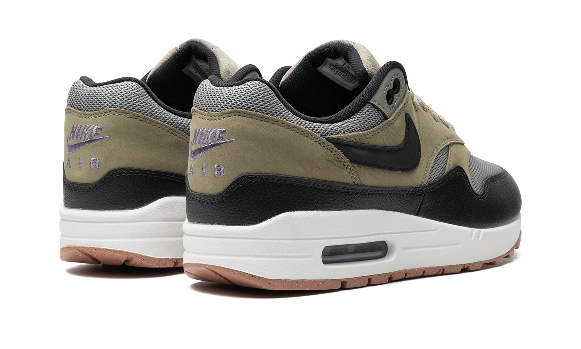 The Nike Air Max 1 "Dark Stucco" is an earth tone colorway of the retro performance running shoe. From Nike's Spring 2024 footwear collection. the “Dark Stuccoâ€?Air Max 1 features a Dark Stucco mesh base and a Neutral Olive leather overlays on the midfoot and heel. Contrasting black leather appears on the mudguard and Swoosh. Classic Air Max 1 branding elements include “Nike Airâ€?embroidery on the heel and “Air Maxâ€?detailing on the tongue tag. A visible Air unit appears in the heel of the white foam midsole. Underfoot. the gum rubber outsole is made from Nike's recycled Grind material. Release date: January 25. 2024