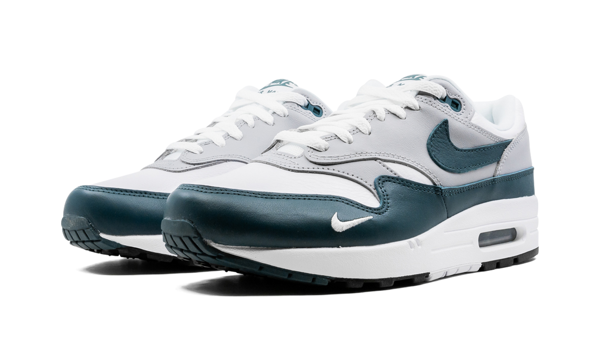 The Nike Air Max 1 LV8 “Dark Teal Greenâ€?is a premium version of the retro running shoe that trades the model's original mesh and suede construction for a leather composition. An April 2021 release by Nike. the “Dark Teal Greenâ€?is arranged in a tri-color design similar to the original color block of classic Air Max 1s. Moreover. the “Dark Teal Greenâ€?succeeds the release of another Air Max 1 LV8 (or “Elevate''). January 2021's “Obsidianâ€?colorway. White tumbled leather appears on the toe. forefoot. and collar. Grey leather contrasts the design on the forefoot. mid-panel. and heel. A Dark Teal Green leather Swoosh resides on both sides of the shoe. The same green detailing appears on the buttery leather mudguard. A “Nike Airâ€?logo is stitched onto the heel and a clear Air bubble can be found in the heel of the white midsole. Release date: April 15. 2021