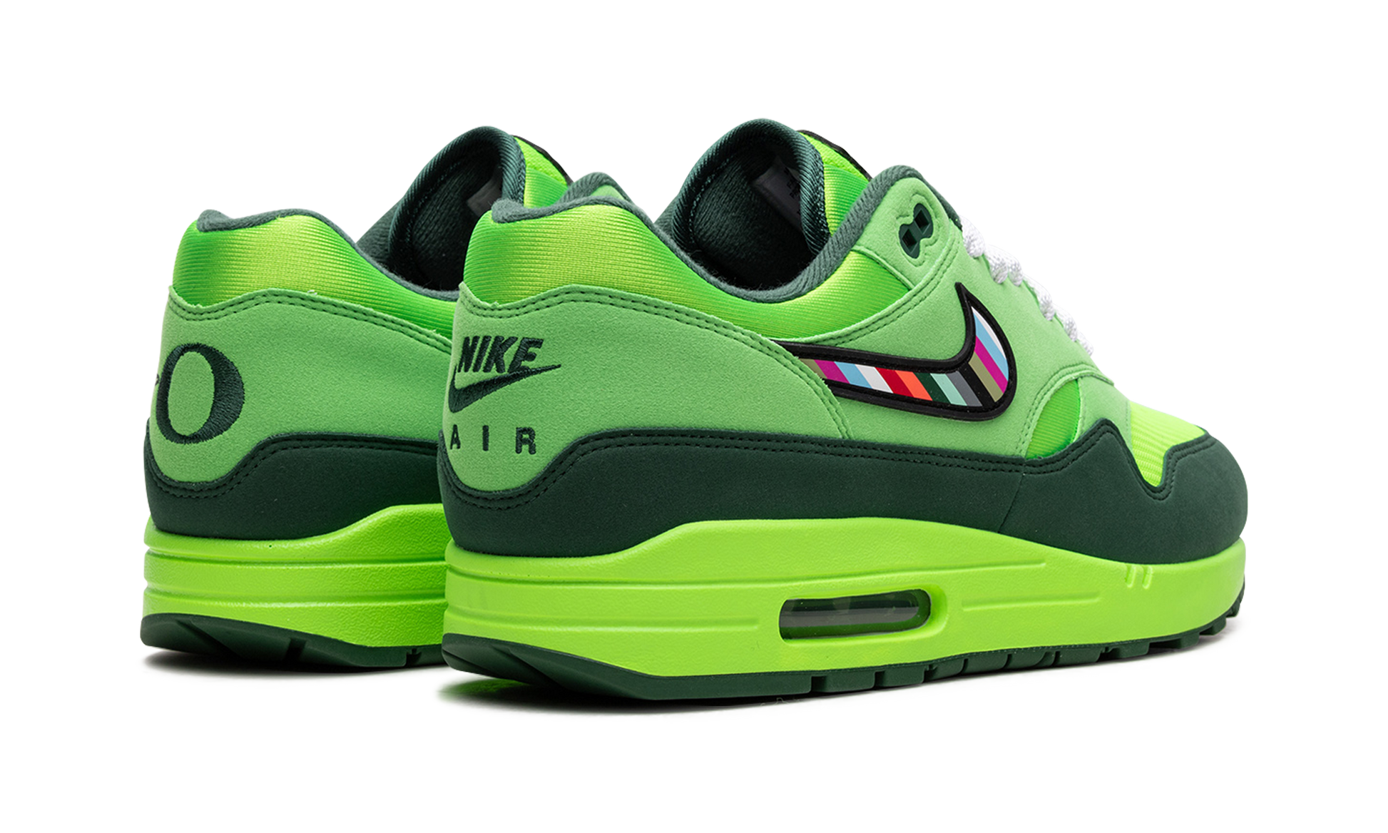 The Tinker Hafield x Nike Air Max 1 “Oregonâ€?PROMO is an unreleased sample version of the collaboration by Phil Knight's Division Street NFT collective and the legendary footwear designer on a colorway of the classic shoe inspired by the Oregon Ducks. Designed to help launch Ducks of a Feather. an NFT platform created to empower University of Oregon student athletes and connect them to fans. boosters. and collectors. the Air Max 1 “Oregonâ€?has a decidedly Ducks-flavored look. The upper features a neon green mesh construction contrasted with bright lime green and dark green felt overlays. A multicolored Swoosh appears on each side of the shoe. Tinker Hatfield's signature is seen on the lateral side of the heel. Each pair is hand-numbered out of 120. which is written on the heel below Tinker's signature. The Ducks' school mascot is seen on the tongue in a multi-color design.