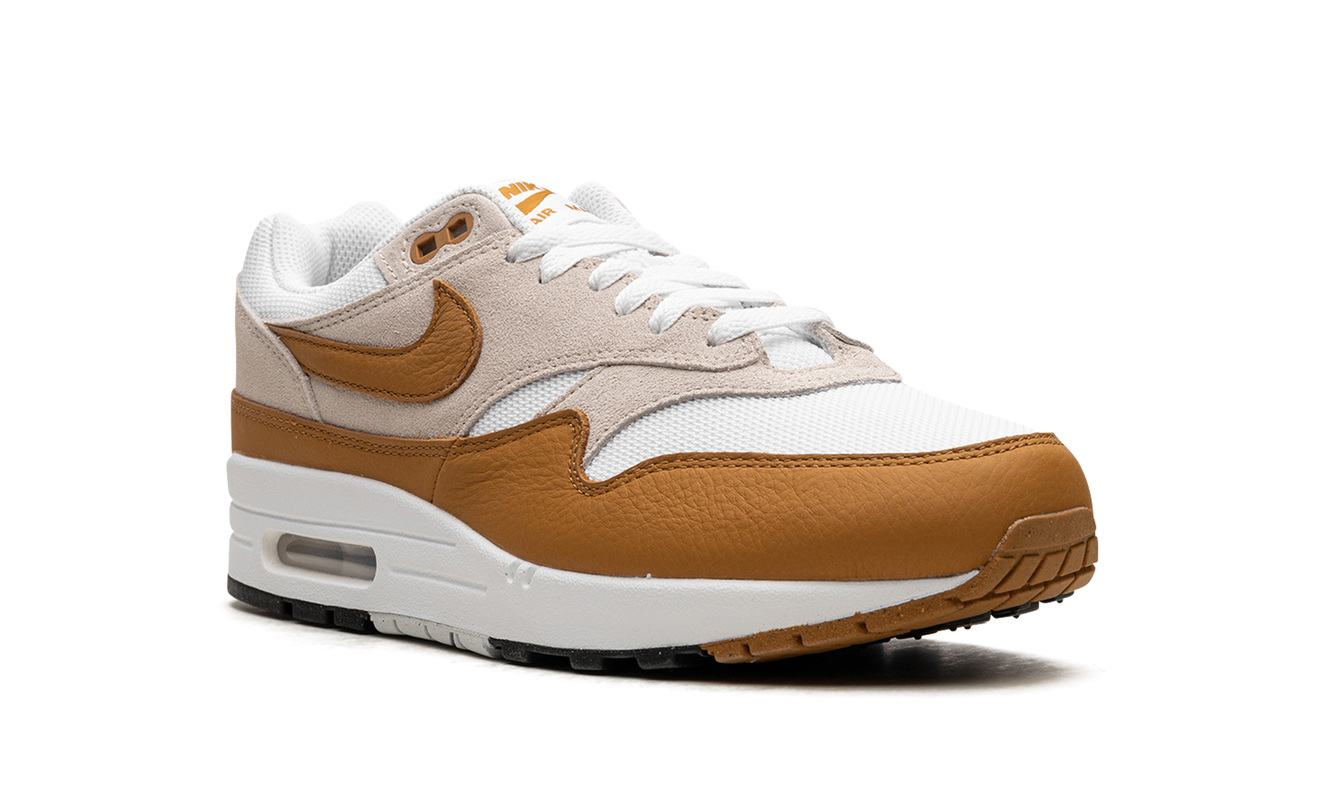 The Nike Air Max 1 SC "Bronze" is a colorway of the retro performance running shoe with an autumn-inspired look. The “Bronzeâ€?rendition features a white mesh base with light grey suede overlays on the vamp. eyelets. mid-panel. and heel. A Bronze leather Swoosh appears on each side of the shoe. The autumn-esque hue is also found on the leather mudguard. as well as on the “Nike Air Maxâ€?branding on the tongue tag and “Nike Airâ€?branding on the heel. The shoe's white foam midsole has a visible Air cushioning unit in the heel. Release date: July 7. 2023