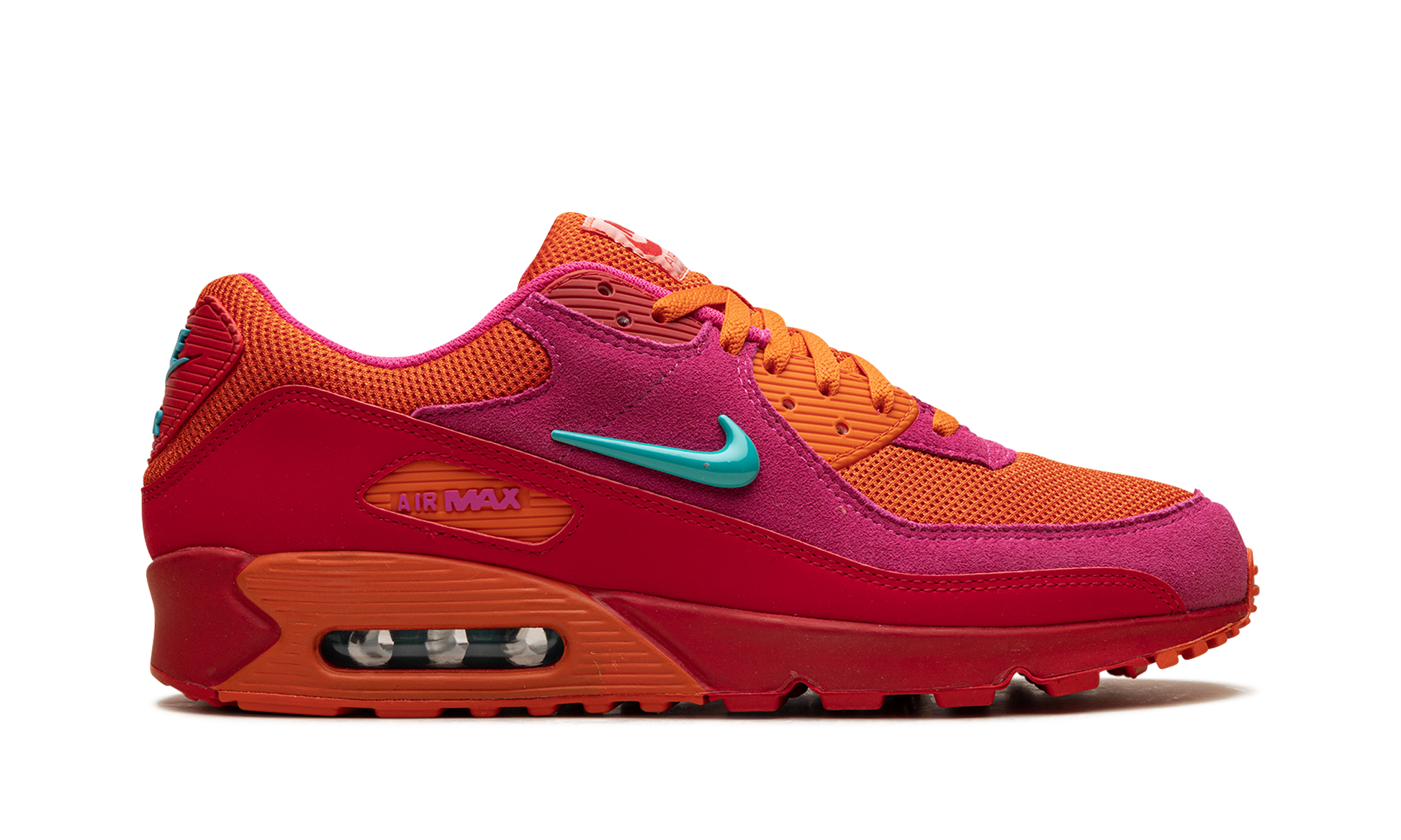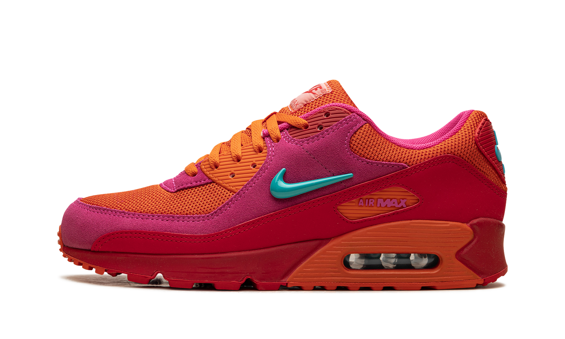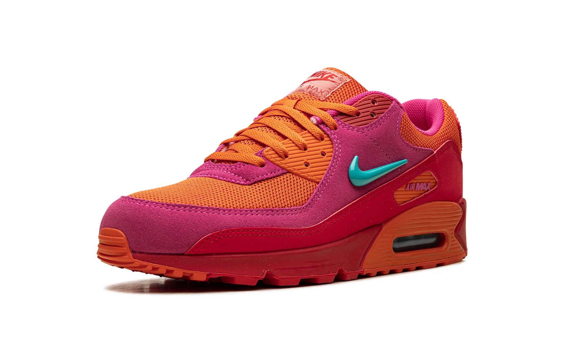 The Nike Air Max 90 "Alchemy Pink" is an undoubtedly head-turning colorway of the retro running shoe. The "Alchemy Pink" attracts attention with a Alchemy Pink. Cosmic Clay. Fire Red. and Dusty Cactus color scheme. Specifically. the mesh base is designed in Cosmic Clay. while the overlays appear in Alchemy Pink suede. A Dusty Cactus Swoosh appears on the lateral side. and a Cosmic Clay Swoosh can be found on the medial side. A pink “Air Maxâ€?logo appears in the orange overlay on the Fire Red mudguard. Dusty Cactus “Nike Airâ€?branding is located on the heel. while red “Nike Airâ€?detailing is printed on the tongue tag. An orange panel surrounds the Air cushioning unit in the heel of the pink midsole.