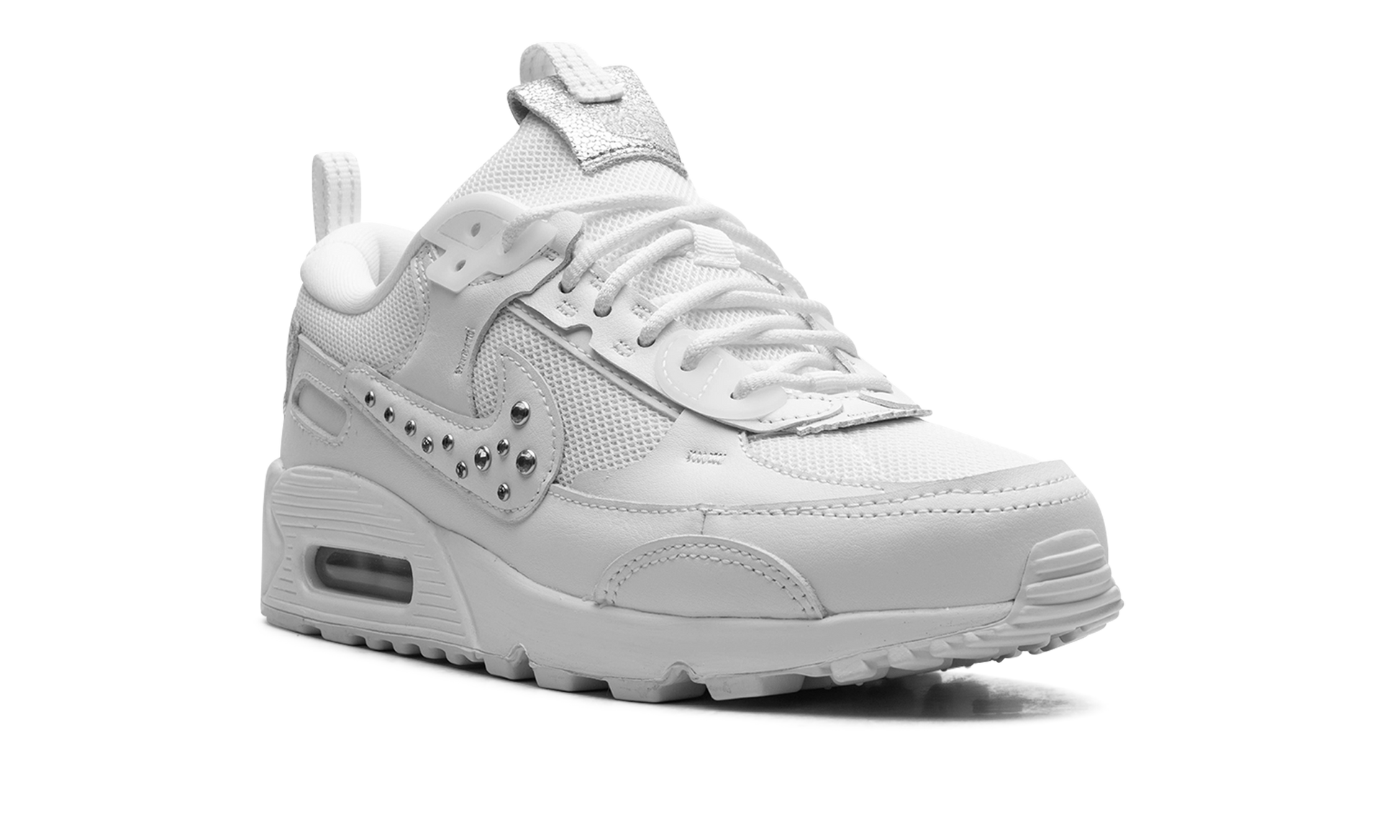 The Women's Nike Air Max 90 Futura "Studded Swoosh" is a women's-exclusive colorway of the modern version of the retro running shoe. The Air Max 90 Futura updates the iconic sneaker with a contemporary design edge that includes a new construction of overlays. a modified Swoosh. and more updated detailing. Here. the “Studded Swooshâ€?features a white mesh base with tonal leather overlays. Metallic Silver studs appear on the Swoosh. A modified tongue overlay features classic “Nikeâ€?branding. as does the corner heel tab. The shoe retains the Air Max 90's original midsole design.