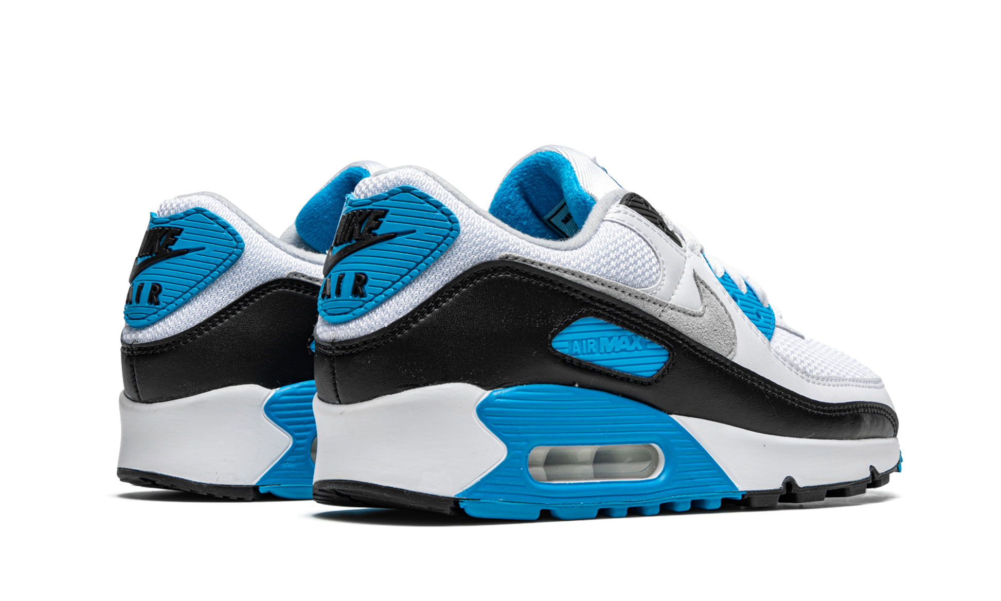 The Nike Air Max 90 “Laser Blueâ€?is a special retro of an original colorway for the iconic performance runner that celebrates the model's 30th anniversary in 2020. For this design. Nike returns to the original shape and materials used on early pairs of the Air Max 90. The decidedly vintage look features a slimmer white mesh toe. a buttery black leather mudguard. and Grey Fog Swoosh on either side. Overlays finished in smooth white leather can be found on the mid-panel and toe. Additional tonal mesh detailing appears on the collar and heel. Nike applies Laser Blue accenting on the eyelets. Air Max branding window. heel tab. and panel that surrounds the Air window in the heel. Release date: October 2. 2020.