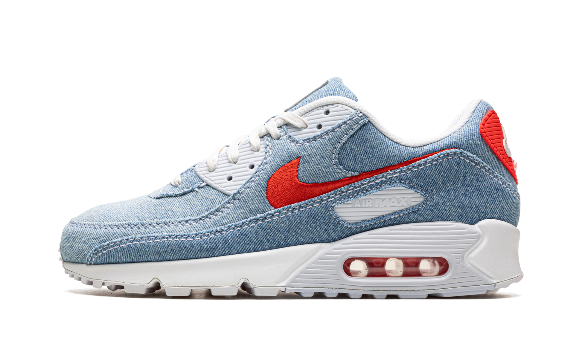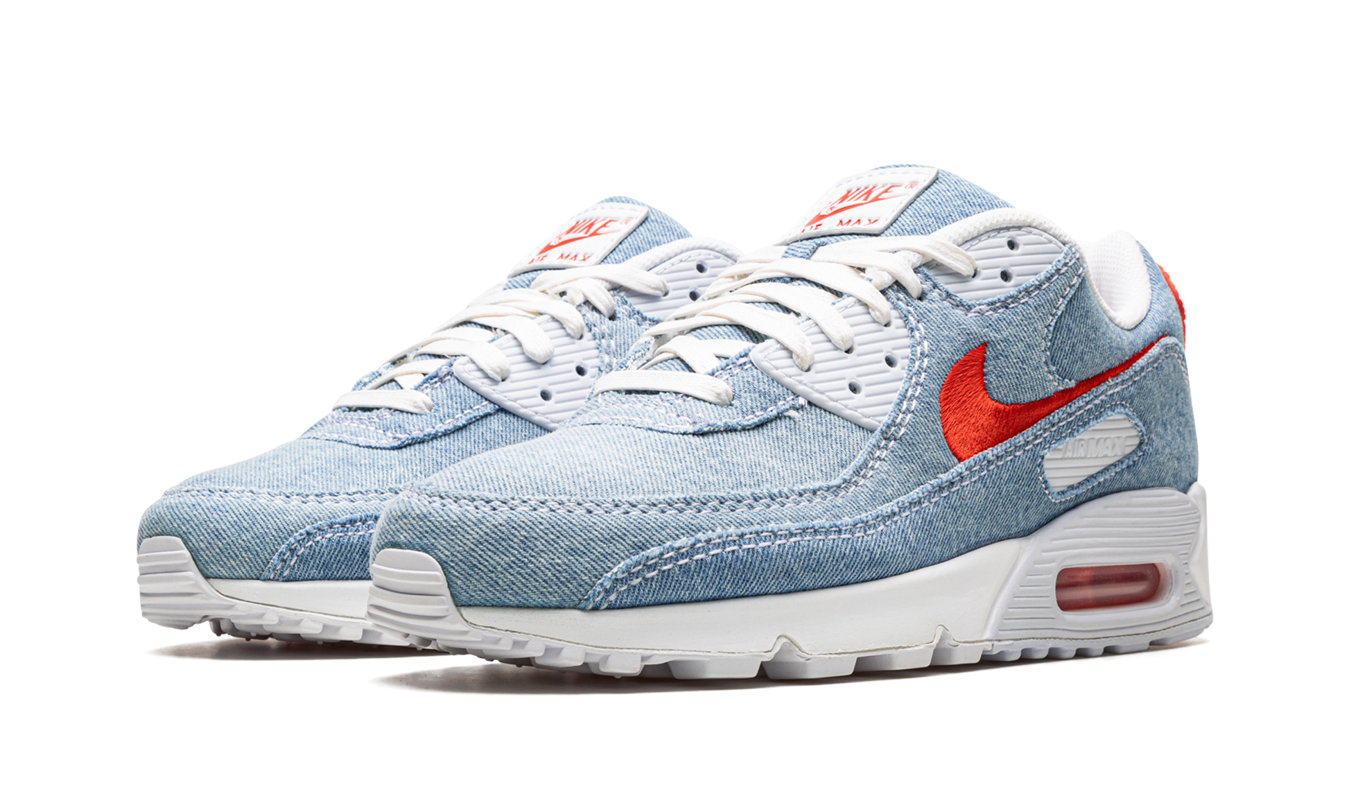 The Nike Air Max 90 “Light Wash Denimâ€?is a colorway of the retro running shoe that features a light wash denim construction. Perfect for any season. the Air Max 90 in the “Light Wash Denimâ€?makeup does away with the mesh-and-leather appearance of the shoe's original design in favor of a predominantly denim build. and the results are favorable. The upper features light wash denim throughout. including on the toe. mid-panel. heel. and mudguard. A fiery Habanero Red Swoosh is embroidered on the sides. and a red heel counter with “Nike Airâ€?branding is found on the back of the shoe. Additional branding elements include a white “Air Maxâ€?logo window on the lateral side of the heel. and red “Nike Air Maxâ€?and Swoosh detailing on the tongue tag. The shoe rides on a white foam midsole with a visible Air cushioning unit in the heel.