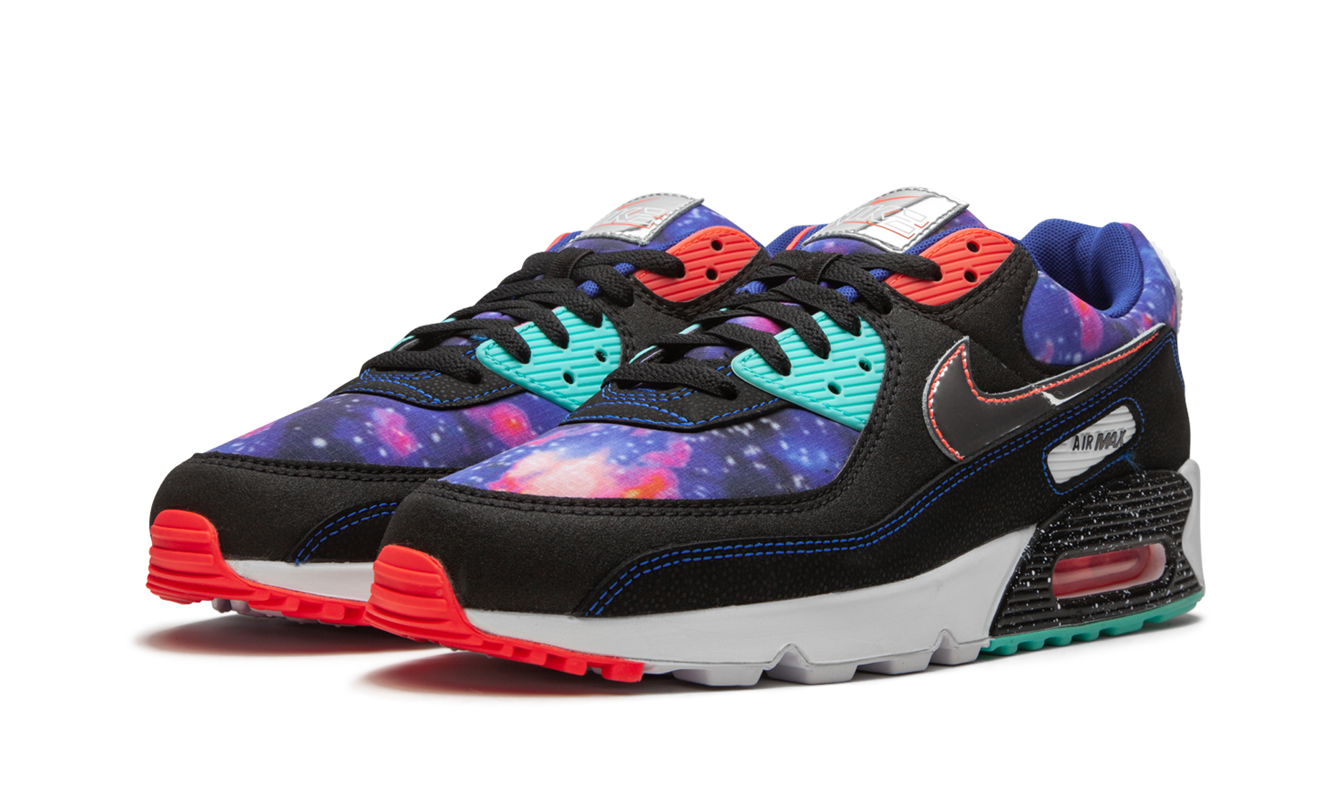 The Nike Air Max 90 “Supernova Galaxyâ€?is reminiscent of the outer space theme used on some Nike Basketball's most popular shoes from its “All-Starâ€?collection of 2012. Transferred over to the Air Max 90 in 2020. the “Supernova Galaxyâ€?colorway is clearly one of the boldest looks of any Air Max shoe. Neoprene material dressed in an intergalactic design appears on the toe and forefoot. as well as the collar and heel. A contrasting black mudguard and mid-panel overlay mimic the darkness of outer space. Nike places a Metallic Silver Swoosh with red accenting on the mid-panel. Additional design components include teal and red eyelet panels and a white rubber heel tab with black “Nike Airâ€?detailing. A speckled enclosure around the Air window in the heel finishes off the look. The Nike Air Max 90 “Supernova Galaxyâ€?was released on June 20. 2020.