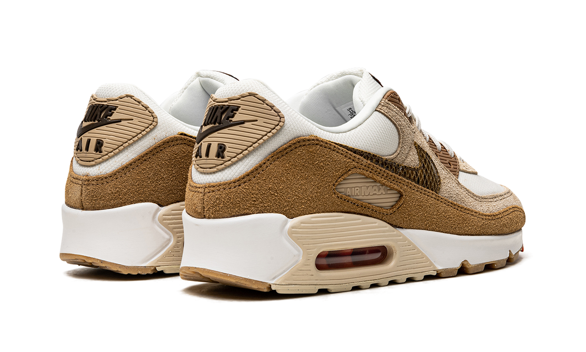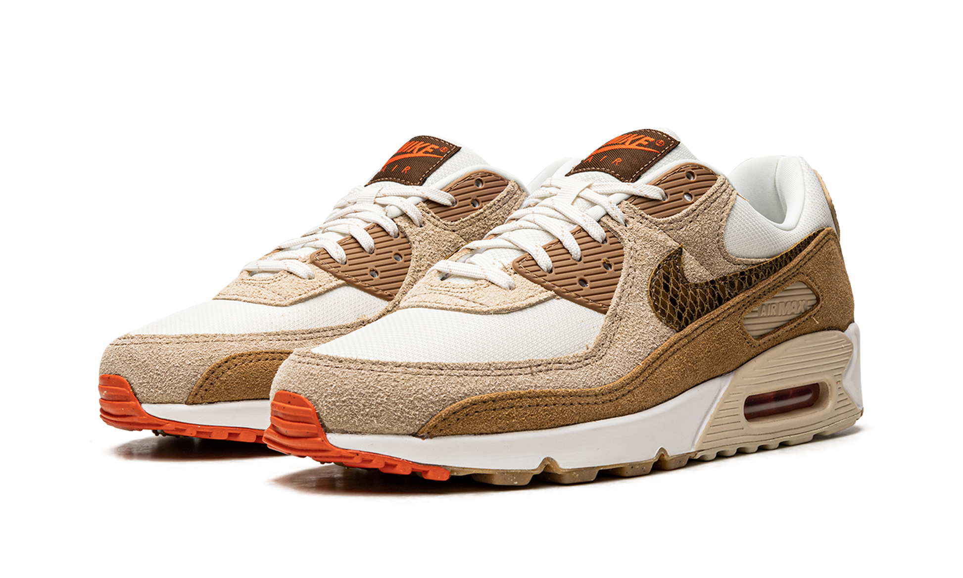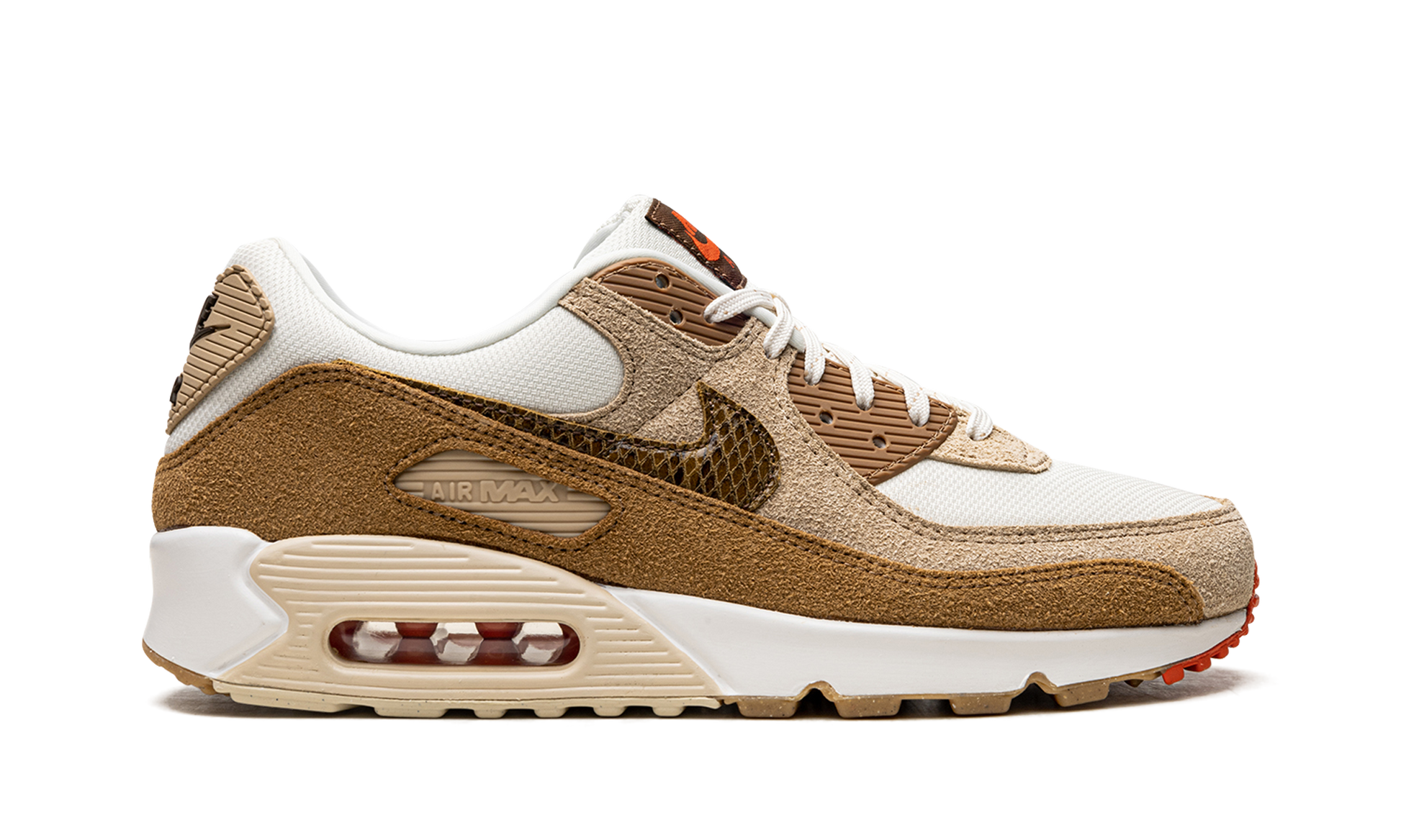 The Women's Nike Air Max 90 “Snakeskin Swooshâ€?is a women's-exclusive colorway of the classic running shoe that features earthy brown tones on its design. As its name suggests. the “Snakeskin Swooshâ€?modifies the look of the Air Max 90 by swapping its original Swoosh logo with one made from an exotic brown snakeskin pattern. A white mesh base forms the underlayer of the shoe while tan suede appears on the mid-panel and lower eyelets. Elsewhere. a hairy brown suede mudguard matches the brown plastic overlays on the upper eyelets and heel. A beige panel surrounds the visible Air cushioning unit in the heel of the white foam midsole. Release date: February 1. 2023