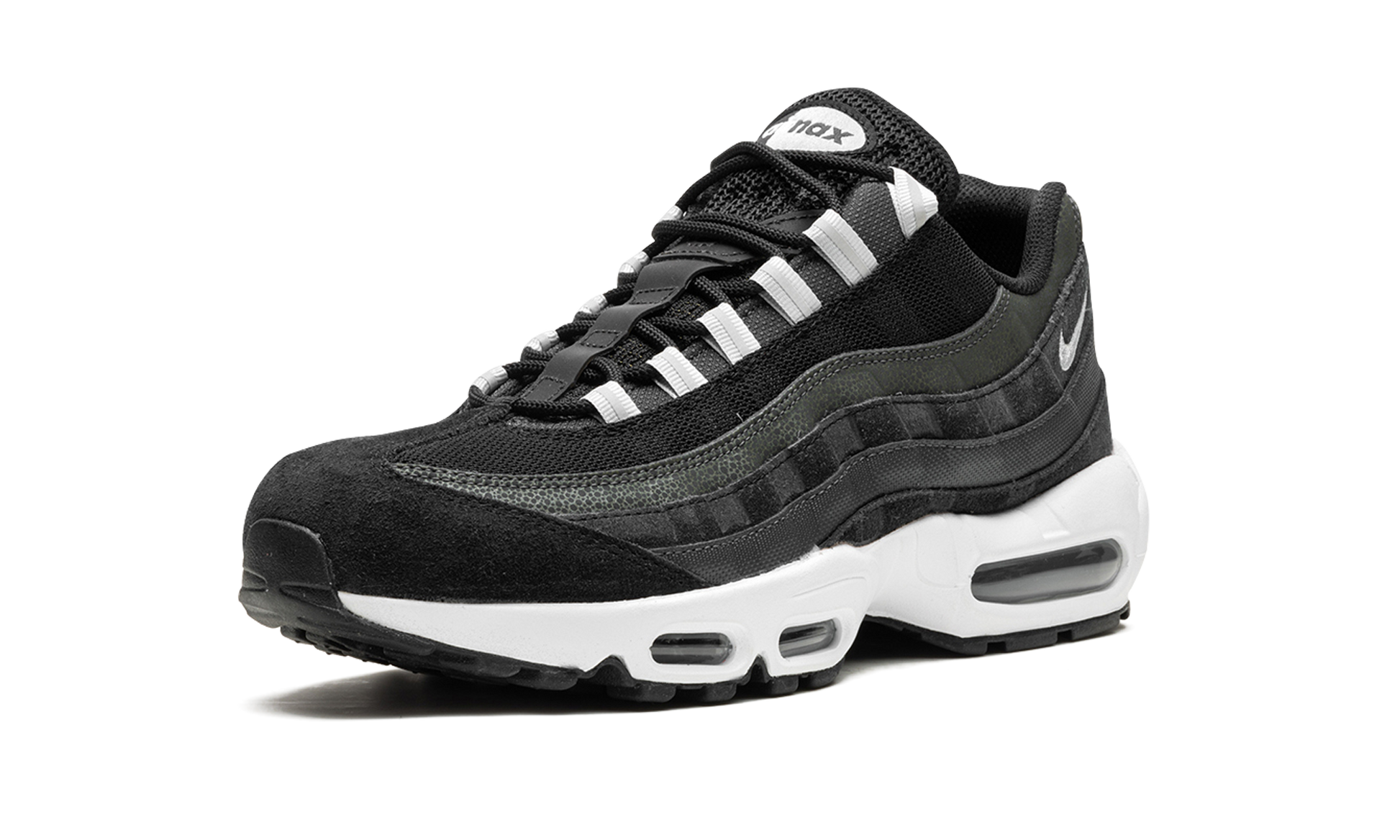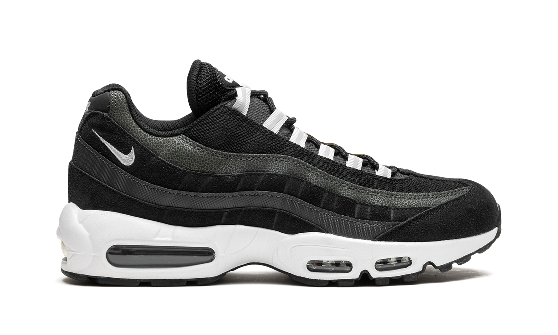 The Nike Air Max 95 "Black/Pure Platinum" is a black-and-grey colorway of the iconic retro sneaker. The Air Max 95 returns in a versatile “Black/Pure Platinumâ€?style that excels in wearability. The upper features a black mesh construction with a combination of safari-textured leather. suede. and synthetic leather for the wavy overlays on the sides. A tonal suede toe overlay adds to the shoe's shadowy look. Light grey lace loops with reflective silver detailing add contrast. A white foam midsole features visible Air cushioning pods. Release date: September 19. 2023