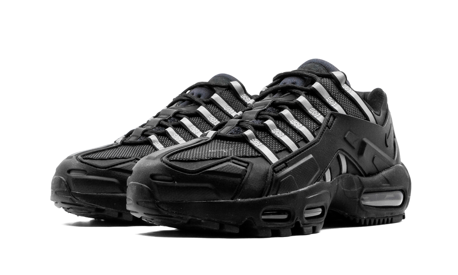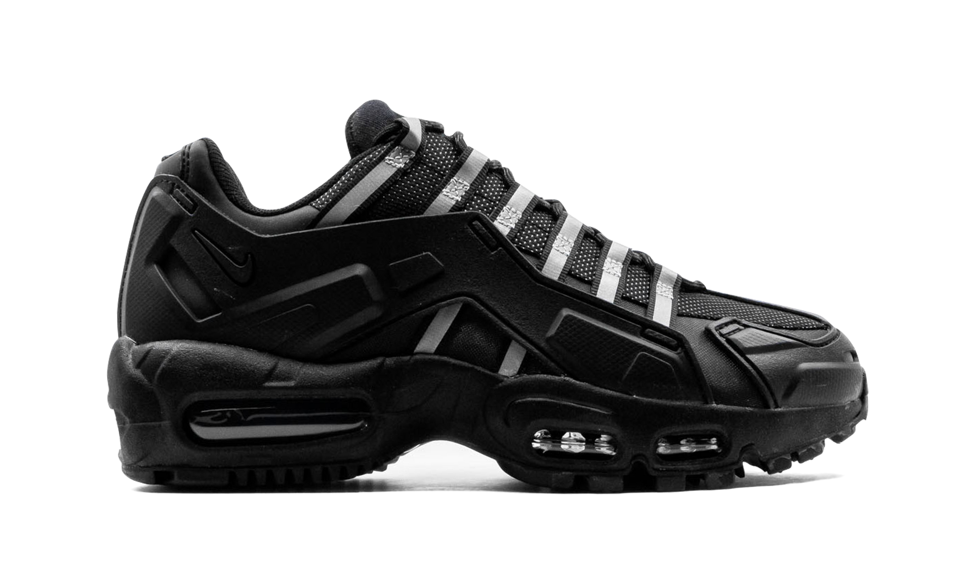 The Nike Air Max 95 NDSTRKT “Black/Reflectiveâ€?gives a rugged update to the ever-popular retro running shoe. A seminal model in Nike's Air Max collection. the Air Max 95 is recast as a boot-like sneaker under the NDSTRKT (pronounced “Indestructâ€? moniker. The design incorporates rubberized overlay panels. reinforced mesh. and leather. all new modifications to the design of the Air Max 95 that are built to last. The rubber overlays come into play along the mid-panel. on the toe. and on the heel. Silver reflective lace straps assist in supporting the lacing system and extend from the eyelets to the black rubber midsole. A stealthy black Swoosh is embroidered onto the heel and the model's original split Air Max logo is stitched onto the black tongue. Underfoot. the Air Max 95 NDSTRKT retains the look of the original Air Max 95's visible Air units in the forefoot and heel. Release date: February 15. 2021.