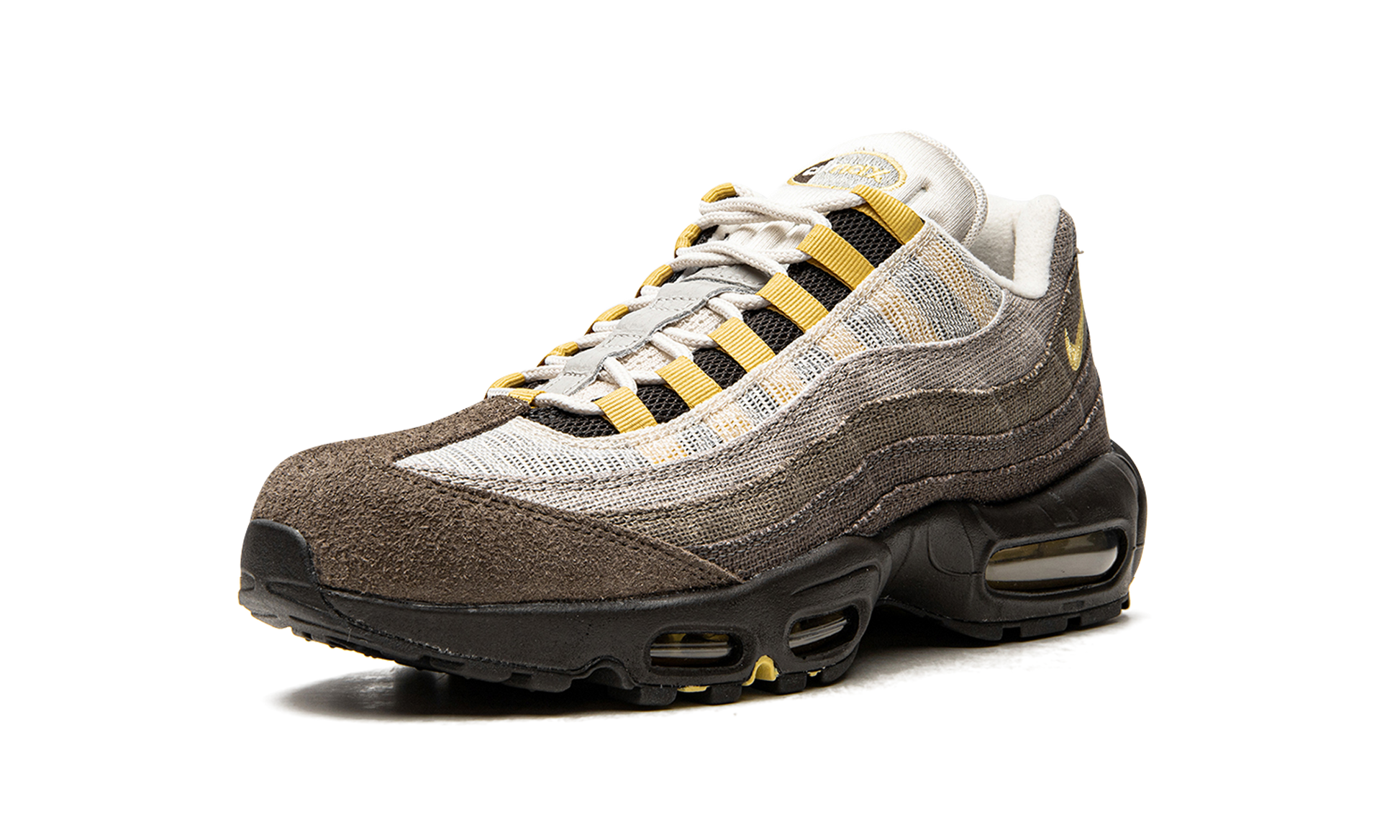 The Nike Air Max 95 NH “Ironstoneâ€?is a colorway of the classic performance running shoe constructed from sustainably sourced materials. The Air Max 95 NH “Ironstoneâ€?features natural hemp material on its design. a departure from the model's original mesh and suede construction. More specifically. the shoe's gradient mesh upper. which appears in light brown and transitions to dark brown near the midsole. is made from hemp. A gold Swoosh logo is embroidered on the collar. Additional gold accenting is found on the nylon lace loops on the black mesh overlay around the tongue. and on the split “Air Maxâ€?logo on the tongue. The black rubber midsole features visible Air cushioning that provides the wearer with a comfortable ride. Release date: February 9. 2022
