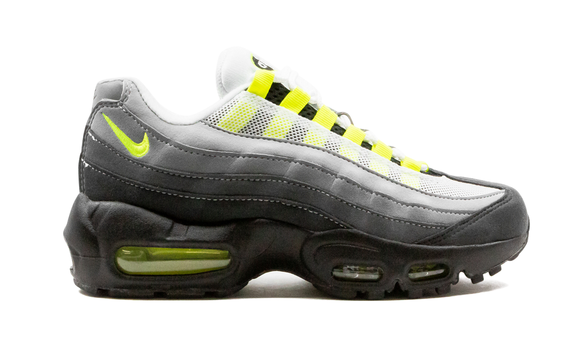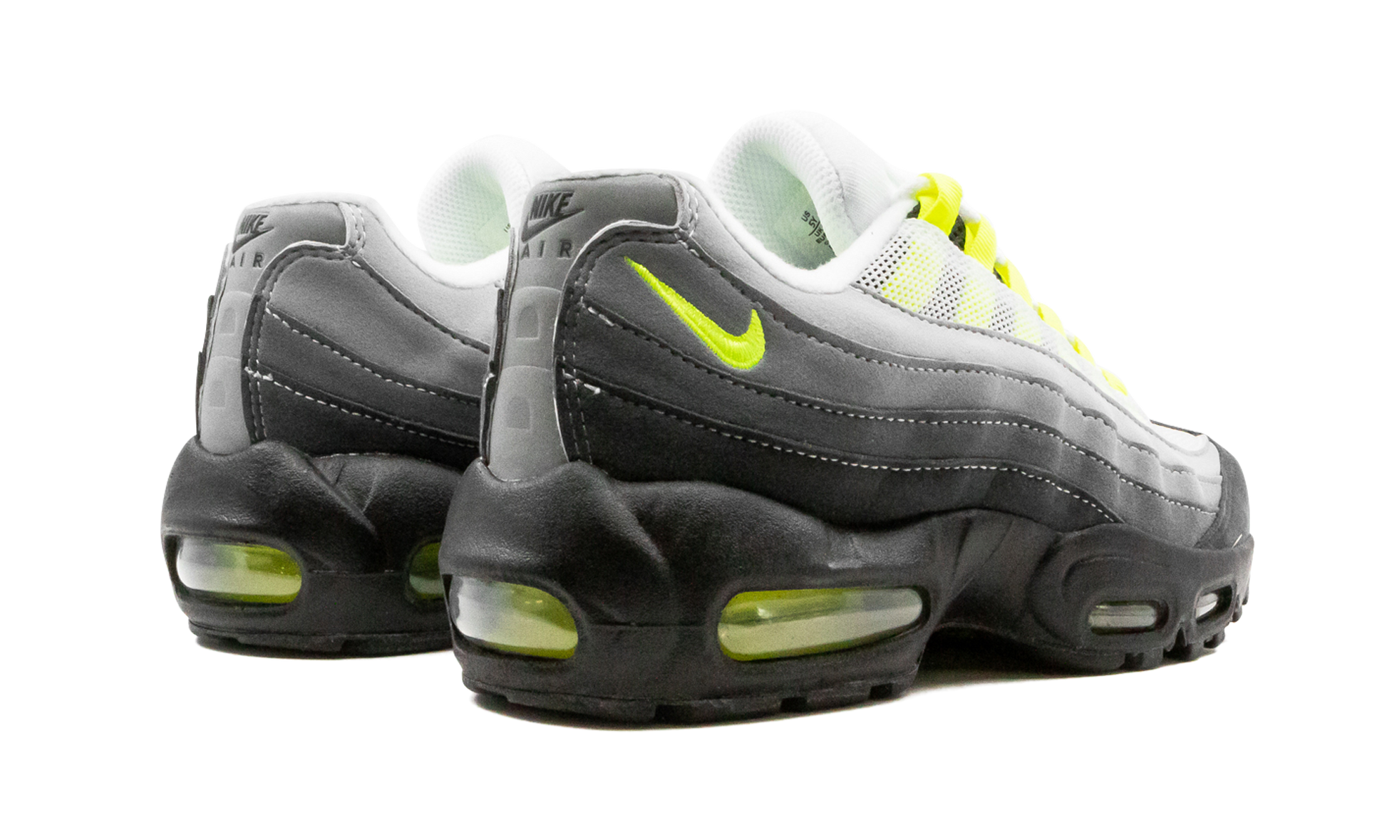 The Nike Air Max 95 GS “Neonâ€?is the youth sizing of the iconic original colorway of the retro runner by Nike. The legendary Air Max 95 “Neonâ€?returned in December 2020 as part of Nike's dedication to bringing back some of its greatest Air Max models in original looks. The 2020 version of the shoe features many of the same “OGâ€?design details as the pair from the '90s. White mesh can be found around the eyelets and a gradient light-to-dark grey suede design appears on either side. Neon accenting appears on the Swoosh embroidery on the heel. on the split “Air Maxâ€?logo on the tongue. and inside of the visible Air unit in the heel of the black rubber midsole. Reflective material is located on the tongue. Release date: December 17. 2020.