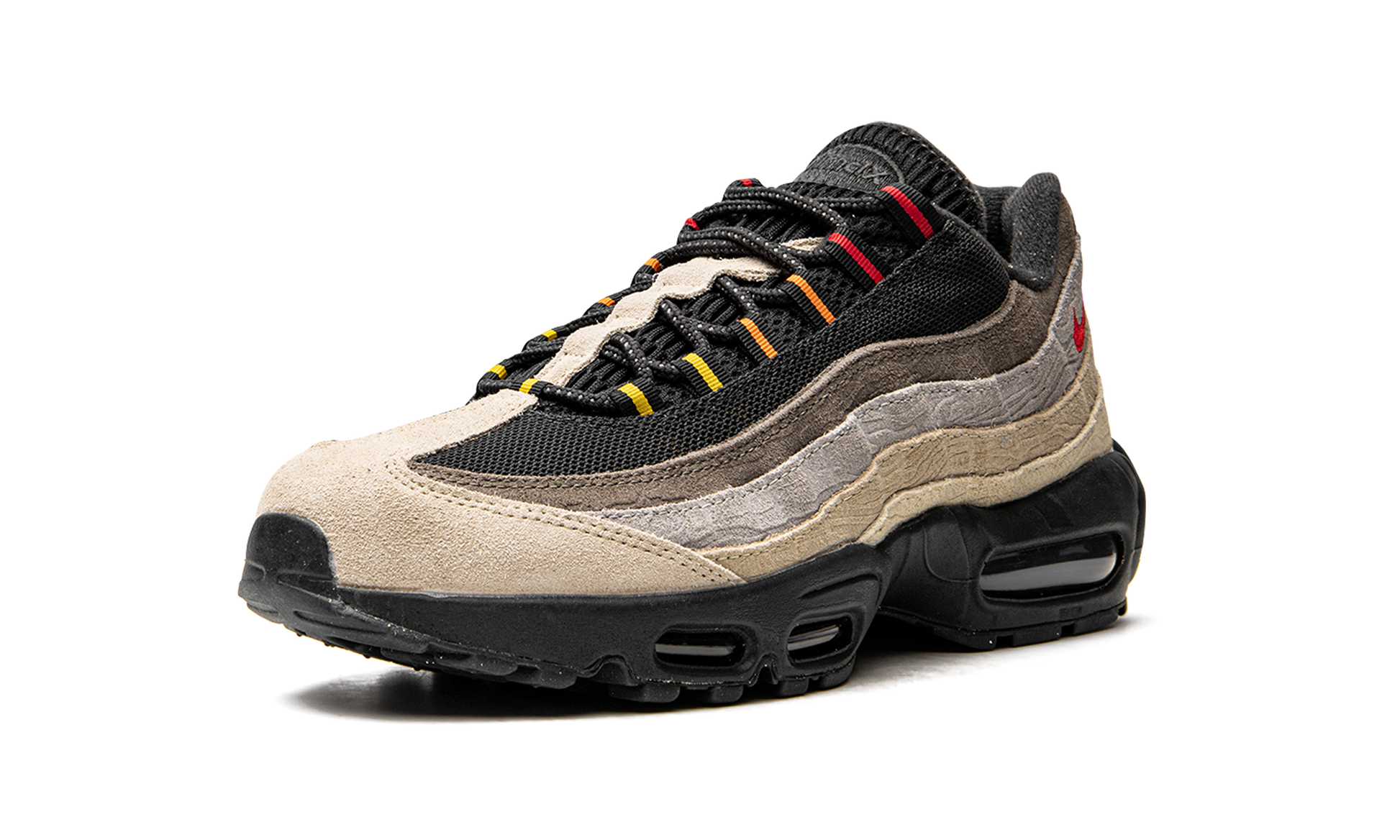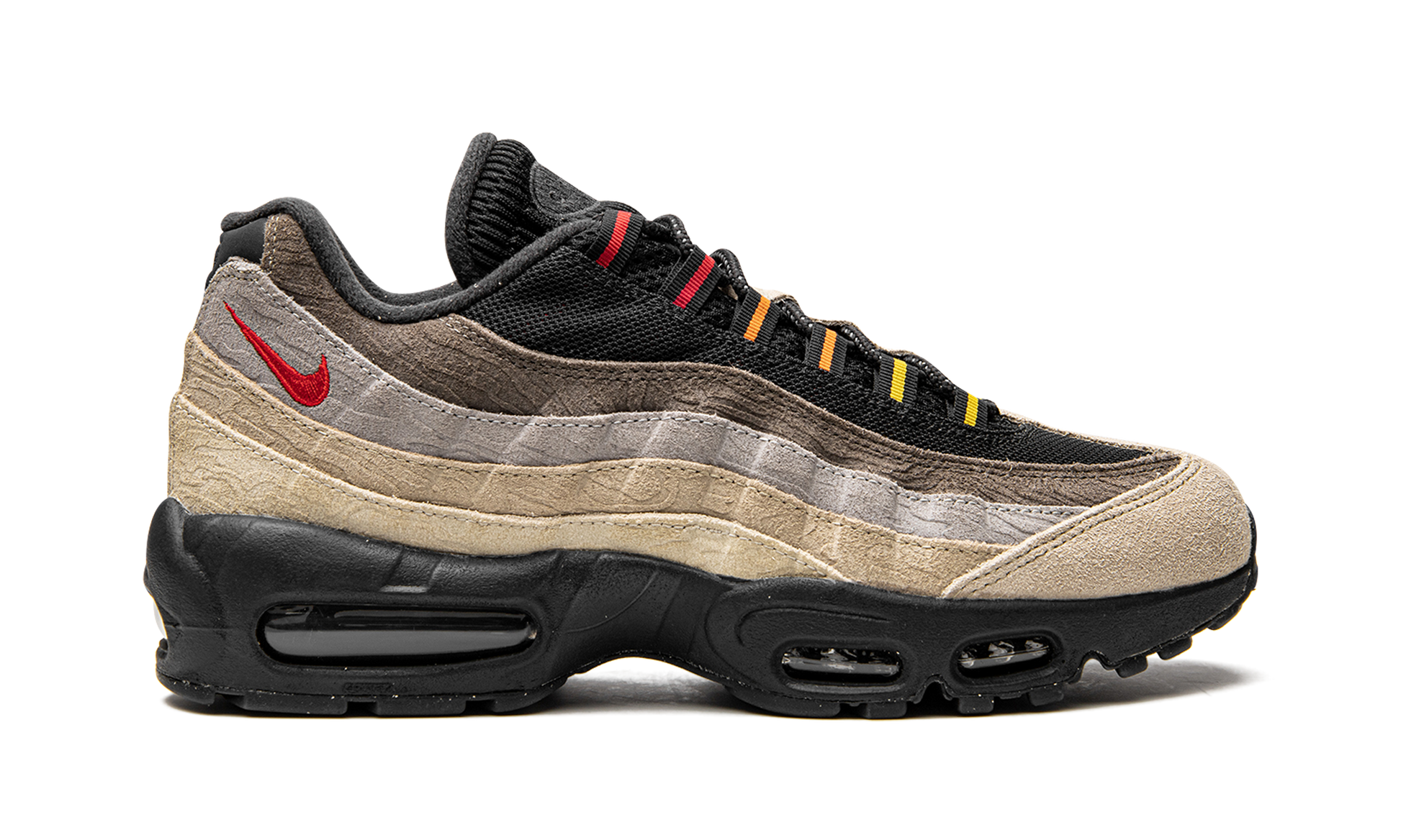 The Nike Air Max 95 “Topographicâ€?is a colorway of the retro running shoe inspired by nature. The Air Max 95 was originally released in 1995. and is one of the most popular shoes in Nike's history. On the “Topographic.â€?the design features various tan-colored wavy panels that give the shoe a nature-inspired vibe. Each panel features a subtle topographic pattern incorporated into its design. A small red Swoosh is found on the collar. and gradient yellow. orange. and red accenting appears on the eyelet loops. The black mesh tongue features an embroidered patch with tonal “Air Maxâ€?branding. Underfoot. a black foam midsole with visible Max Air units in the forefoot and heel completes the look. Release date: July 29. 2022