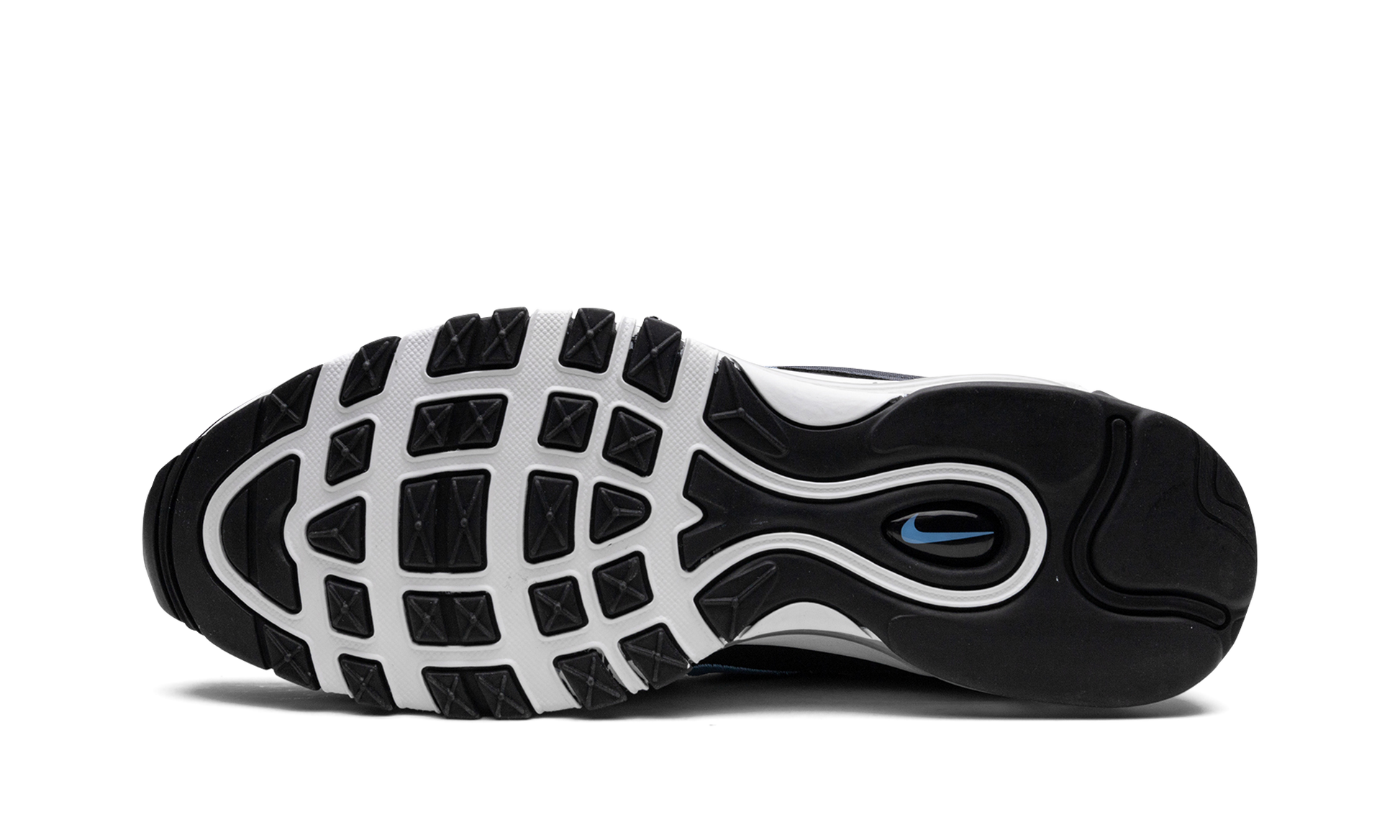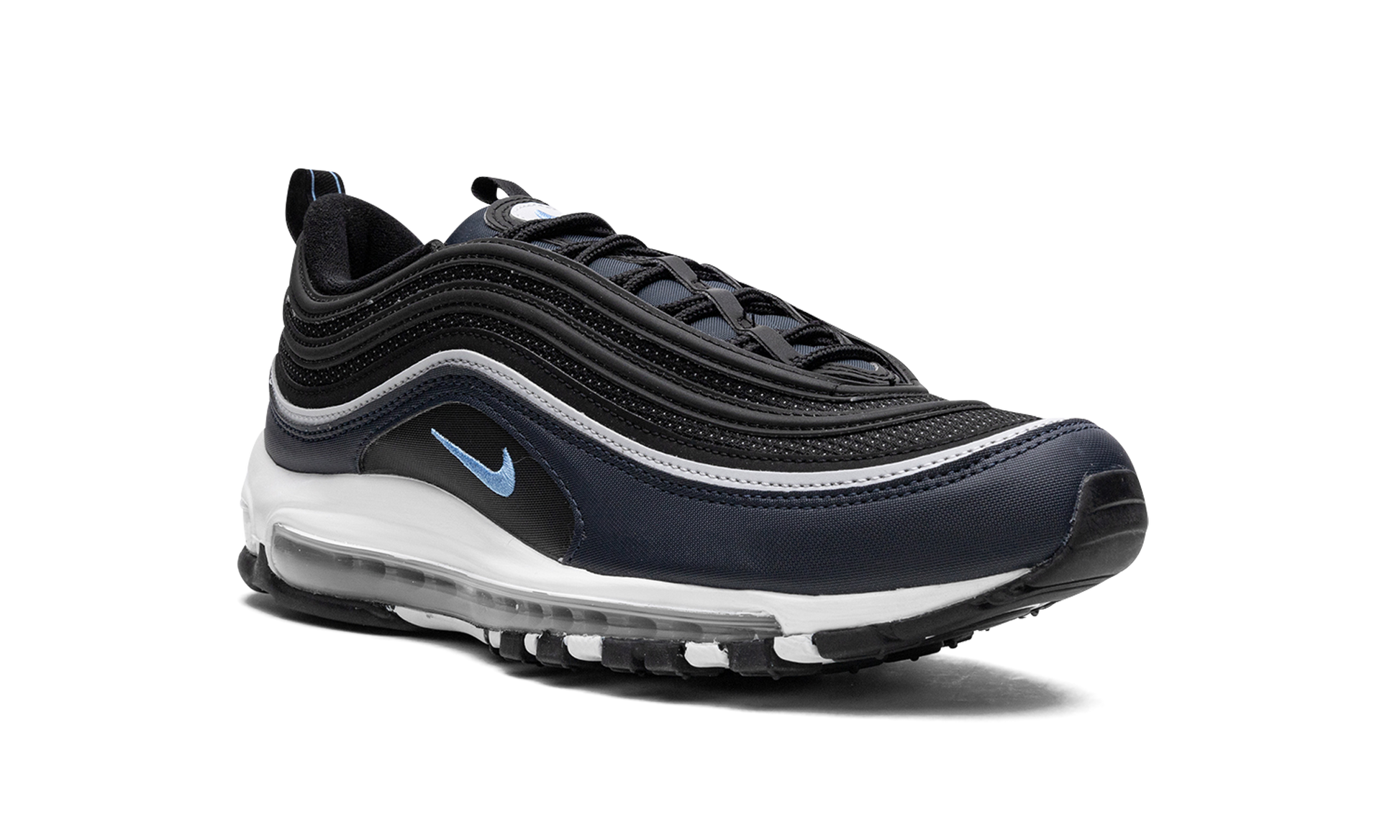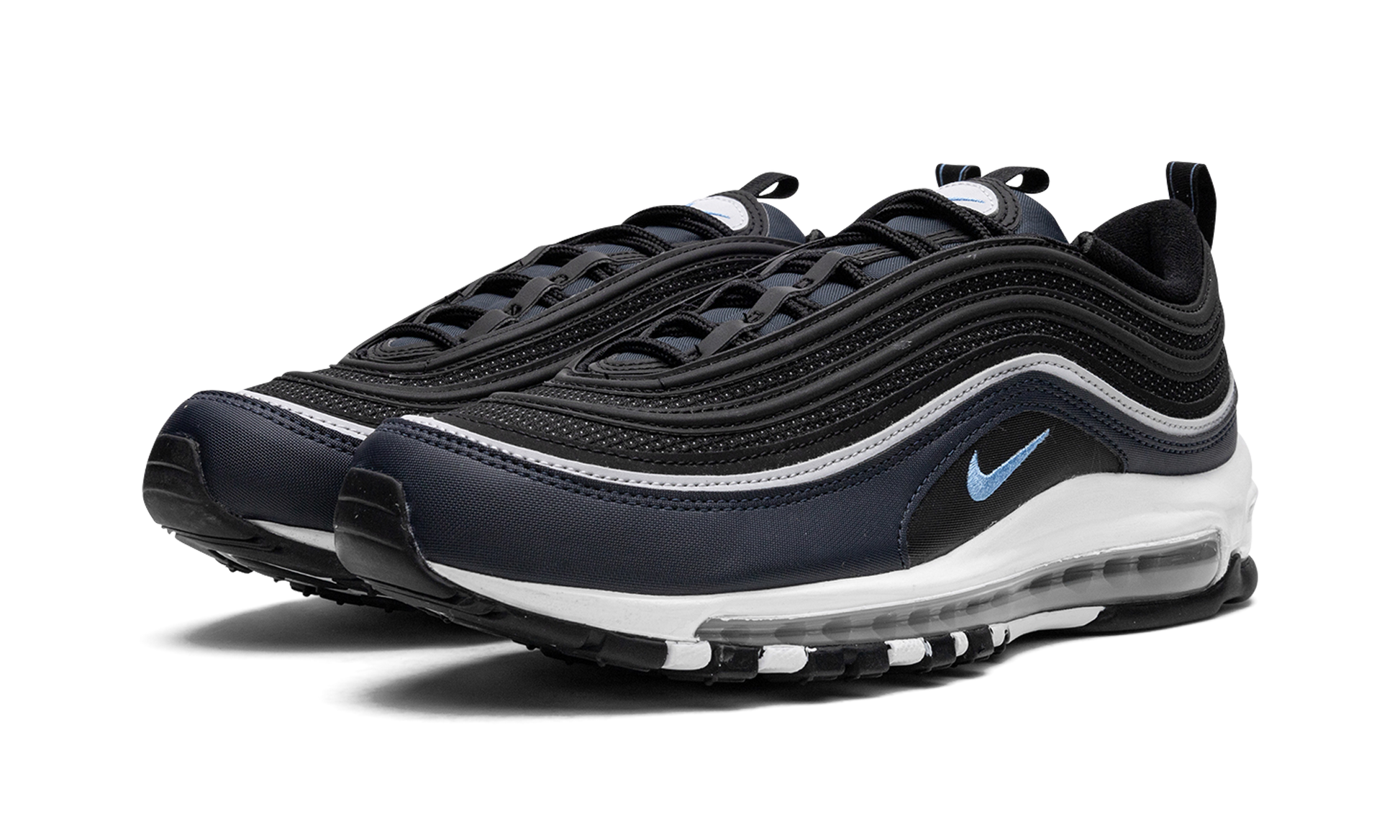 The Nike Air Max 97 “Dark Obsidianâ€?is a colorway of the retro performance running sneaker with dark blue accents. A Spring 2023 release. the “Dark Obsidianâ€?features a black mesh base with Dark Obsidian. or dark navy. on the mudguard. The Air Max 97's wavy overlays appear in a gradient color scheme that goes from grey to black to blue. A University Blue Swoosh is embroidered on either side. The white foam midsole features a full-length visible Max Air cushioning unit.