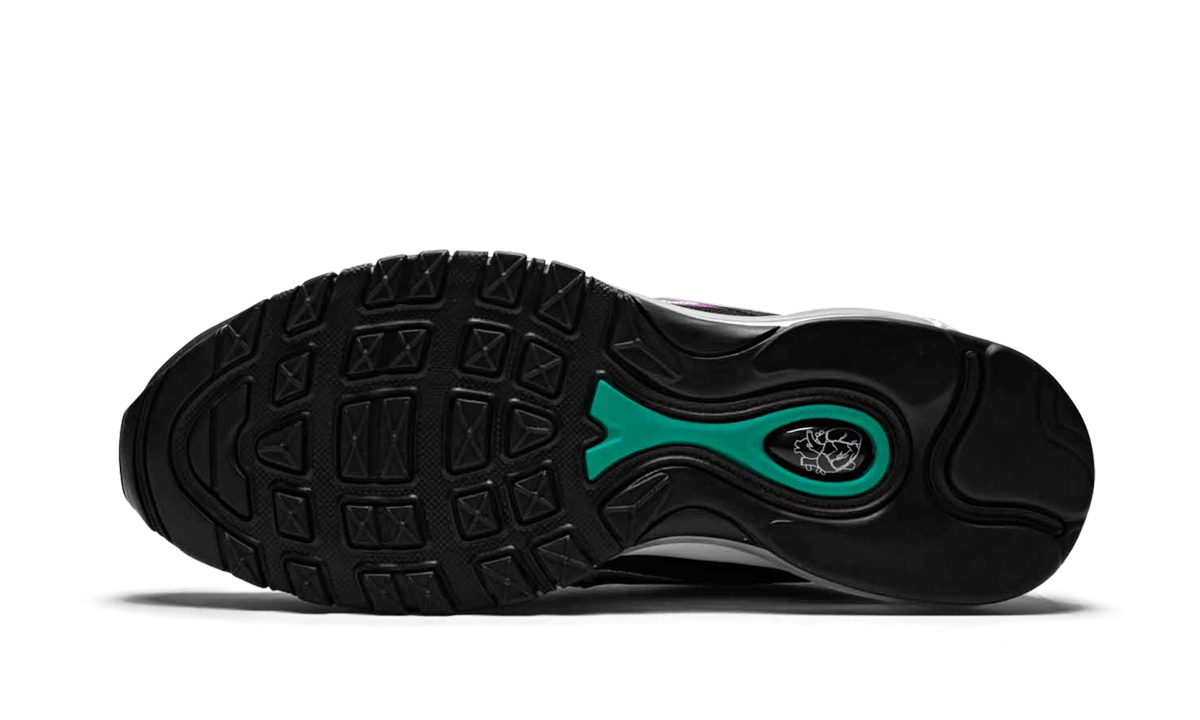 The Nike Air Max 97 DB was originally released in December 2018 as part of the brand's annual Doernbecher Freestyle collection to benefit the OHSU Doernbecher Children's Hospital in Portland. Oregon. It was designed by 16-year old Kirsten Brown. A black mesh and textured leather upper features translucent overlays. "SRVVR" is written in large purple lettering on each side panel. "Survivor" is also written in teal on each heel tab. Other special markings that allude to Brown surviving heart transplant surgery include green and red ribbons on each outsole to represent heart transplant and stroke awareness. the date of her surgery. and EKG readings on the insoles.