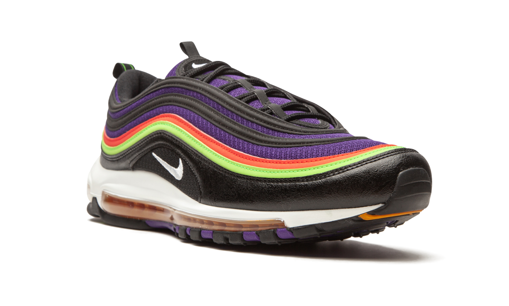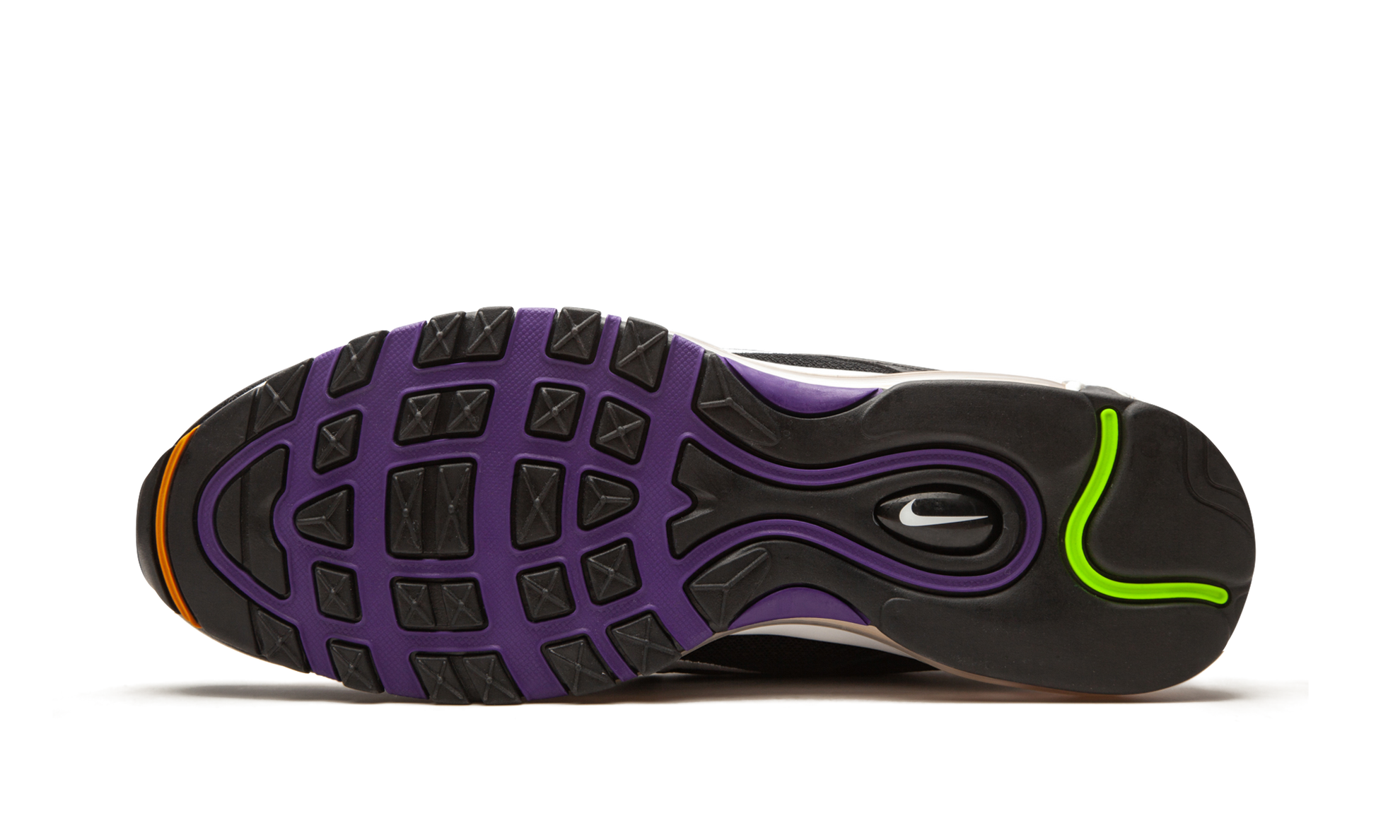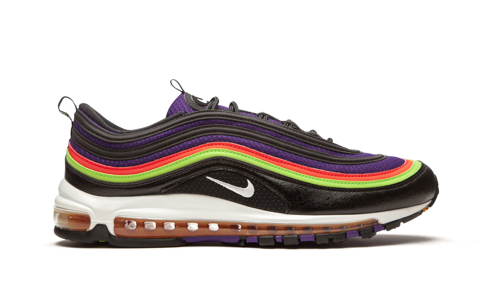 The Nike Air Max 97 "Joker" was released in December 2019. and the iconic silhouette takes on a colorway compared to the wardrobe of the famous super villain. The Joker. As we've seen on many Air Max 97 models. the lightweight upper keeps its knitted fabrication with reflective hits lining the wavy overlays. Purple and black cover the foundation of the color scheme. while highlights of lime green and red help present the Joker-like aesthetic. More of the same colors transition into the outsole as well as the full-length Air Zoom unit.