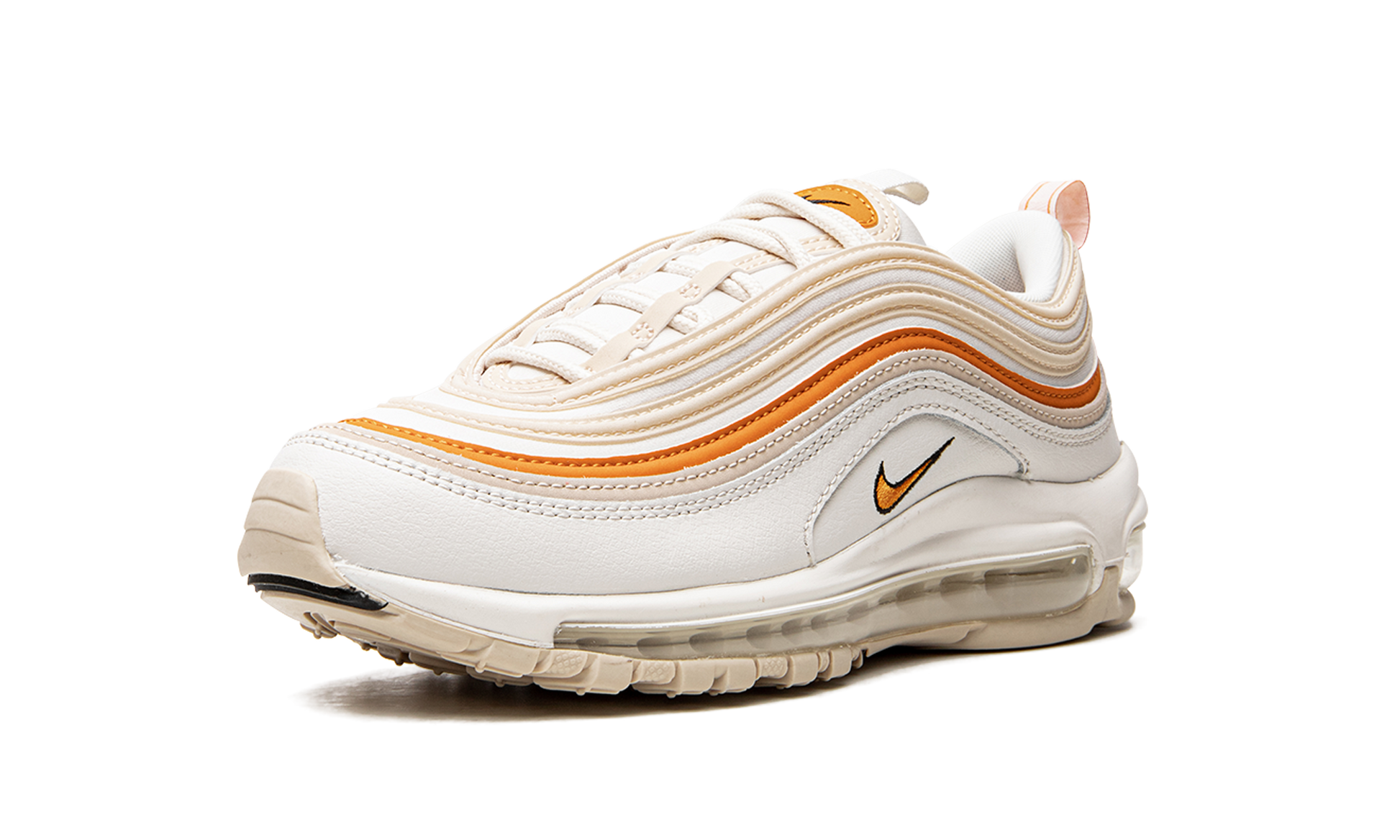 The Women's Nike Air Max 97 “Phantom/Light Curryâ€?is a women's-exclusive colorway of the vintage performance running shoe with an autumn-inspired appearance. A clean look for the popular Air Max 97. the “Phantom/Light Curryâ€?features a white leather upper with tonal. cream. and Light Curry-colored leather overlays in a wavy design that wrap around the shoe. A small orange embroidered Swoosh appears on either side of the shoe above the white foam midsole. Additional orange accenting can be found on the “Air Maxâ€?branding on the nylon heel tab and on the overlay on the tongue with black Swoosh detailing. A full-length visible Max Air cushioning system is found in the midsole and completes the look. Release date: May 7. 2022
