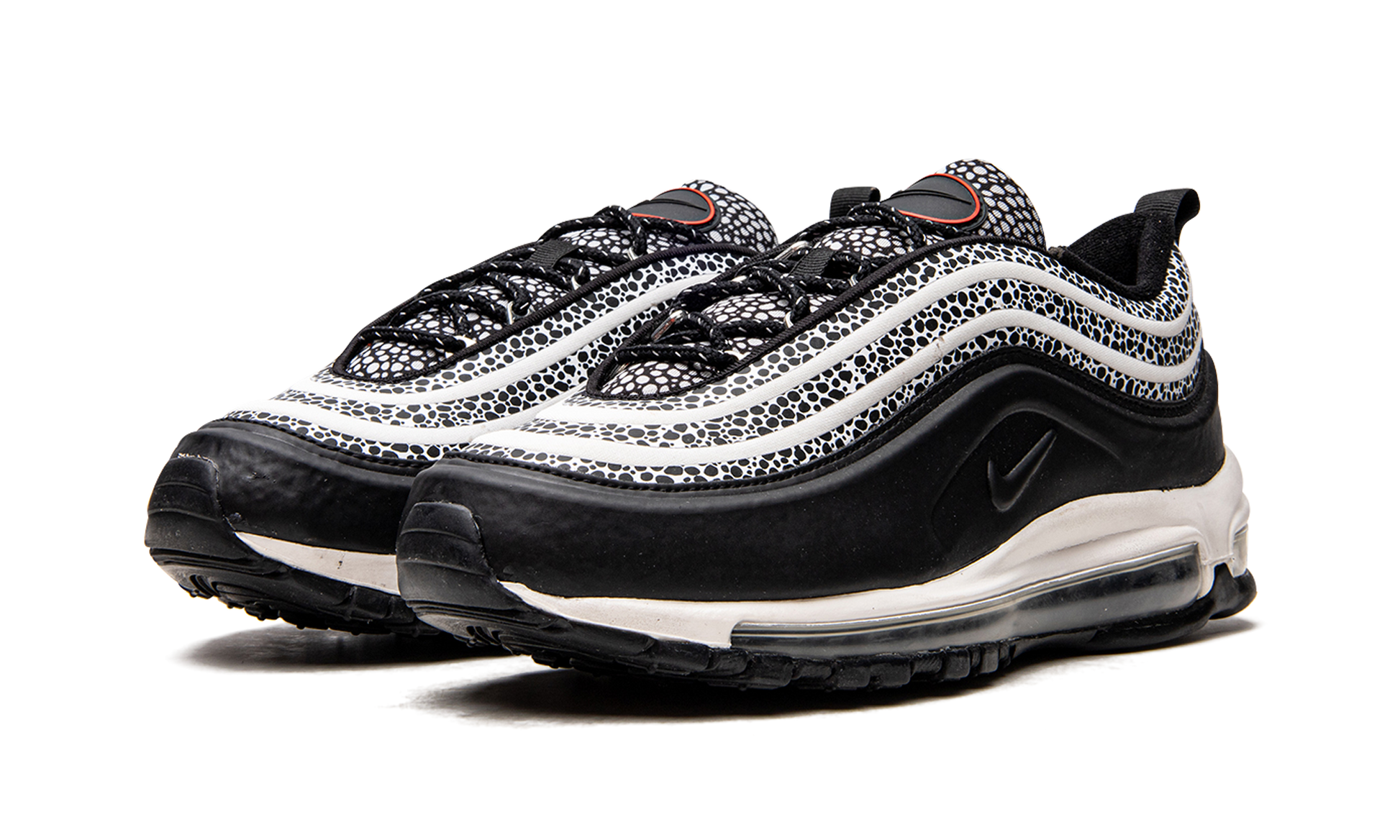 The Women's Nike Air Max 97 “Safariâ€?brings a wild. head-turning look to the classic running shoe. This Air Max 97 features a flashy black-and-white safari print that constitutes much of the upper and insoles. The leather and/or mesh that is usually present on the mudguard is replaced with a rubbery black material. which is complemented with a subtle hit of red to the tongue and reflective flair on the laces. Underneath sits the full-length Air Max unit that the Air Max 97 is famous for.