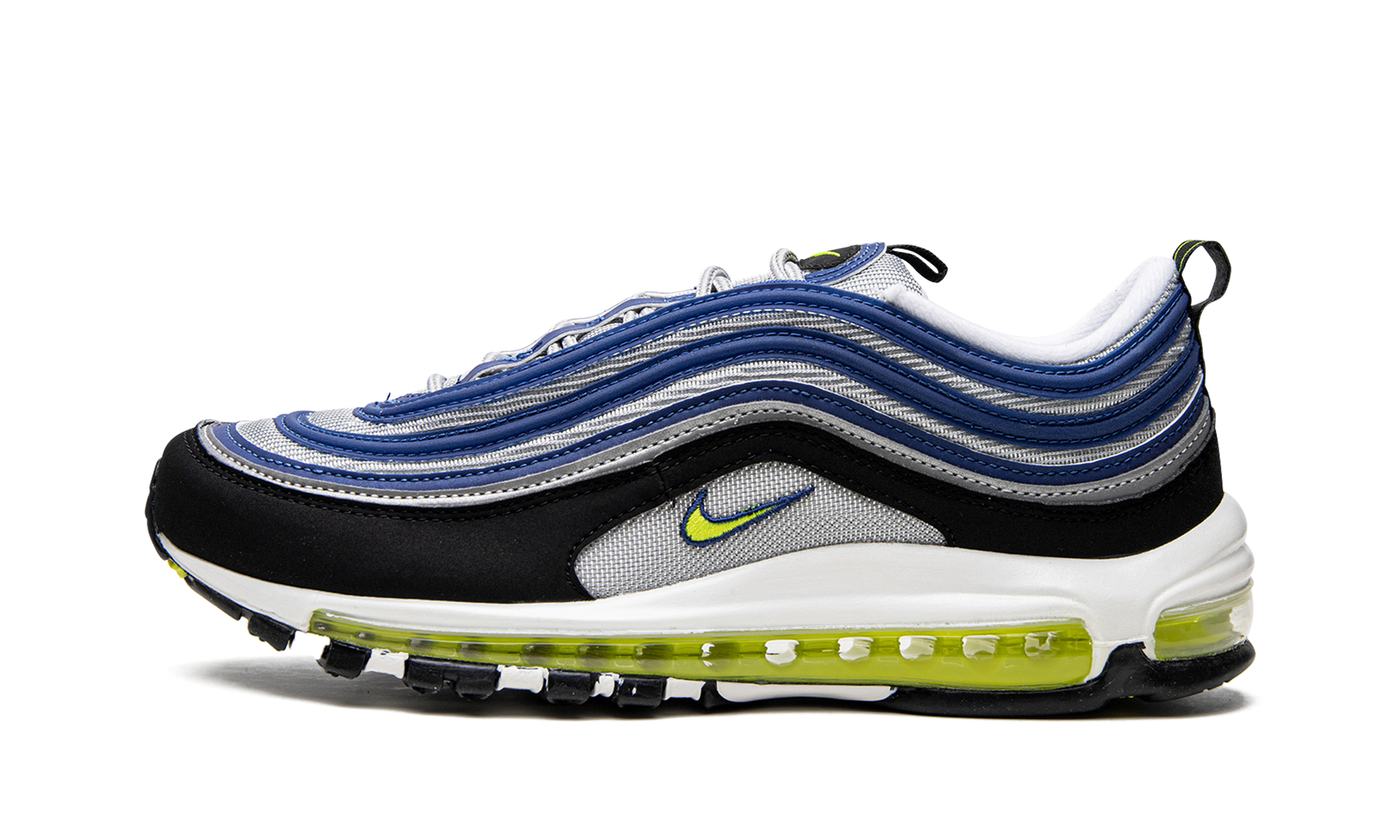 The Nike Air Max 97 “Atlantic Blue/Voltage Yellowâ€?is a colorway of the retro performance running shoe that combines its original “Atlantic Blueâ€?and “Neonâ€?colorways. In 2017. Nike reissued the Air Max 97's “Atlantic Blueâ€?and “Neonâ€?colorways for the models 20th anniversary. and here. the Swoosh combines both classic styles into one cohesive colorway for the shoe's 25th anniversary. The “Atlantic Blue/Voltage Yellowâ€?has blue reflective leather panels layered over a Metallic Silver mesh base on the upper. A black mudguard contrasts the look. A Voltage Yellow Swoosh is embroidered on either side above the white foam midsole. Additional neon yellow accents can be found on the Swoosh on the tongue and on the black nylon heel tab. The full-length visible Air cushioning system within the white foam midsole is consistent with the original design of the Air Max 97. Release date: August 23. 2022