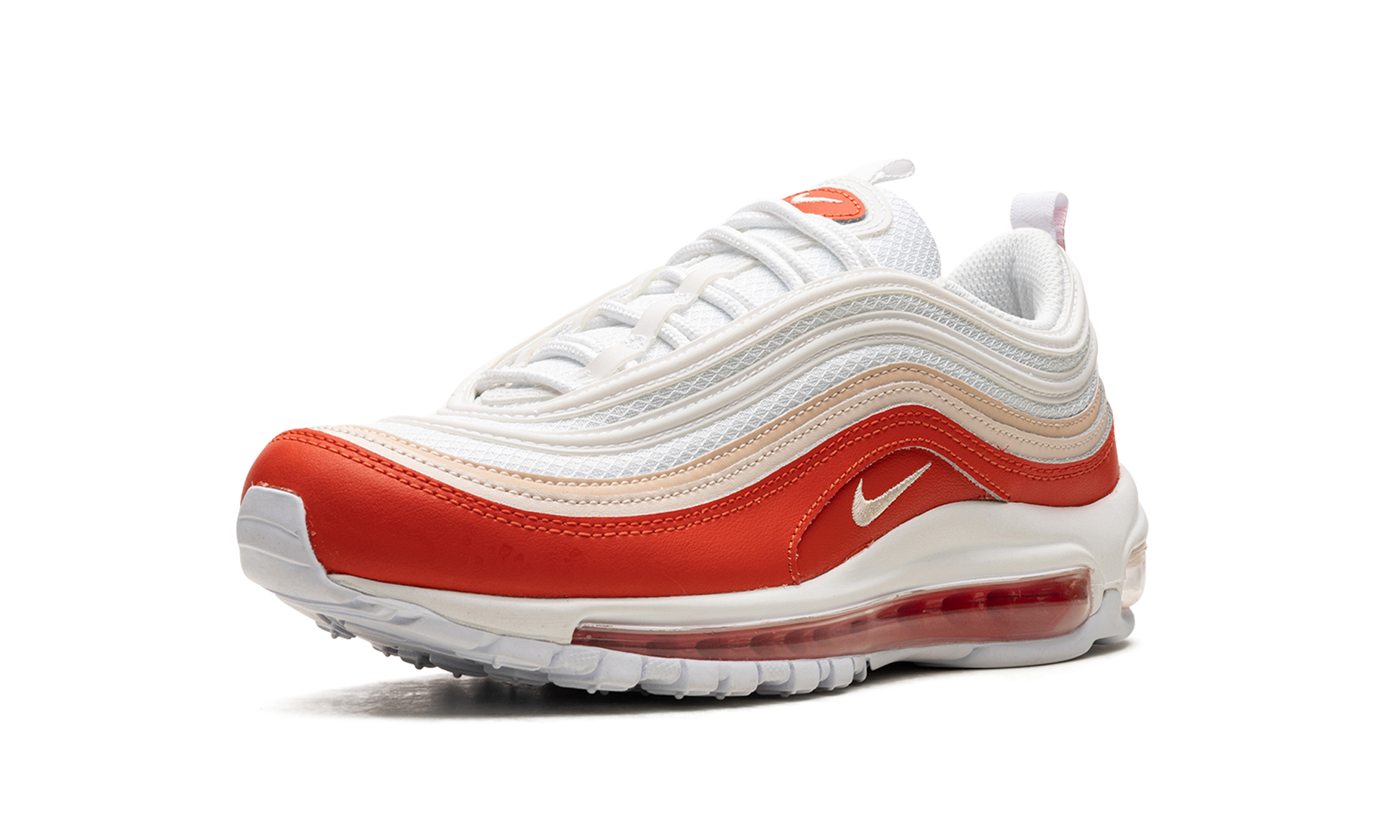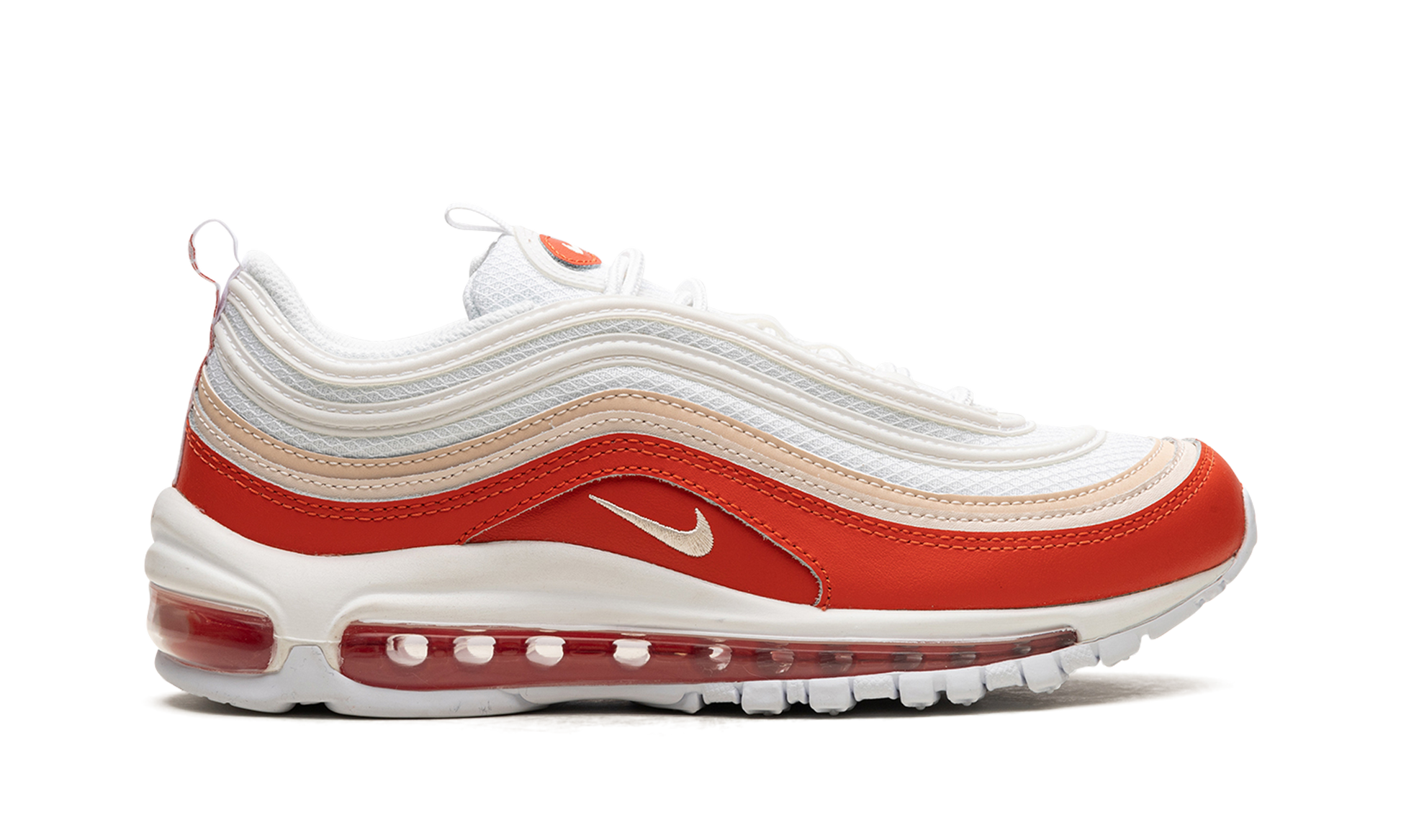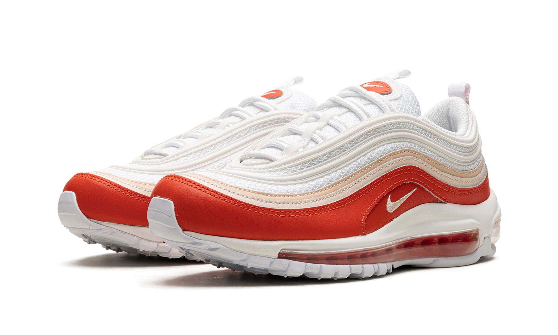 The Nike Air Max 97 "Picante Red" is a colorway of the retro performance running shoe with vibrant red accents. The colorway features a white mesh construction with a Picante Red-colored mudguard. Guava Ice leather overlays are found above the red leather accenting. A small white Swoosh is embroidered on the sides and on the circular red overlay on the tongue. Pull tabs on the tongue and heel assist with easy on/off wearability. Underfoot. a red-tinted visible Air cushioned midsole completes the look. Release date: July 22. 2023
